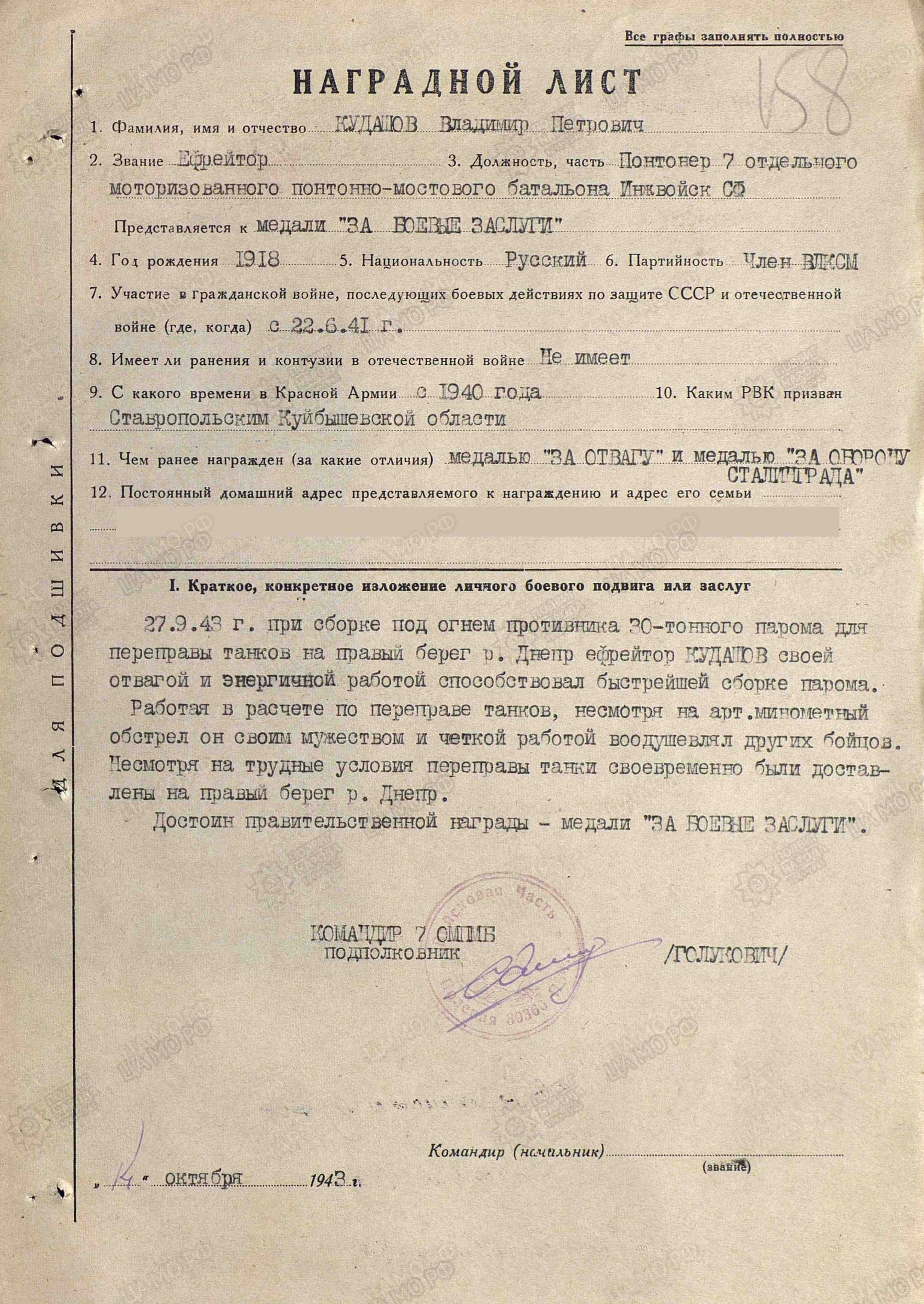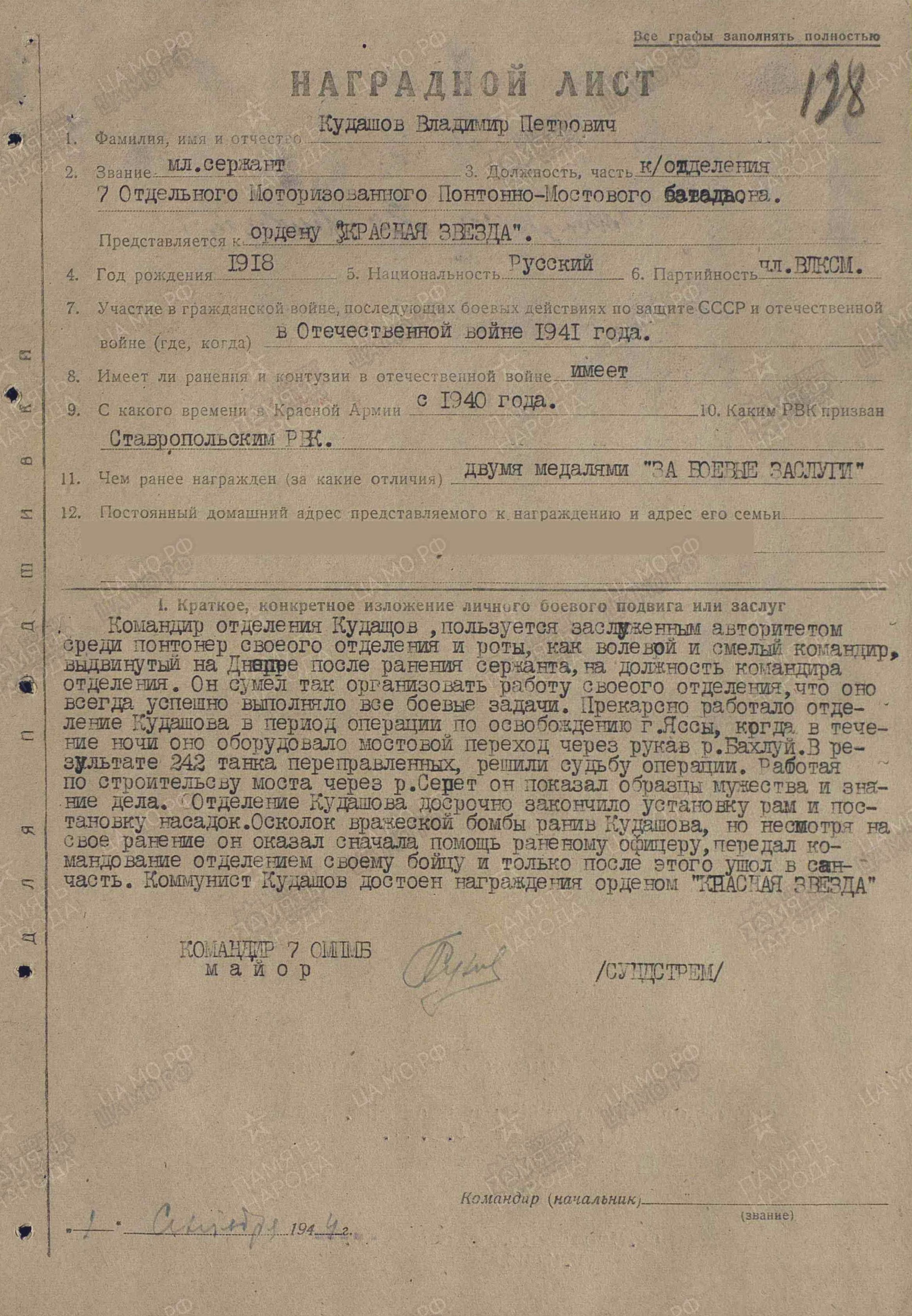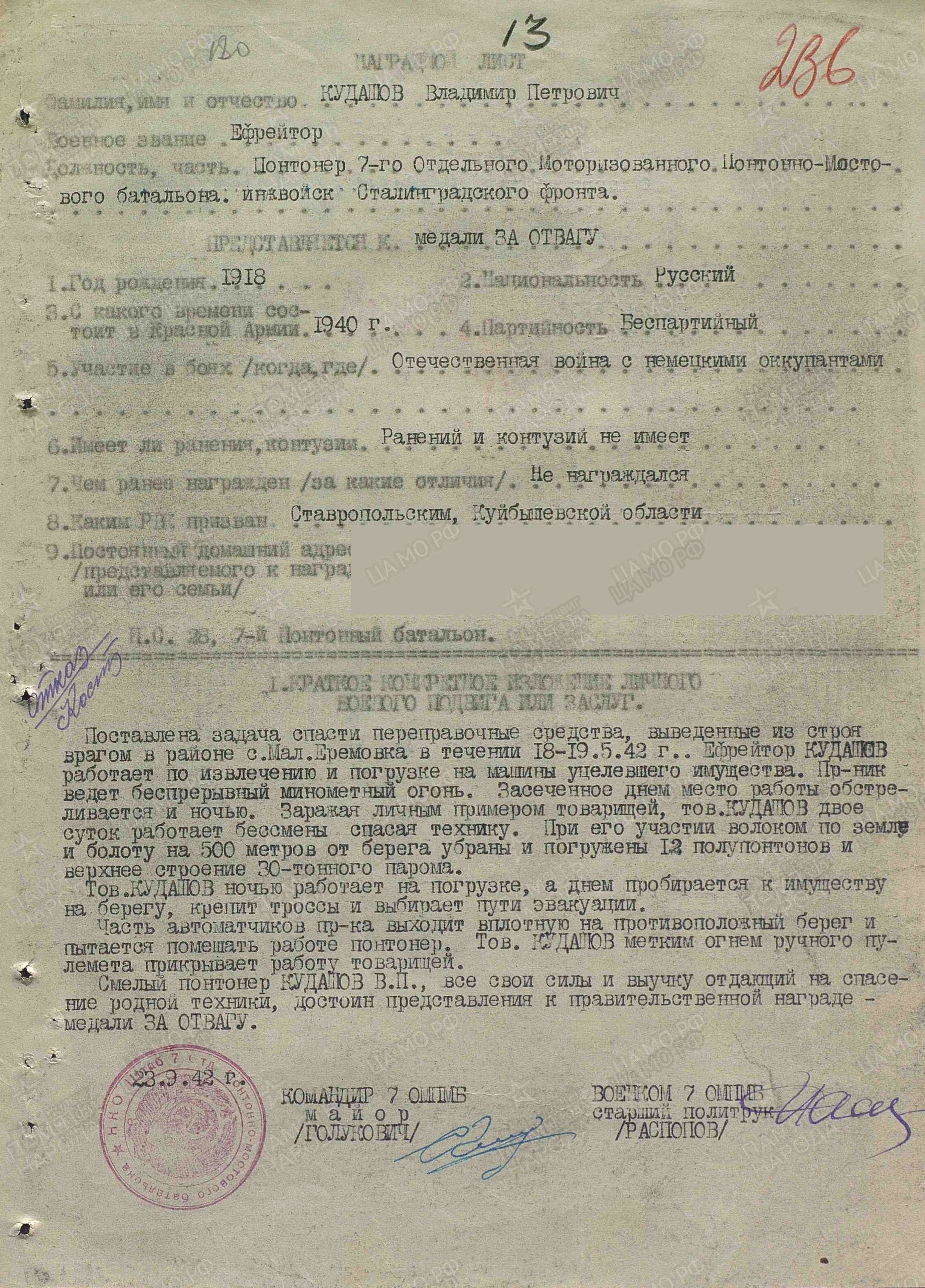 Поставлена задача спасти переправочные средства, выведенные из строя врагом в районе с. Малая Еремовка в течение 18-19 мая 1942 г. Ефрейтор Кудашов работает по извлечению и погрузке на машины уцелевшего имущества. Противник ведет беспрерывный минометный огонь. Засеченное днем место работы обстреливается и ночью. Заражая личным примером товарищей, тов. Кудашов двое суток работает без смены, спасая технику. При его участии волоком по земле и болоту на 500 метров от берега убраны и погружены 12 полупонтонов и верхнее строение 30-тонного парома. Тов. Кудашов ночью работает на погрузке, а днем пробирается к имуществу на берегу, крепит тросы и выбирает пути эвакуации. Часть автоматчиков противника выходит вплотную на противоположный берег и пытается помешать работе понтонер. Тов. Кудашов метким огнем ручного пулемета прикрывает работу товарищей. Смелый понтонер Кудашов В.П., все свои силы и выучку отдающий на спасение родной техники, достоин представления к правительственной награде – медали «За отвагу» (награжден медалью «За боевые заслуги»; наградной лист от 23.09.1942 г.). 2