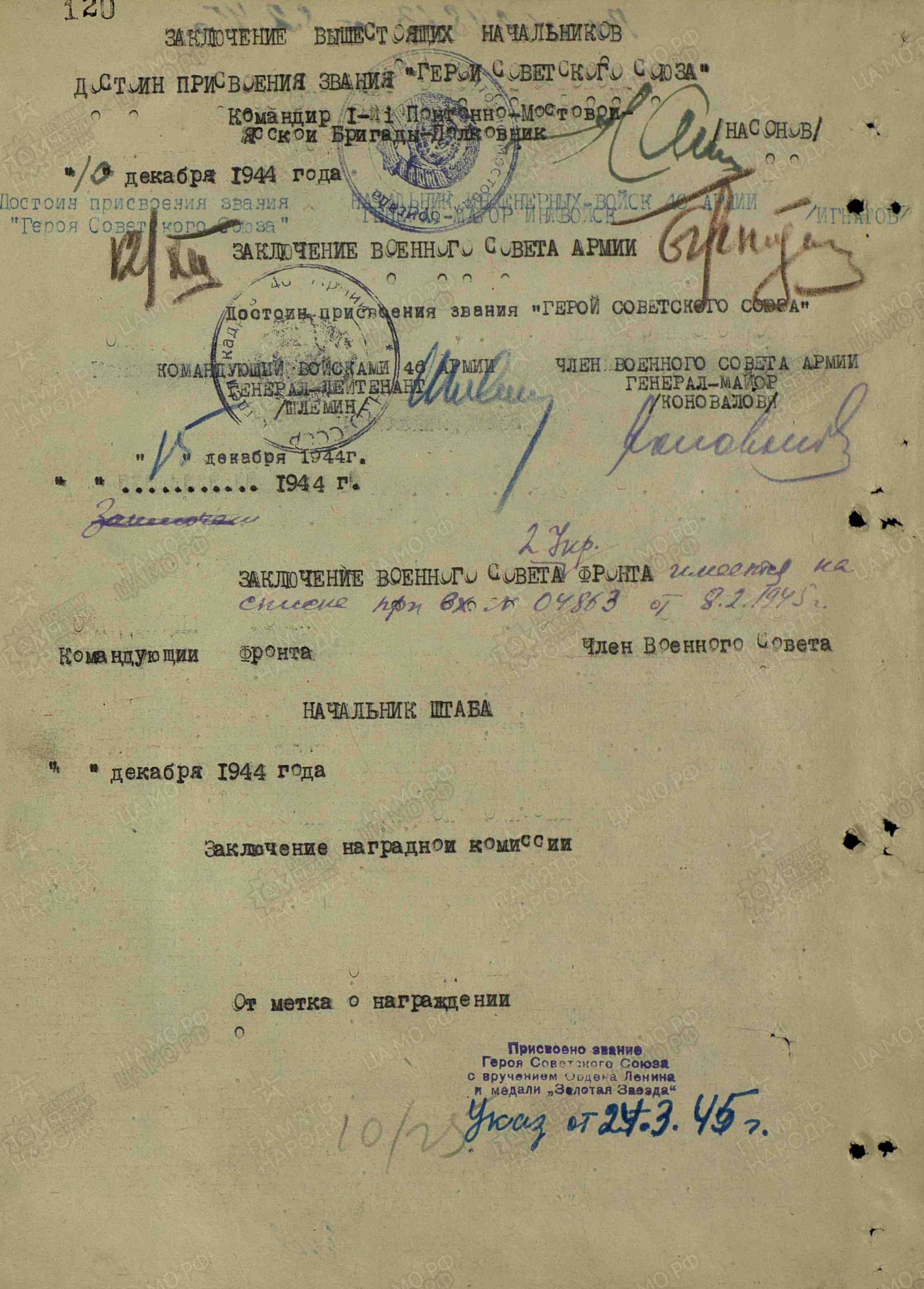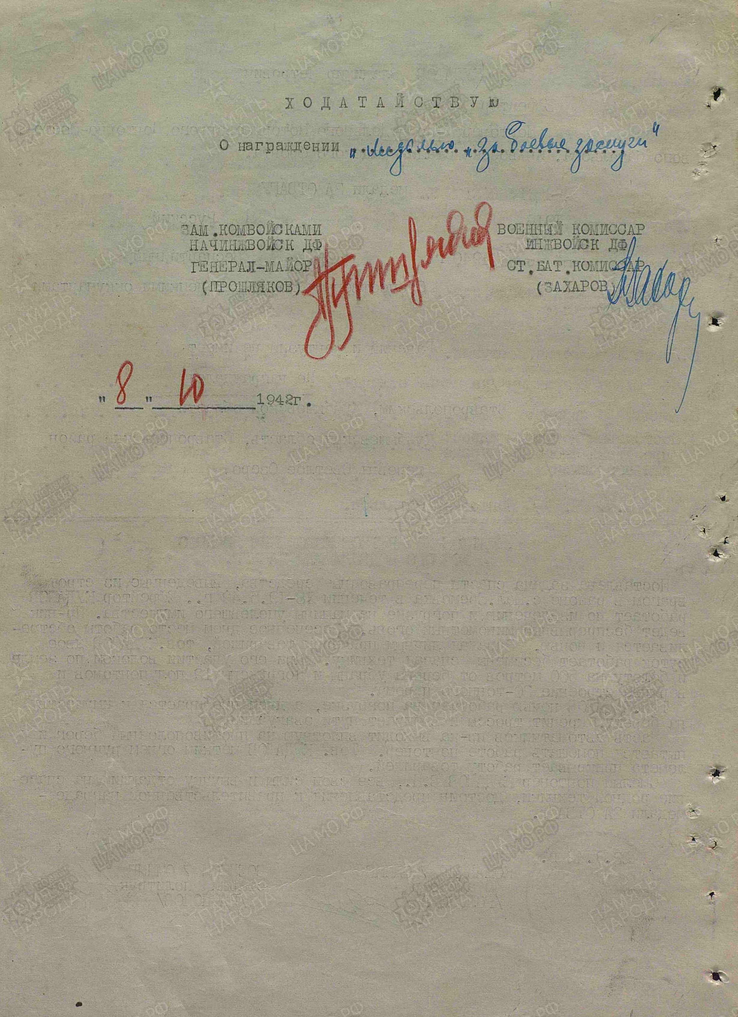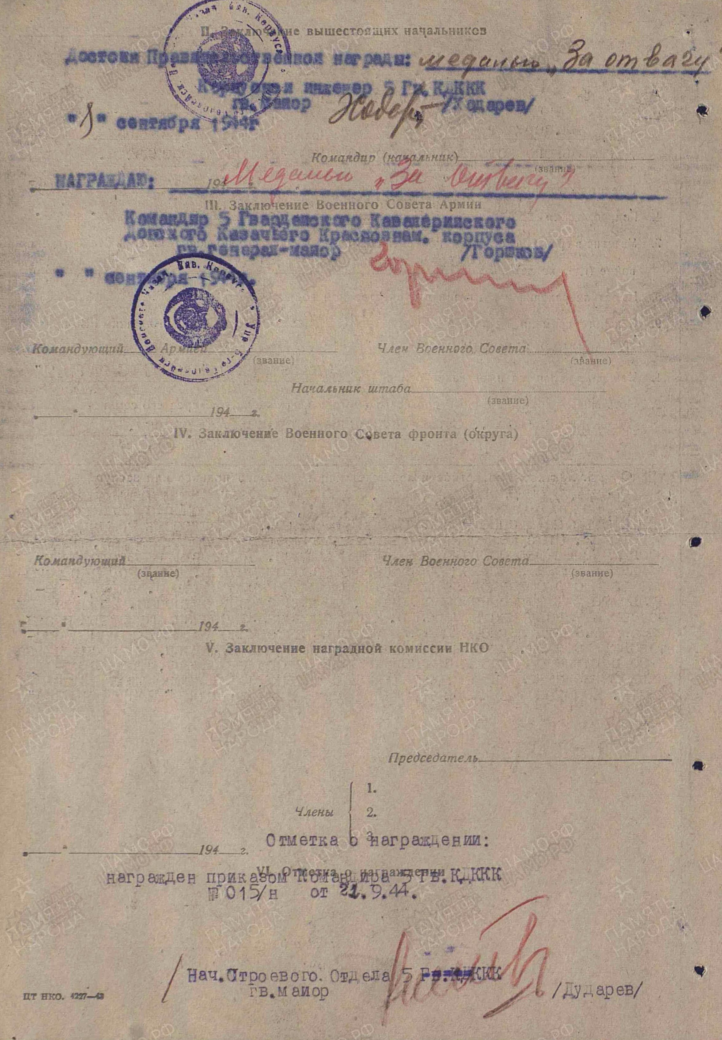 Поставлена задача спасти переправочные средства, выведенные из строя врагом в районе с. Малая Еремовка в течение 18-19 мая 1942 г. Ефрейтор Кудашов работает по извлечению и погрузке на машины уцелевшего имущества. Противник ведет беспрерывный минометный огонь. Засеченное днем место работы обстреливается и ночью. Заражая личным примером товарищей, тов. Кудашов двое суток работает без смены, спасая технику. При его участии волоком по земле и болоту на 500 метров от берега убраны и погружены 12 полупонтонов и верхнее строение 30-тонного парома. Тов. Кудашов ночью работает на погрузке, а днем пробирается к имуществу на берегу, крепит тросы и выбирает пути эвакуации. Часть автоматчиков противника выходит вплотную на противоположный берег и пытается помешать работе понтонер. Тов. Кудашов метким огнем ручного пулемета прикрывает работу товарищей. Смелый понтонер Кудашов В.П., все свои силы и выучку отдающий на спасение родной техники, достоин представления к правительственной награде – медали «За отвагу» (награжден медалью «За боевые заслуги»; наградной лист от 23.09.1942 г.). 2