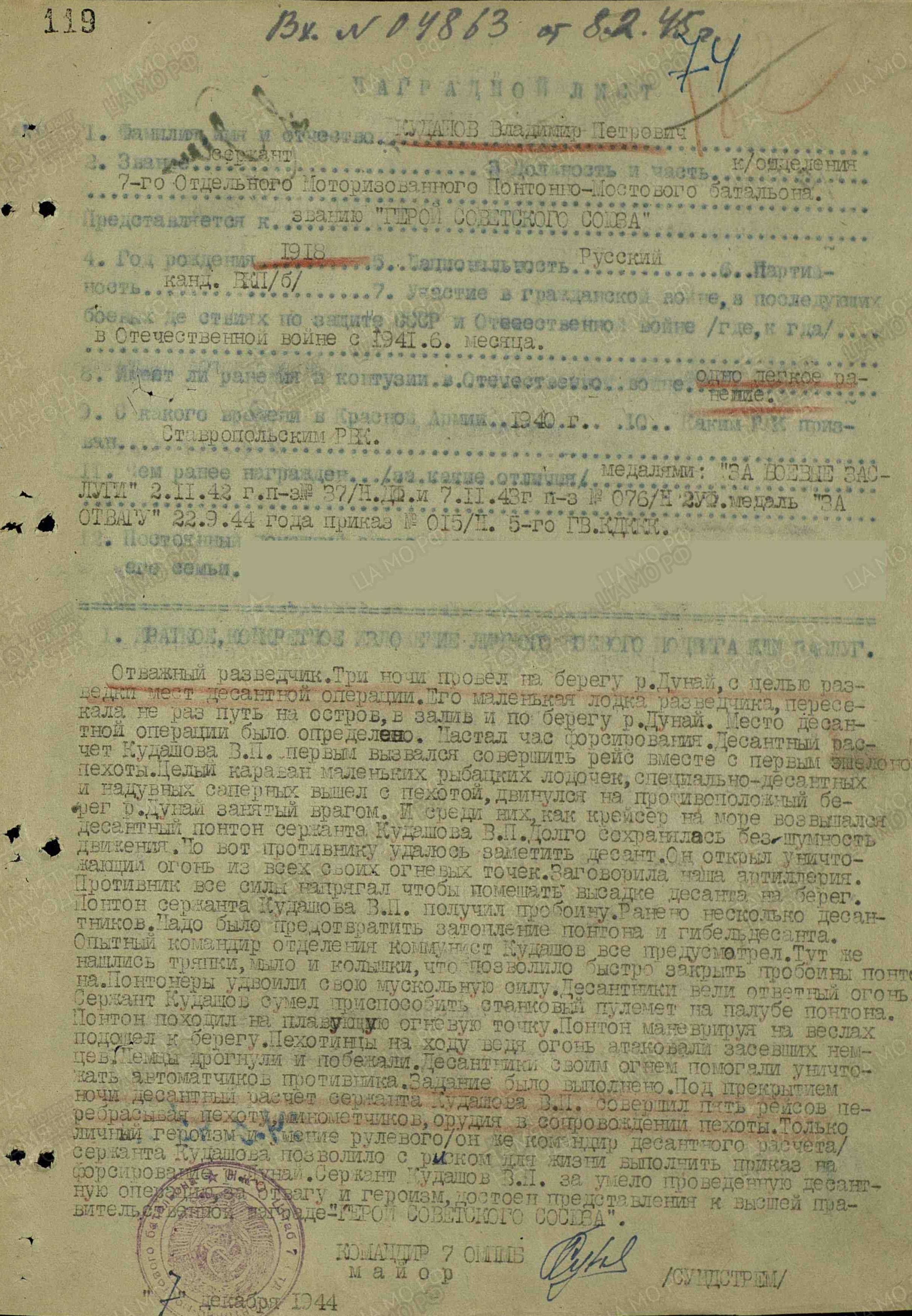 Отважный разведчик. Три ночи провел на берегу р. Дунай с целью разведки мест десантной операции. Его маленькая лодка разведчика не раз пересекала путь на остров, в залив и по берегу р. Дунай. Место десантной операции было определено. Настал час форсирования. Десантный расчет Кудашова В.П. первым вызвался совершить рейс вместе с первым эшелоном пехоты. Целый караван маленьких рыбацких лодочек, специально-десантных и надувных саперных вышел с пехотой, двинулся на противоположный берег р. Дунай, занятый врагом. Среди них, как крейсер на море, возвышался десантный понтон сержанта Кудашова В.П. Долго сохранялась бесшумность движения. Но вот противнику удалось заметить десант. Он открыл уничтожающий огонь из всех своих огневых точек. Заговорила наша артиллерия. Противник все силы напрягал на то, чтобы помешать высадке десанта на берег. Понтон сержанта Кудашова В.П. получил пробоину, ранено несколько десантников. Надо было предотвратить затопление понтона и гибель десанта. Опытный командир отделения, коммунист Кудашов все предусмотрел. Тут же нашлись тряпки, мыло и колышки, что позволило быстро закрыть пробоины понтона. Понтонеры удвоили свою мускульную силу. Десантники вели ответный огонь. Сержант Кудашов смог приспособить станковый пулемет на палубе понтона. Понтон походил на плавающую огневую точку. Понтон, маневрируя на веслах, подошел к берегу. Пехотинцы, на ходу ведя огонь, атаковали засевших немцев. Немцы дрогнули и побежали. Десантники своим огнем помогали уничтожать автоматчиков противника. Задание было выполнено. Под прикрытием ночи десантный расчет сержанта Кудашова В.П. совершил пять рейсов, перебрасывая пехоту, минометчиков, орудия в сопровождении пехоты. Только личный героизм и умение рулевого (он же командир десантного расчета) сержанта Кудашова позволили с риском для жизни выполнить приказ на форсирование р. Дунай. Сержант Кудашов В.П. за умело проведенную десантную операцию, за отвагу и героизм достоин представления к высшей правительственной награде – званию Героя Советского Союза (наградной лист от 7.12.1944 г.).