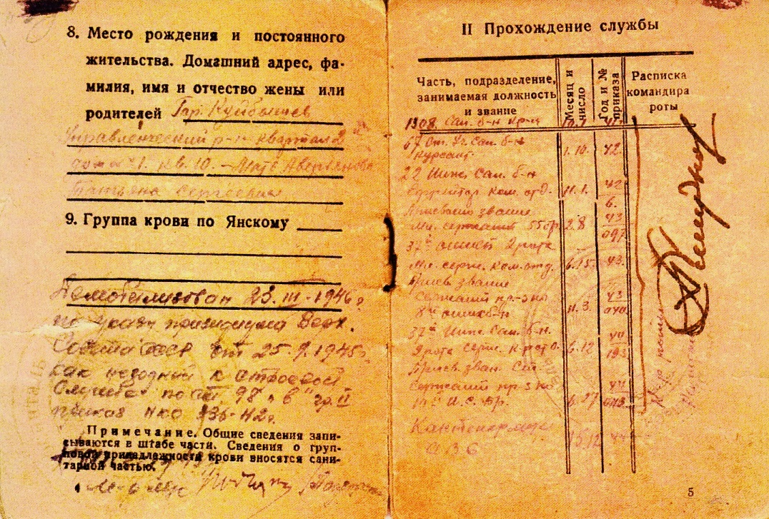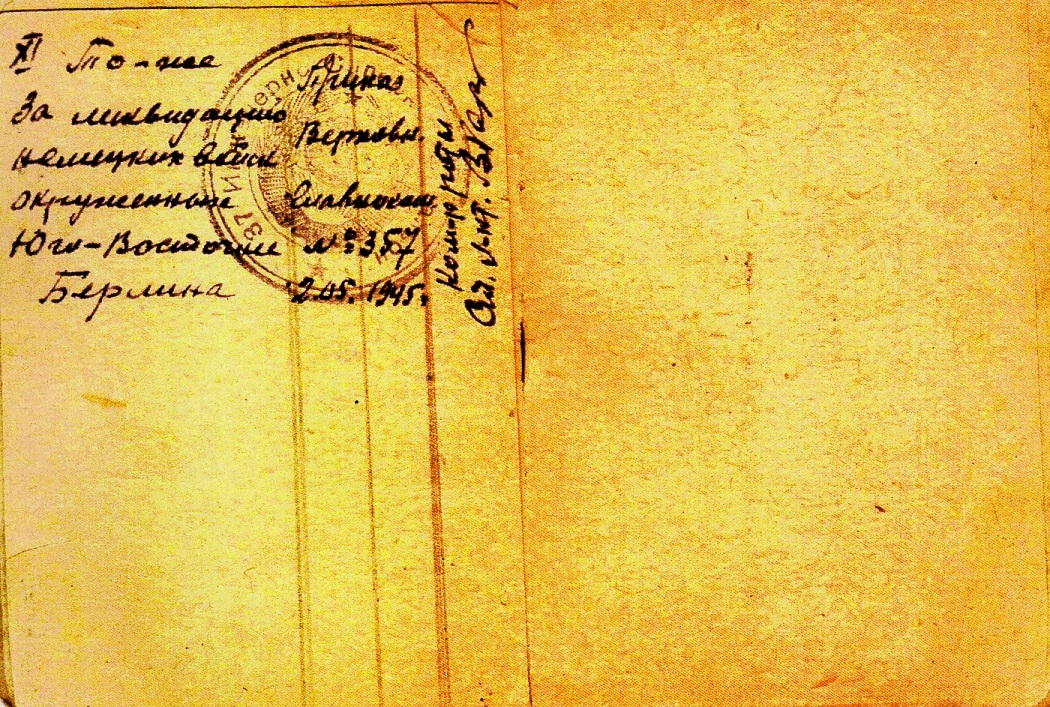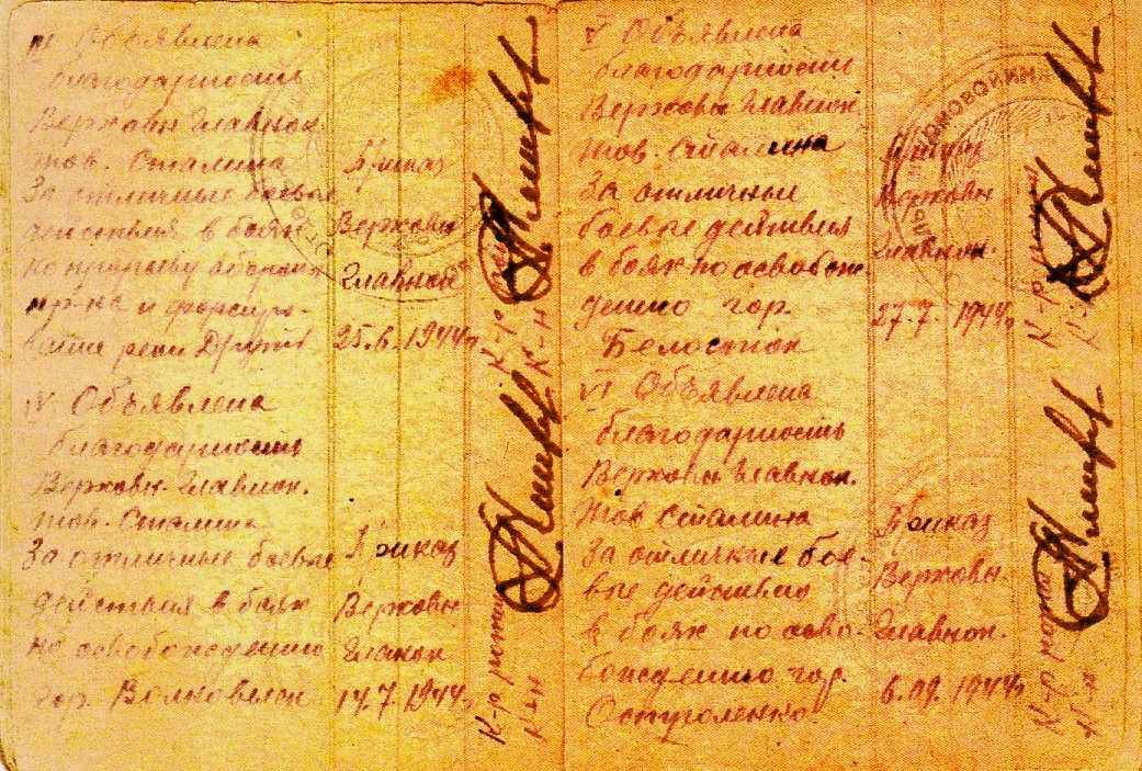 Курсант, исполняющий обязанности командира отделения, является лучшим в батальоне младшим командиром, образцово относящийся к своим обязанностям на работе по строительству дороги Тупичино-Рябутки (участок болота Невий Мох), не только отлично организовал работу своего отделения, но и одновременно обучал людей других отделений плотничному делу, чем помог взводу систематически перевыполнять нормы выработки при хорошем качестве работ. Серьезно заболев и будучи освобожден от всех видов работ, с работы не ушел до полного ее окончания. Представляется к правительственной награде – медали «За боевые заслуги» (наградной лист от 24.08.1942 г.).