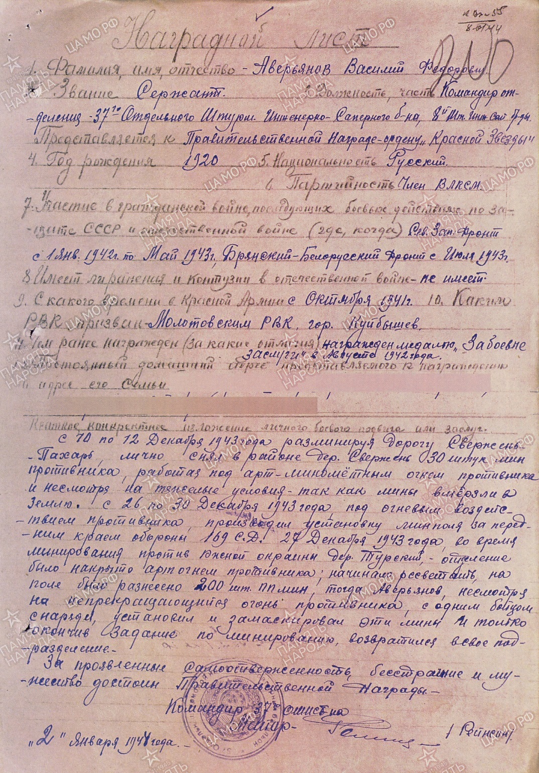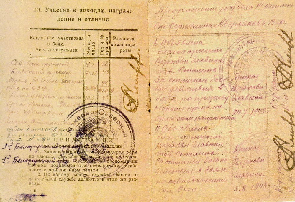 Младший сержант Аверьянов Василий Федорович в период с 12 октября по 3 ноября 1943 г., работая в 287-й стрелковой дивизии, образцово выполнял все поставленные перед подразделением задачи, проявляя при этом отвагу и мужество. Так, например, 26 октября 1943 г., работая со своим отделением по устройству жердевого съезда к понтонному берегу на р. Сопе, несмотря на интенсивный обстрел со стороны противника, уложил силами своего отделения 20 погонных метров жердевки за 3 часа, благодаря чему было обеспечено бесперебойное движение всех видов транспорта через мост. С 30 октября по 2 ноября работал по подноске мин на переднем крае в д. Новоселки, показывая пример сам, брал по 4 мины. За ночь поднес до 30 мин на расстояние до 1000 м под огнем противника. Со своим подразделением обеспечивал подноску мин к минирующим группам, закончил работу раньше срока. Достоин правительственной награды – ордена Красной Звезды (наградной лист от 6.11.1943 г.).