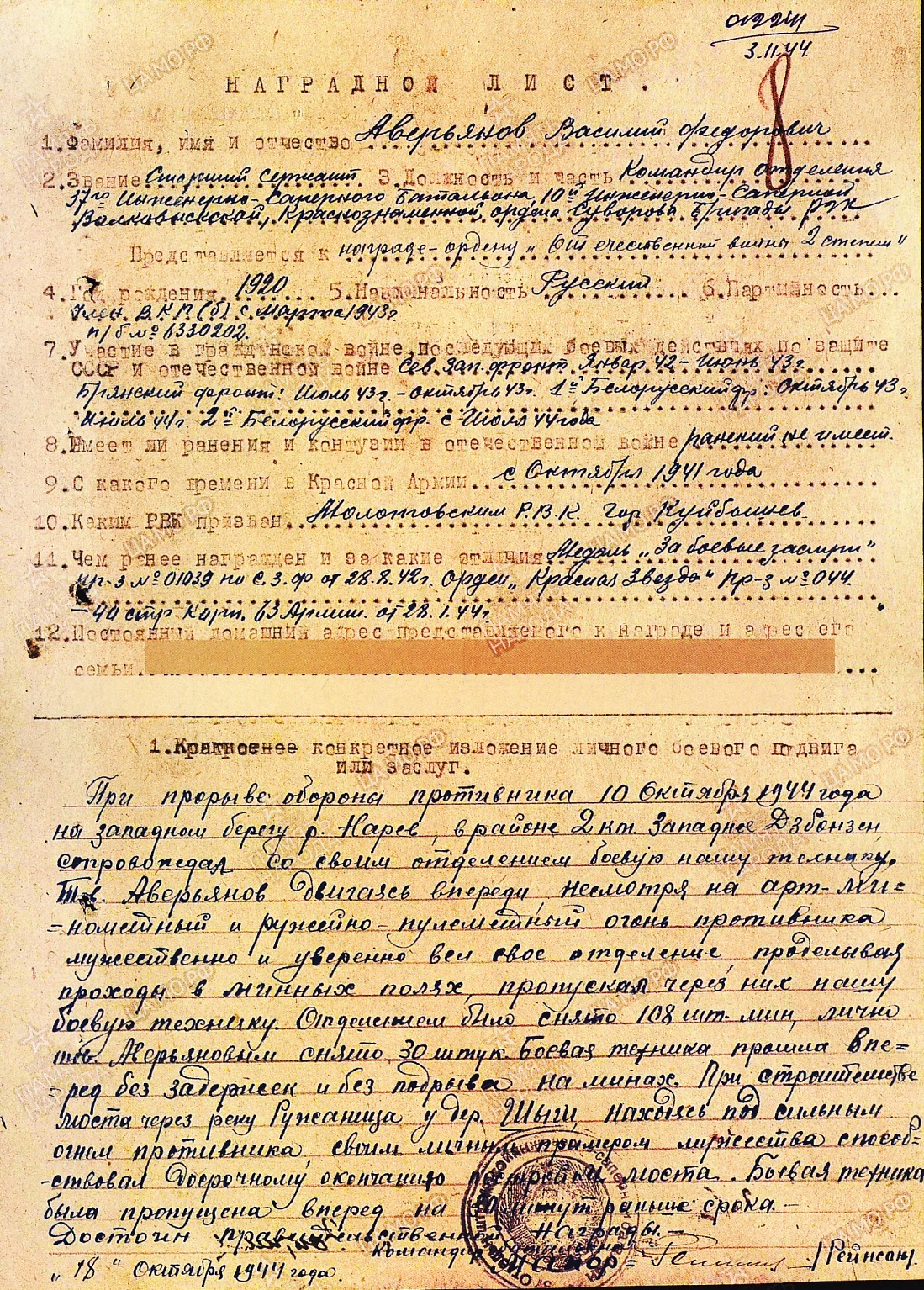 При прорыве обороны противника 10 октября 1944 г. на западном берегу р. Нарев, в 2 км западнее г. Дзбонзен сопровождал со своим отделением нашу боевую технику. Тов. Аверьянов, двигаясь впереди, несмотря на артиллерийско-минометный и ружейно-пулеметный огонь противника, мужественно и уверенно вел свое отделение, проделывая проходы в минных полях, пропуская через них нашу боевую технику. Отделением было снято 108 штук мин, лично тов. Аверьяновым снято 30 штук. Боевая техника прошла вперед без задержек и подрывов на минах. При строительстве моста через р. Ружаница у д. Шыги, находясь под сильным огнем противника, своим личным примером мужества способствовал досрочному окончанию постройки моста. Боевая техника была пропущена вперед на 30 минут раньше срока. Достоин правительственной награды – ордена Отечественной войны II степени (наградной лист от 16.11.1944 г.).