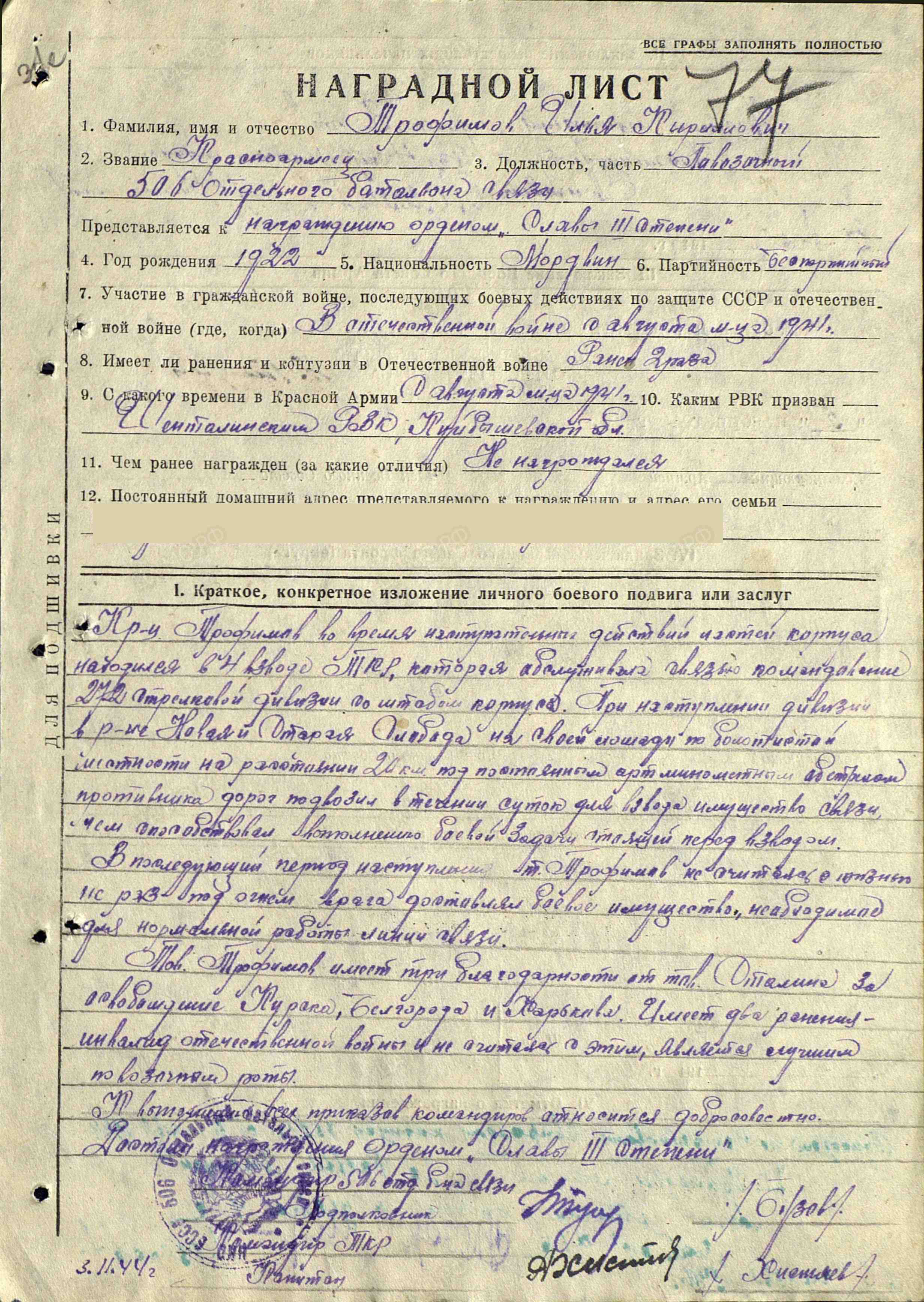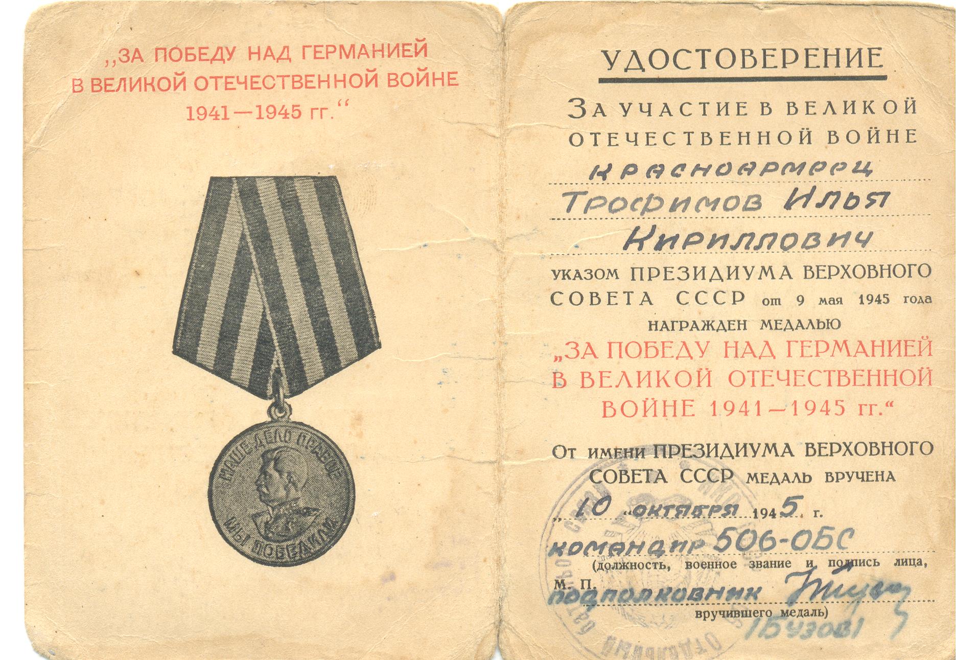 Информация сайта podvignaroda.ru: Красноармеец Трофимов во время наступательных действий частей корпуса находился в 4-м взводе транспортно-повозочной роты, которая обслуживала связью командование 272-й стрелковой дивизии со штабом корпуса. При наступлении дивизии в районе Новая и Старая Слобода, на своей лошади по болотистой местности на расстоянии 20 км, под постоянным артминометным обстрелом дорог противником подвозил в течение суток для взвода имущество связи, чем способствовал выполнению боевой задачи, стоящей перед взводом. В последующий период наступления тов. Трофимов, не считаясь с жизнью, не раз под огнем врага доставлял боевое имущество, необходимое для нормальной работы линии связи. Тов. Трофимов имеет три благодарности от тов. Сталина за освобождение Курска, Белгорода и Харькова. Имеет два ранения, инвалид Отечественной войны. Не считаясь с этим, является лучшим повозочным роты. К выполнению всех приказов командиров относится добросовестно. Достоин награждения орденом Славы III степени (награжден медалью «За боевые заслуги»; наградной лист от 3.11.1944 г.).