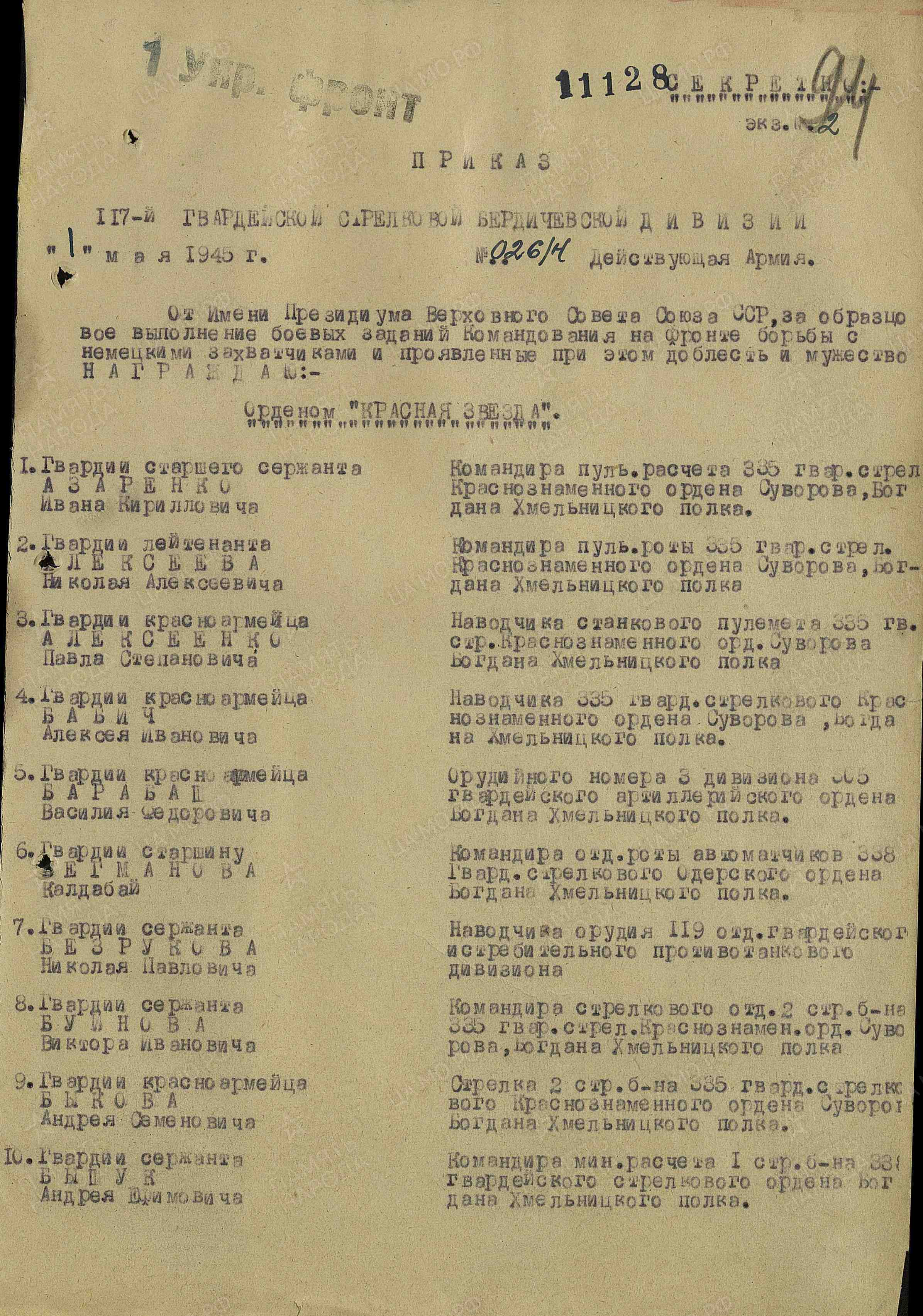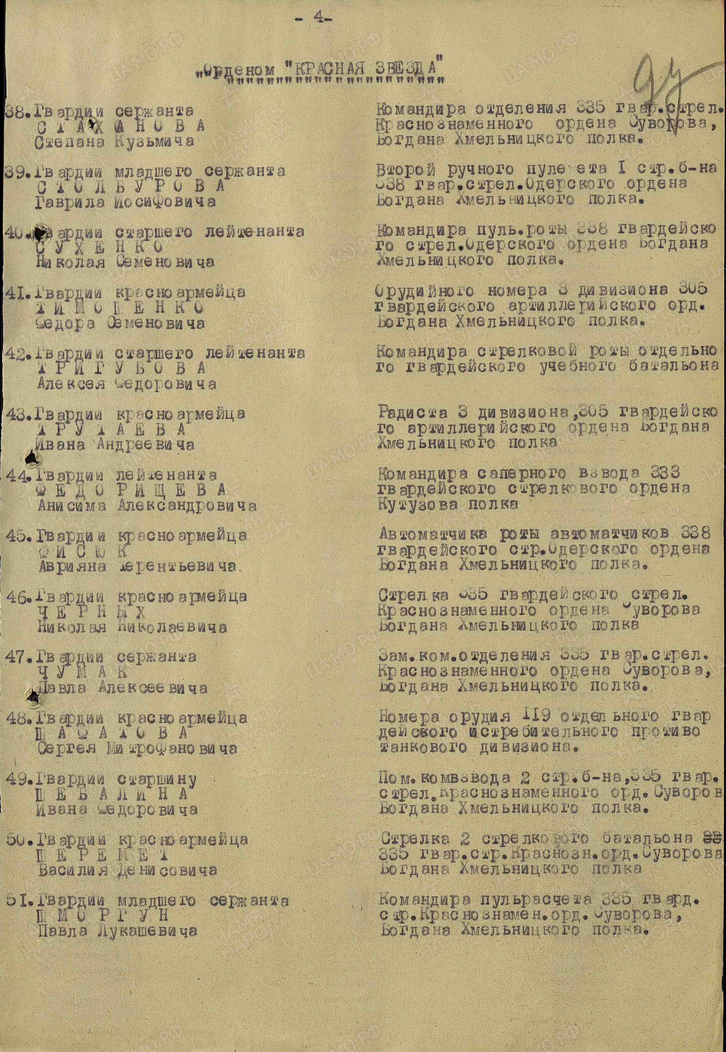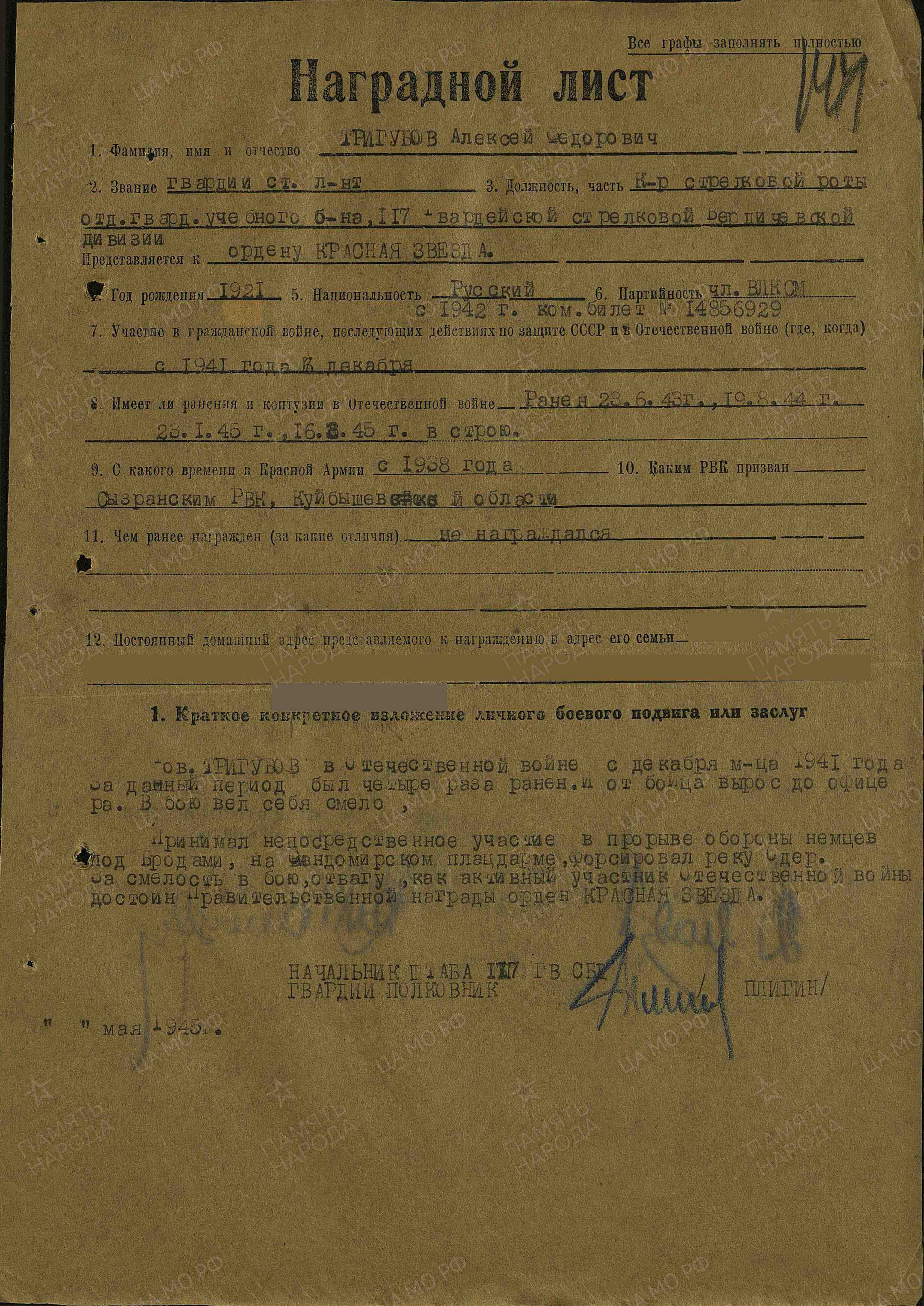 Информация сайта podvignaroda.ru: Тов. Тригубов в Отечественной войне с декабря 1941 г. За данный период был четыре раза ранен. От бойца вырос в офицера. В бою вел себя смело. Принимал непосредственное участие в прорыве обороны немцев под Бродами, на Сандомирском плацдарме, форсировал реку Одер. За смелость и отвагу в бою, как активный участник Отечественной войны достоин правительственной награды – ордена Красной Звезды (наградной лист от 1.05.1945 г.).