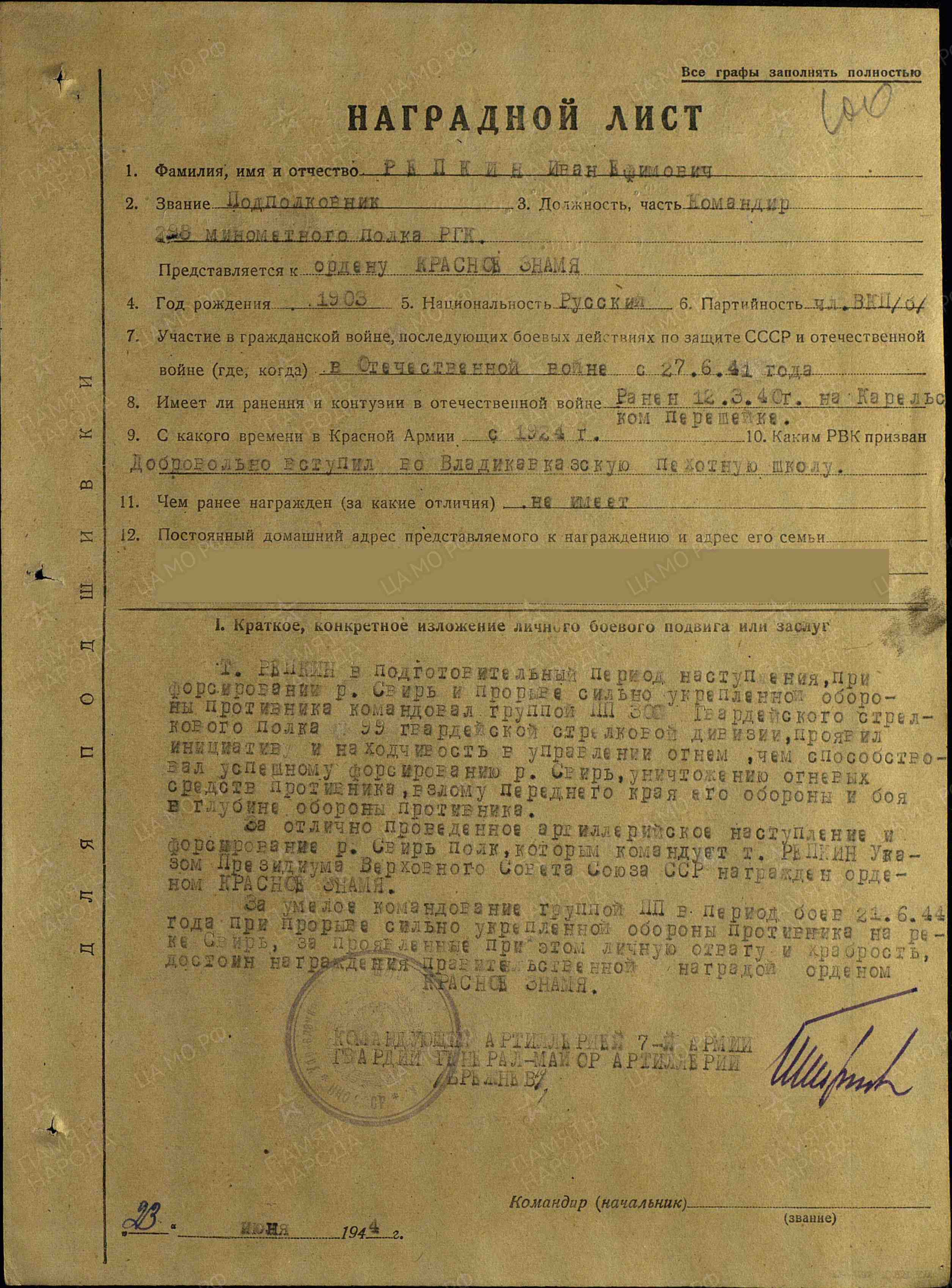 Тов. Репкин в подготовительный период наступления при форсировании р. Свирь и прорыве сильно укрепленной обороны противника командовал группой ПП 300-го гвардейского стрелкового полка 99-й гвардейской стрелковой дивизии, проявил инициативу и находчивость в управлении огнем, чем способствовал успешному форсированию р. Свирь, уничтожению огневых средств противника, взлому переднего края обороны и боя в глубине обороны противника. За отлично проведенное артиллерийское наступление и форсирование р. Свирь полк, которым командует тов. Репкин, указом Президиума Верховного Совета Союза ССР награжден орденом Красного Знамени. За умелое командование группой ПП в период боев 21 июня 1944 г. при прорыве сильно укрепленной обороны противника на р. Свирь, за проявленные при этом личную отвагу и храбрость достоин награждения правительственной наградой - орденом Красного Знамени (наградной лист от 23.06.1944 г.).