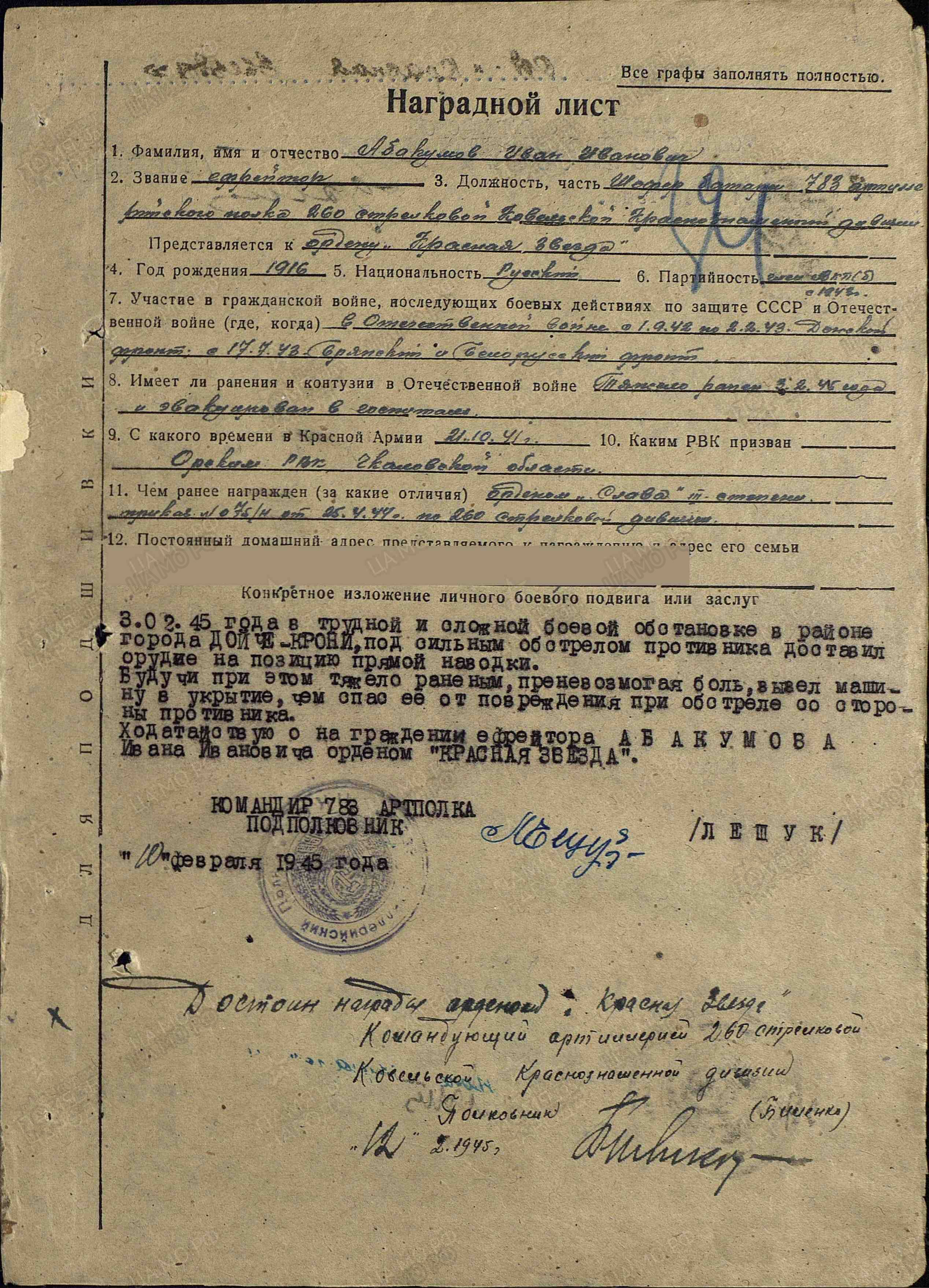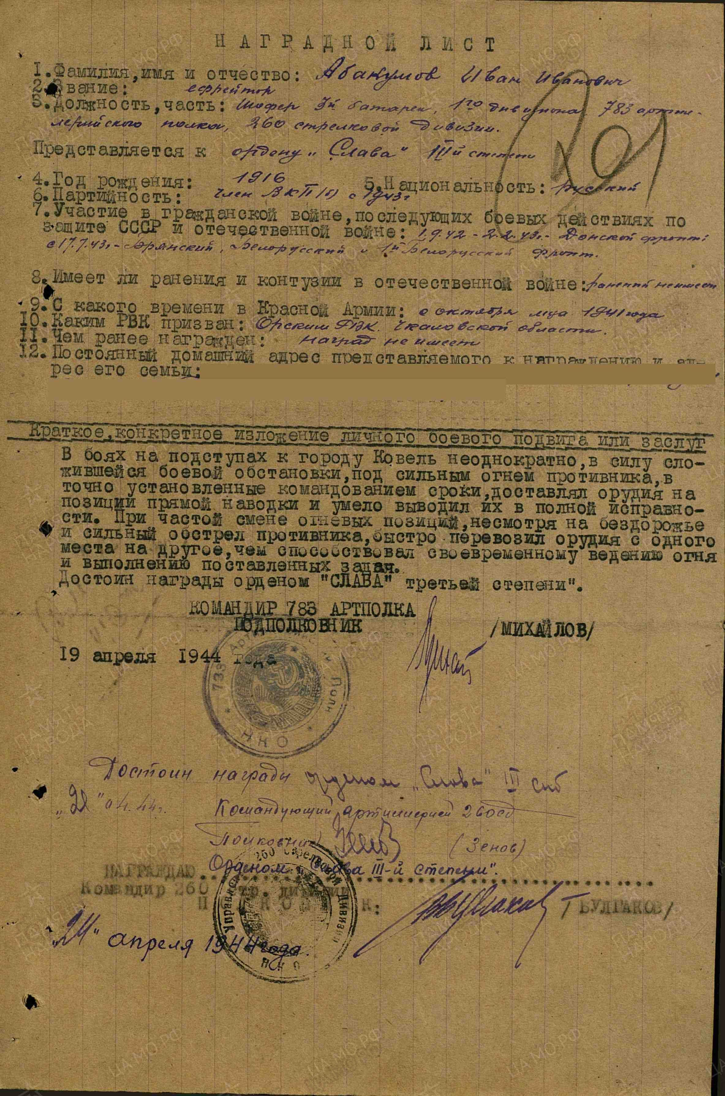В боях на подступах к г. Ковель (Украина) неоднократно, в силу сложившейся боевой обстановки, под сильным огнем противника в точно установленные командованием сроки доставлял орудия на позиции прямой наводки и умело выводил их в полной исправности. При частой смене огневых позиций, несмотря на бездорожье и сильный обстрел противника быстро перевозил орудия с одного места на другое, чем способствовал своевременному ведению огня и выполнению поставленных задач. Достоин награды - ордена Славы III степени (наградной лист от 19.04.1944 г.).