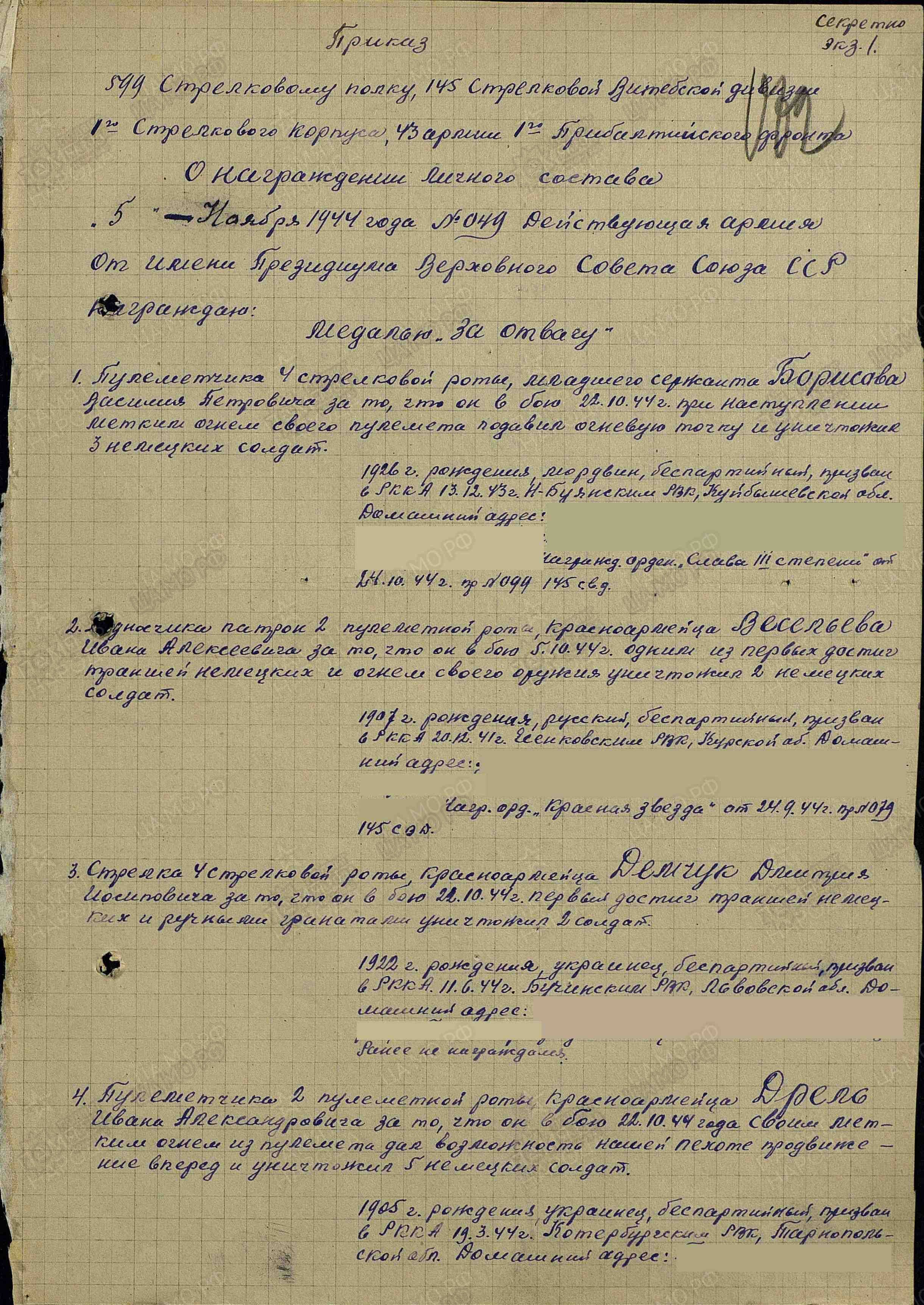 Наградить медалью «За отвагу» пулеметчика 4-й стрелковой роты, младшего сержанта Борисова Василия Петровича за то, что он в бою 22 октября 1944 г. при наступлении метким огнем своего пулемета подавил огневую точку и уничтожил 3-х немецких солдат (наградной лист от 5.11.1944 г.).