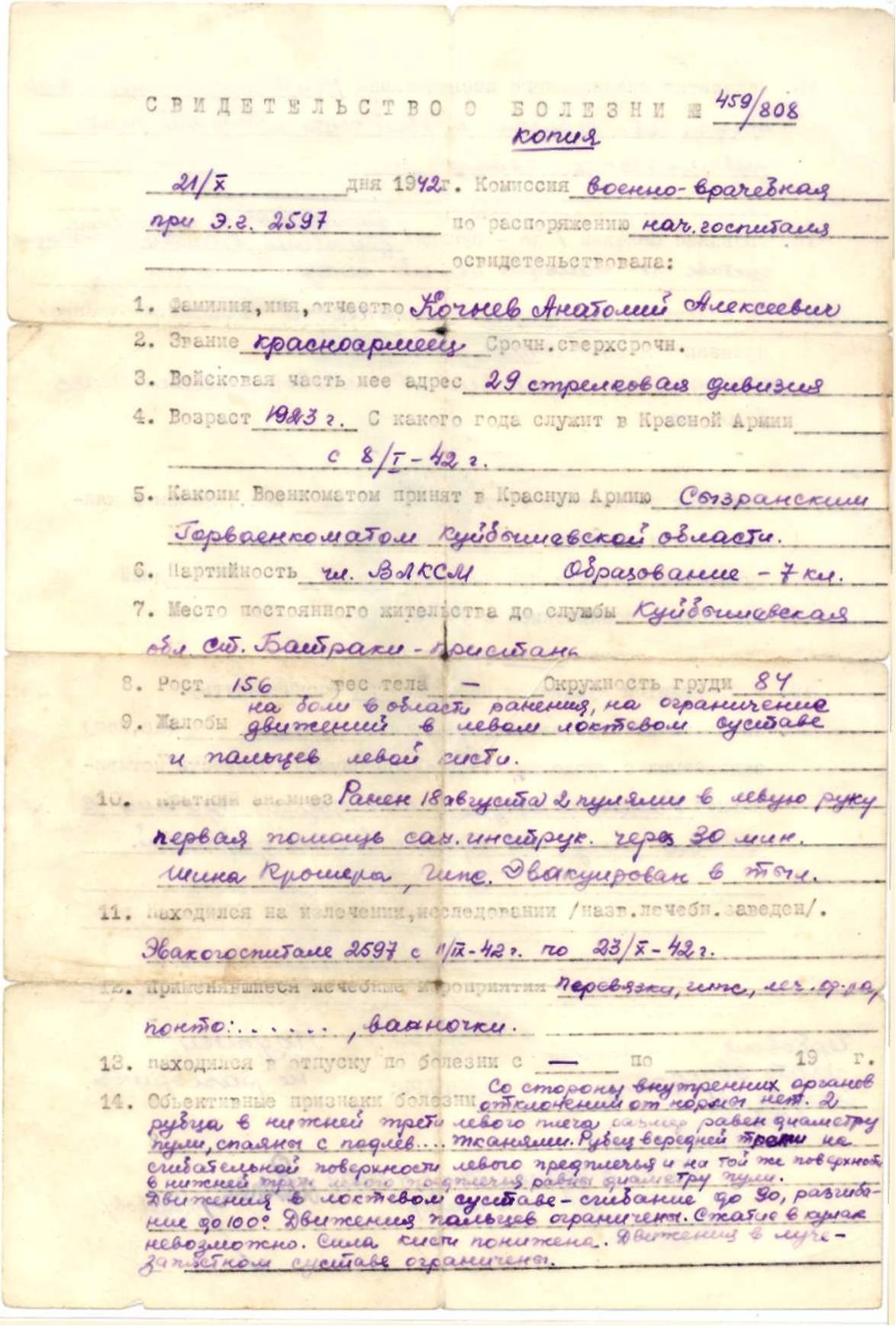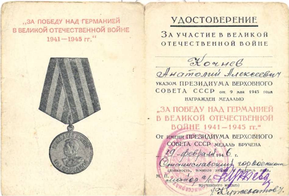 Будучи стрелком-автоматчиком 128-го стрелкового полка 29-й стрелковой дивизии 55-й армии на Сталинградском фронте, 18 августа 1942 г. был тяжело ранен – сквозное пулевое ранение левого локтевого сустава с повреждением кости и осколочное ранение левой стопы. Участвуя в боях на фронтах Отечественной войны, тов. Кочнев лично уничтожил 25 гитлеровцев и поджег 2 средних танка противника, захватил в плен одного офицера и 1 мотоцикл. В результате полученного тяжелого ранения, тов. Кочнев по состоянию здоровья уволен в запас, ныне инвалид Отечественной войны 3 группы. За проявленное мужество и отвагу при выполнении задания командования на фронтах Отечественной войны достоин правительственной награды - ордена Славы III степени (наградной лист от 5.06.1945 г.).