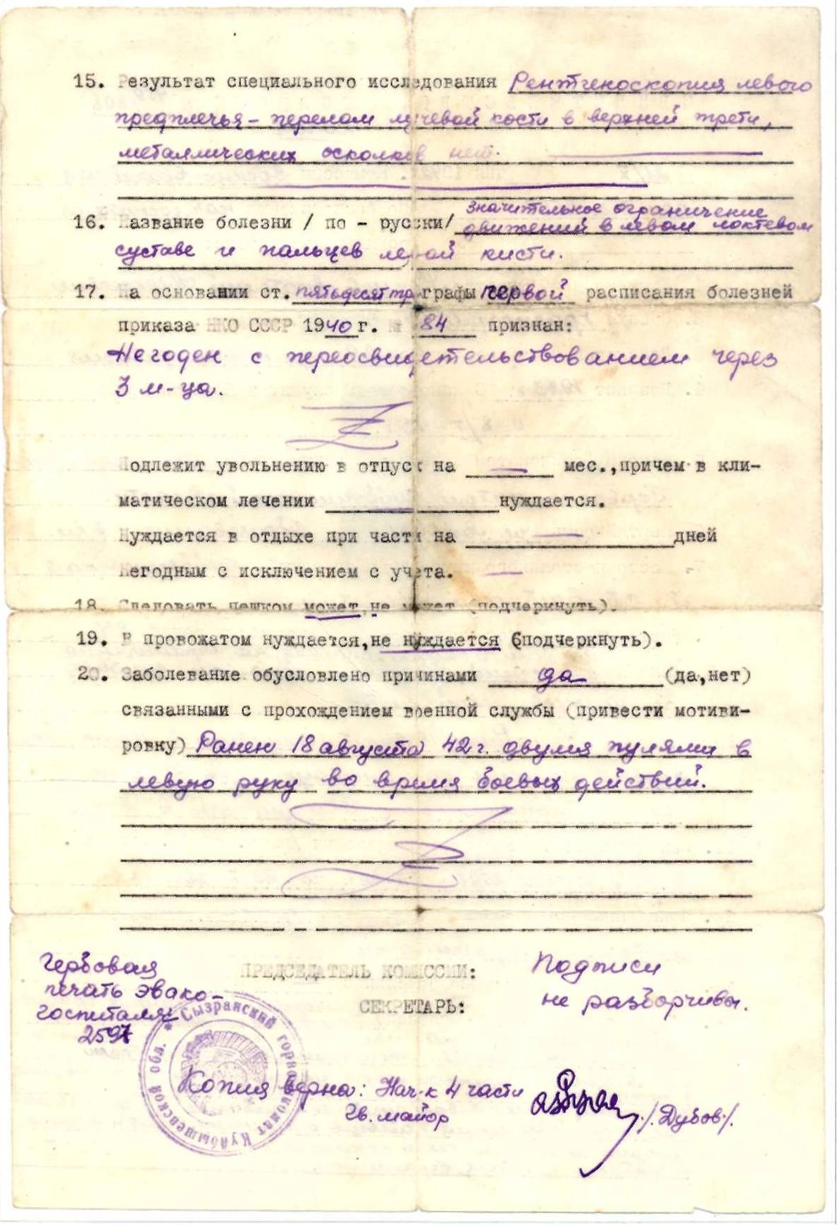 После войны служил в милиции, работал кочегаром. До 70 лет работал в вагонном депо ст. Сызрань. К сожалению, фотографий военной поры не сохранилось. Умер 17 октября 2005 г.
