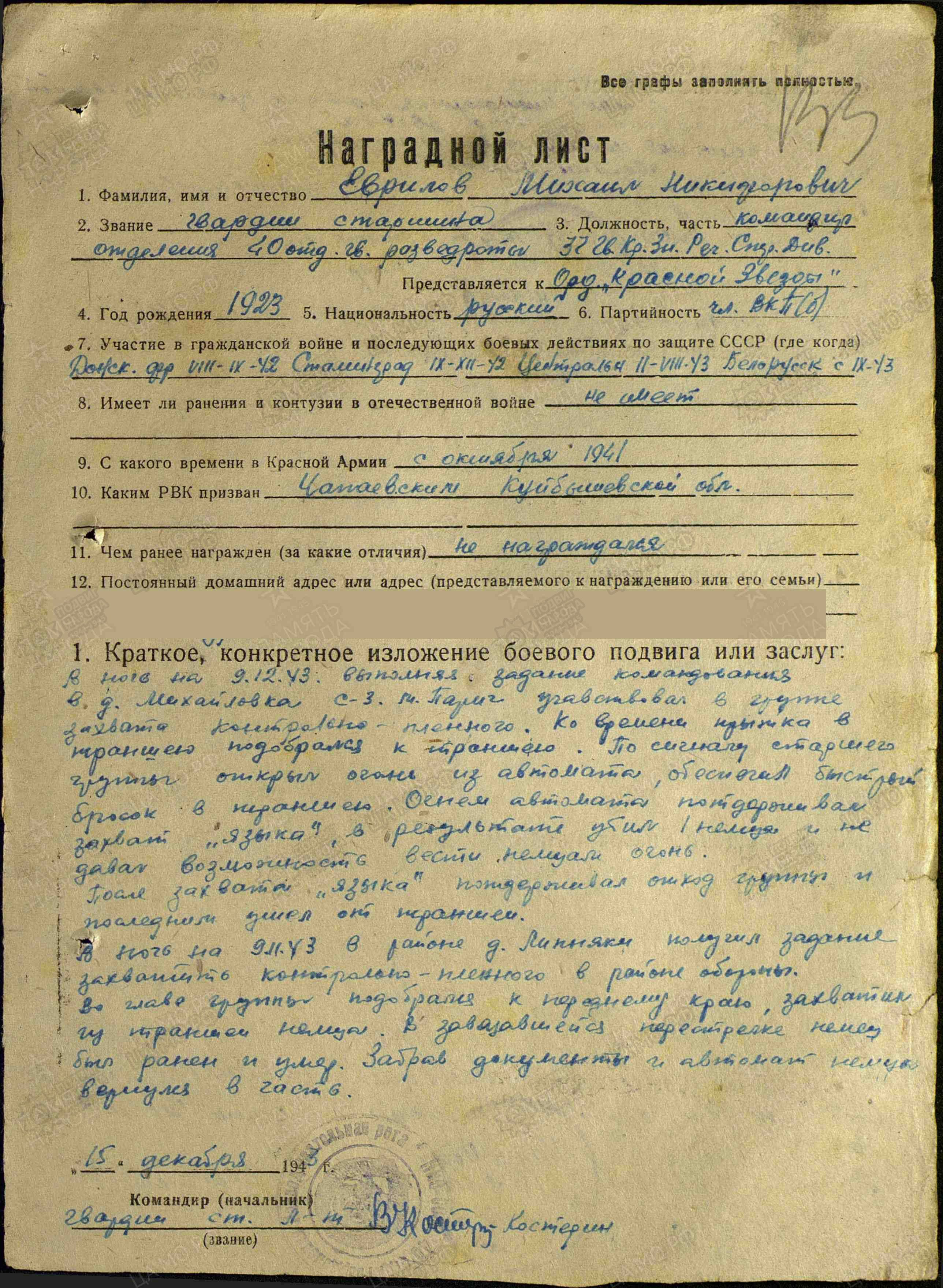 Информация сайта podvignaroda.ru: В ночь на 9 декабря 1943 г., выполняя задание командования в д. Михайловка, участвовал в группе захвата контрольного пленного. Ко времени прыжка в траншею подобрался к траншее. По сигналу старшего группы открыл огонь из автомата, обеспечил быстрый бросок в траншею. Огнем автомата поддерживал захват «языка», в результате убил 1-го немца и не давал немцам возможности вести огонь. После захвата «языка» поддерживал отход группы и последним ушел от траншеи. В ночь на 9 ноября 1943 г. в районе д. Липняки (Лоевский район Гомельской области Белорусской ССР) получил задание захватить контрольного пленного в районе обороны. Во главе группы подобрался к переднему краю, захватил из траншеи немца. В завязавшейся перестрелке немец был ранен и умер. Забрав документы и автомат немца, тов. Еврилов вернулся в часть. Достоин награждения орденом Красной Звезды (награжден орденом Славы III степени; наградной лист от 15.03.1943 г.).