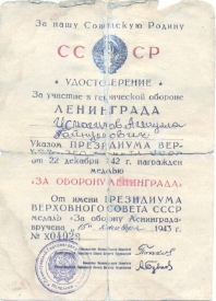 Награды: медаль «За оборону Ленинграда», медаль «За боевые заслуги», медаль «За взятие Берлина», медаль «За победу над Германией в Великой Отечественной войне 1941-1945 гг.», орден Отечественной войны II степени, юбилейные медали.