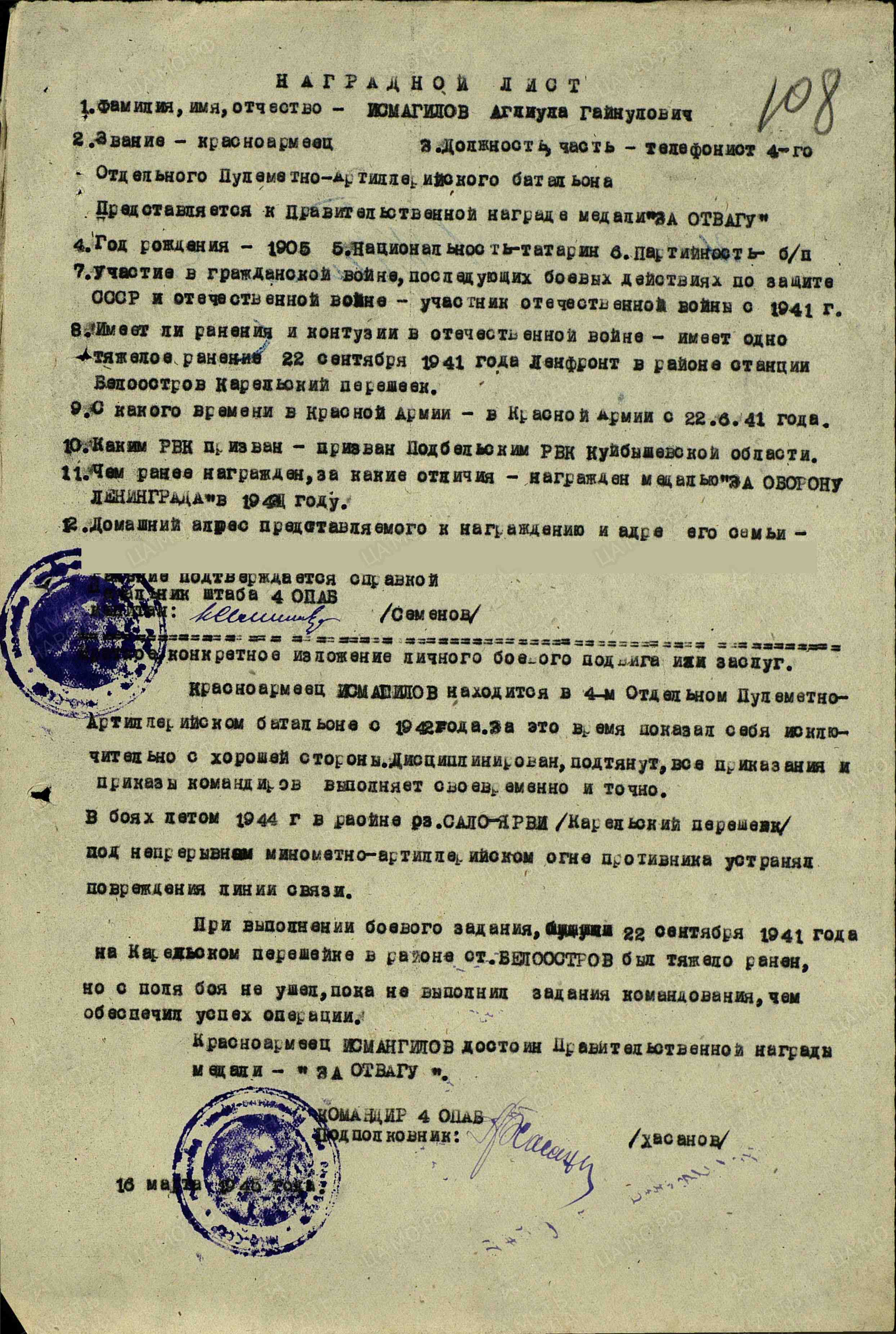 Информация сайта podvignaroda.ru: Красноармеец Исмагилов находится в 4-м отдельном пулеметно-артиллерийском батальоне с 1942 г. За это время показал себя исключительно с хорошей стороны. Дисциплинирован, подтянут, все приказания и приказы командиров выполняет своевременно и точно. В боях летом 1944 г. в районе озера Суоярви (Карельский перешеек) под непрерывным минометно-артиллерийским огнем противника устранял повреждения линии связи. При выполнении боевого задания 22 сентября 1941 г. на Карельском перешейке в районе ст. Белоостров был тяжело ранен, но с поля боя не ушел, пока не выполнил задания командования, чем обеспечил успех операции. Красноармеец Исмагилов достоин правительственной награды – медали «За отвагу» (награжден медалью «За боевые заслуги»; наградной лист от 31.03.1945 г.).