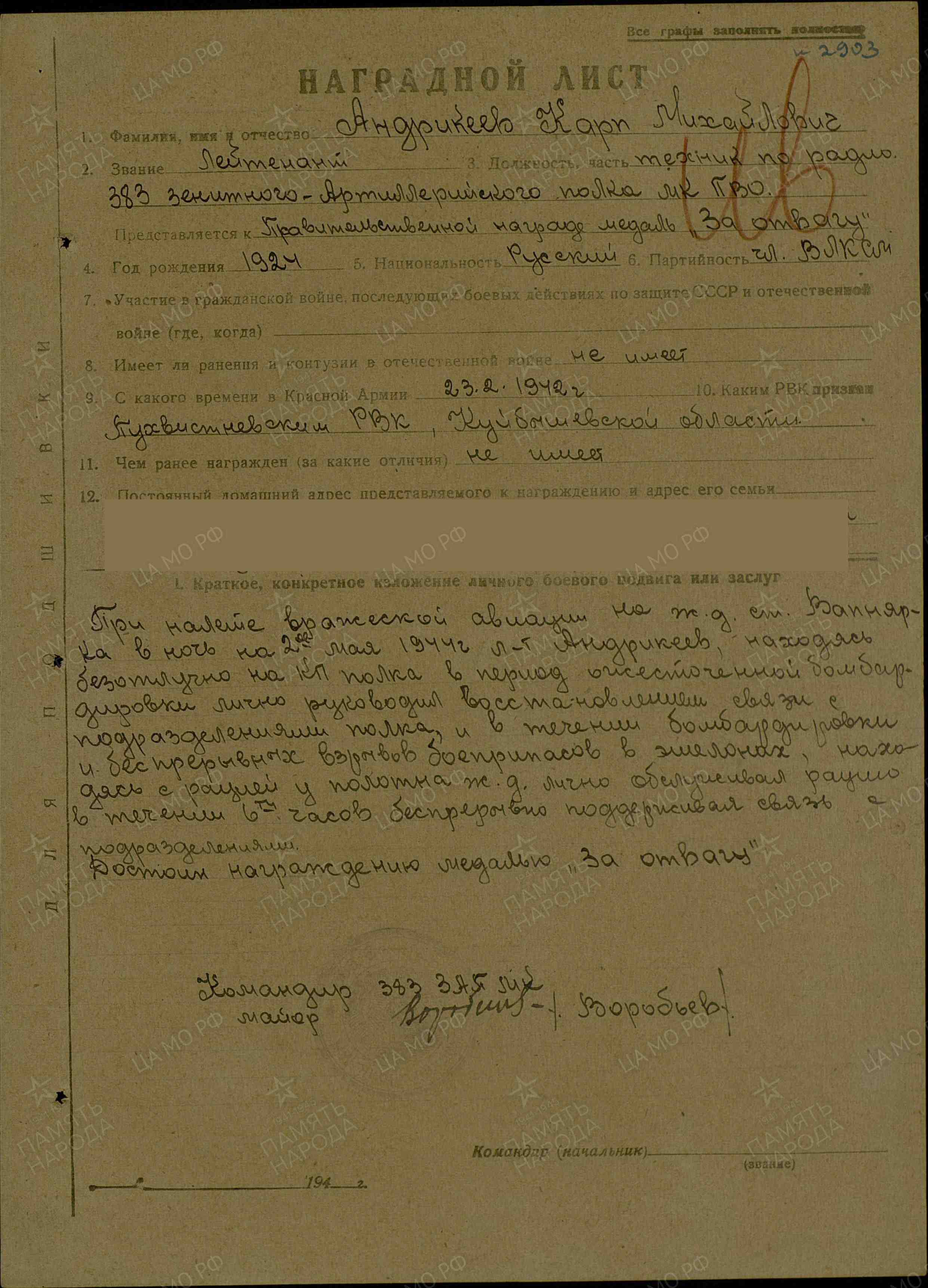 Информация сайта podvignaroda.ru: При налете вражеской авиации на железнодорожную станцию Вапнярка (Украина) в ночь на 2 мая 1944 г. лейтенант Андрикеев, безотлучно находясь на командном пункте полка, в период ожесточенной бомбардировки лично руководил восстановлением связи с подразделениями полка. В течение бомбардировки и беспрерывных взрывов боеприпасов в эшелонах, находясь с рацией у железнодорожного полотна, лично обслуживал рацию, 6 часов беспрерывно поддерживая связь с подразделениями. Достоин награждения медалью «За отвагу» (наградной лист от 12.07.1944 г.).
