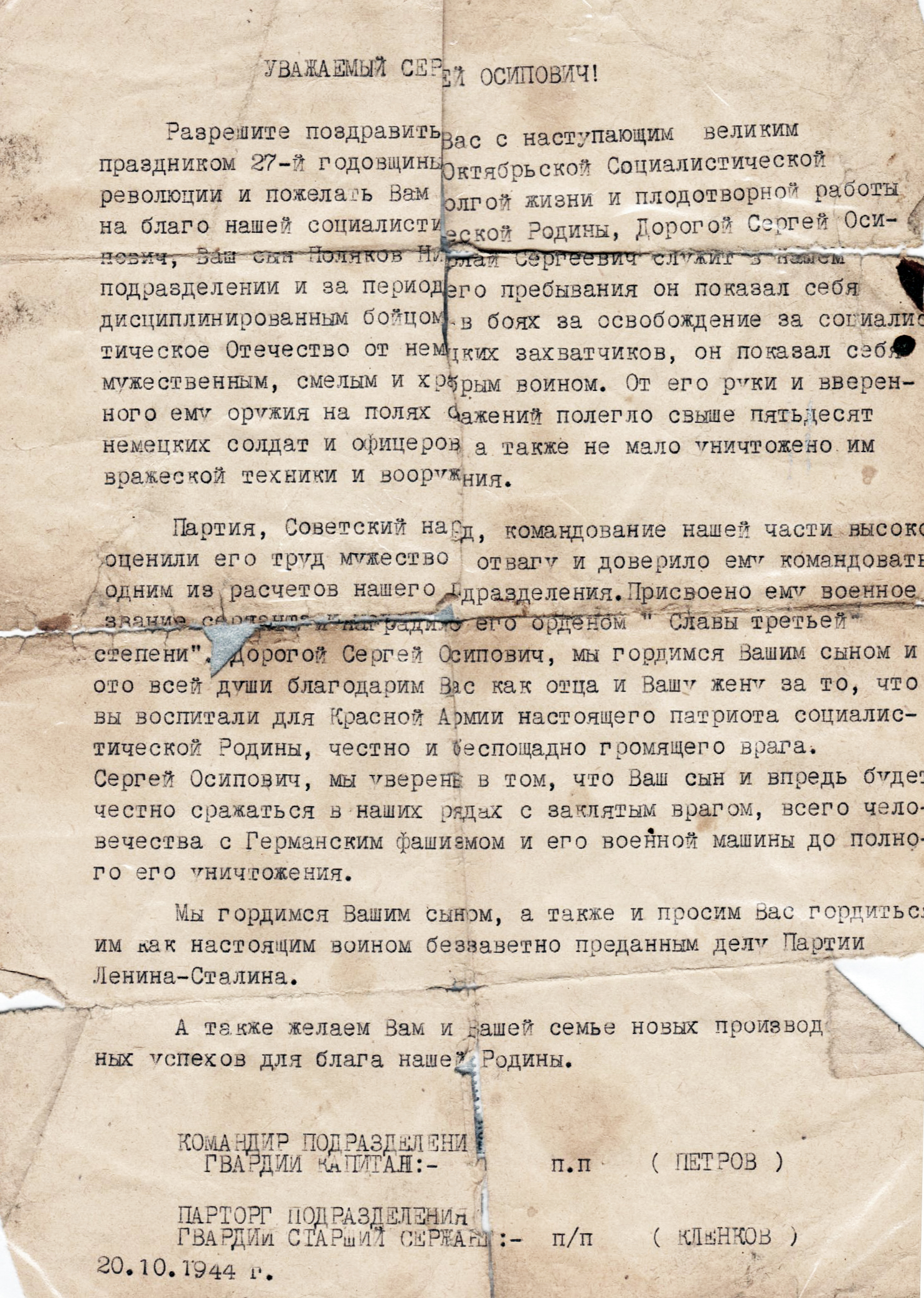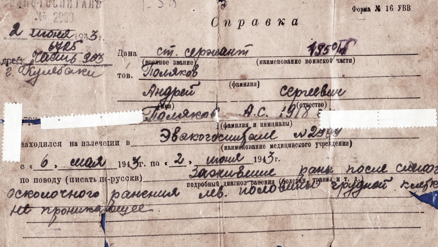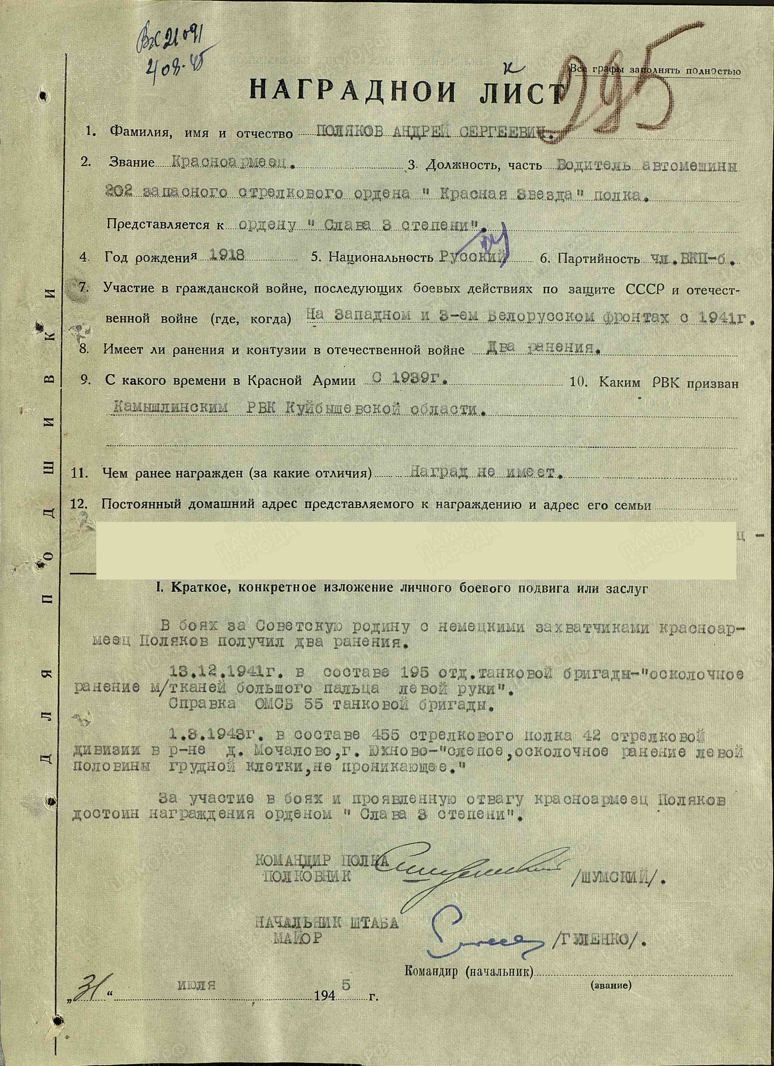 В боях с немецкими захватчиками за Советскую Родину красноармеец Поляков получил два ранения. 13 декабря 1941 г. в составе 195-й отдельной танковой бригады - осколочное ранение мягких тканей большого пальца левой руки (справка ОМСБ 55-й танковой бригады). 1 марта 1943 г. в составе 455-го стрелкового полка 42-й стрелковой дивизии в районе д. Мочалово, Юхново - слепое осколочное ранение левой половины грудной клетки, не проникающее. За участие в боях и проявленную отвагу красноармеец Поляков достоин награждения орденом Славы III степени (наградной лист от 31.07.1945 г.).