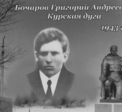 Бочаров Григорий Андреевич 1908 года рождения. Был призван на фронт в августе 1941 года. Сначала был на Ленинградском фронте. Оттуда по ранению попал в госпиталь г. Ижевска. В госпитале он познакомился с Гаевским Алексеем Спиридоновичем. После выздоровления и выписки из госпиталя их вместе направили на Курскую Дугу. 8 июля 1943 года Григорий погиб. Алексей Спиридонович, семья которого проживала в то время в г. Москве, до конца войны писал письма семье погибшего товарища.