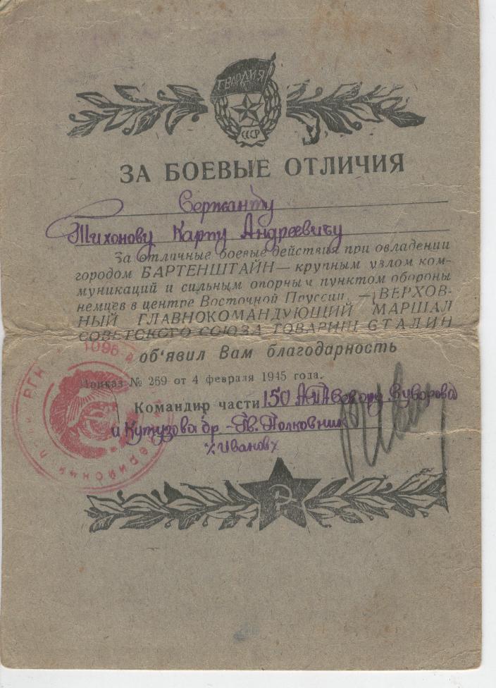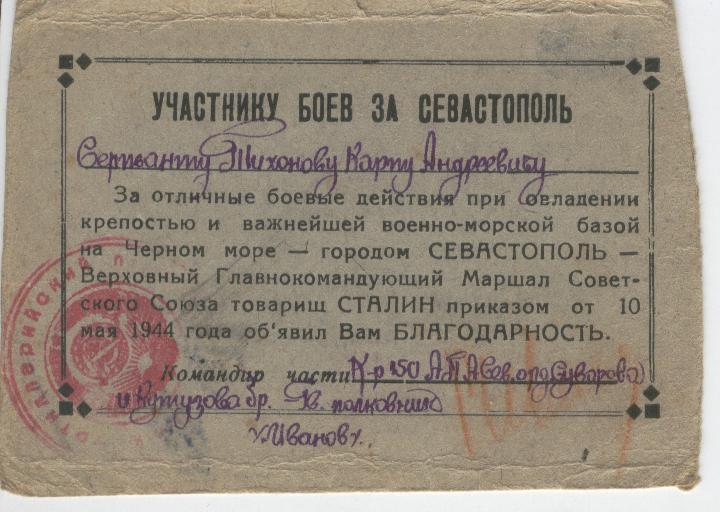 Дата рождения: 6 июня 1923 год. Другая информация об этом человеке на сегодняшний день отсутствует. Имеется только 3 наградных документа, по которым мы уже можем судить о мужестве и храбрости Тихонова Карпа Андреевича. А ведь ему на момент окончания войны было всего 22 года…