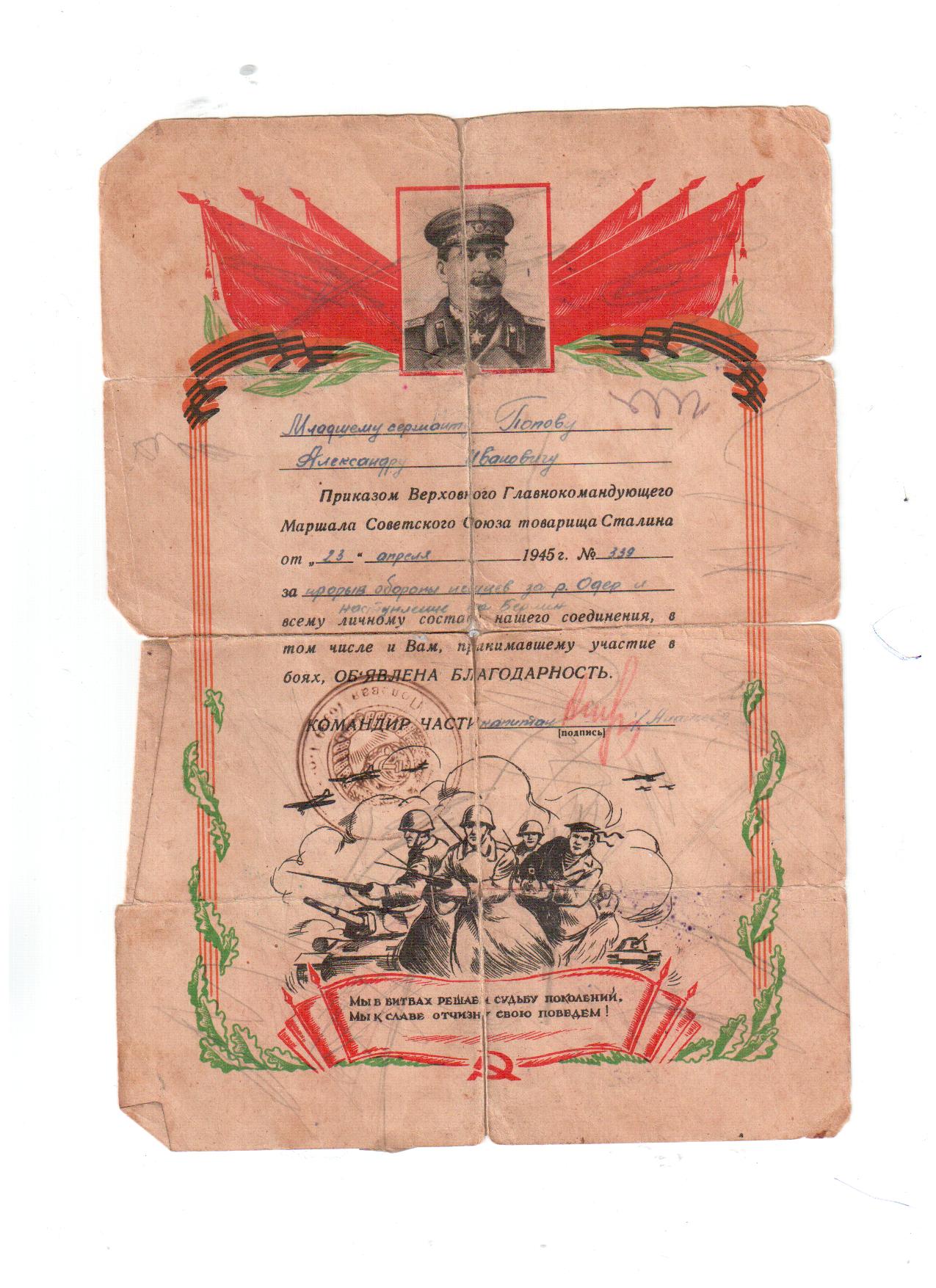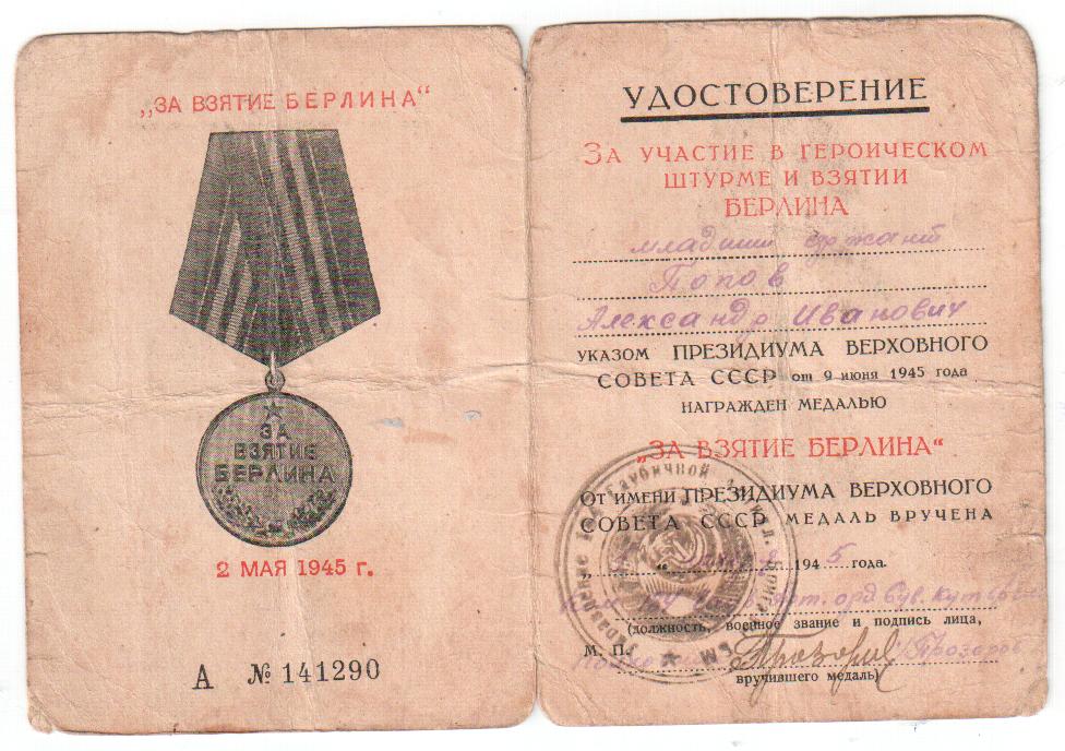 Попов Александр Иванович родился 17 июля 1919 г. в с. Дмитриевка Утёвского района Куйбышевской области (ныне Нефтегорского района Самарской области). Окончил 7 классов в селе Дмитриевка. В 1939 году его забирают в армию. В августе 1941 года он начал службу в артиллерийской разведывательной дивизии – топографом. Войну закончил командиром отделения 26-й бригады тяжёлых миномётов. Ещё целый год он служил в Германии и только 13 мая 1946 года его демобилизовали. Вернулся в родное село, где проработал всю жизнь. Умер 11 марта 2002 г.