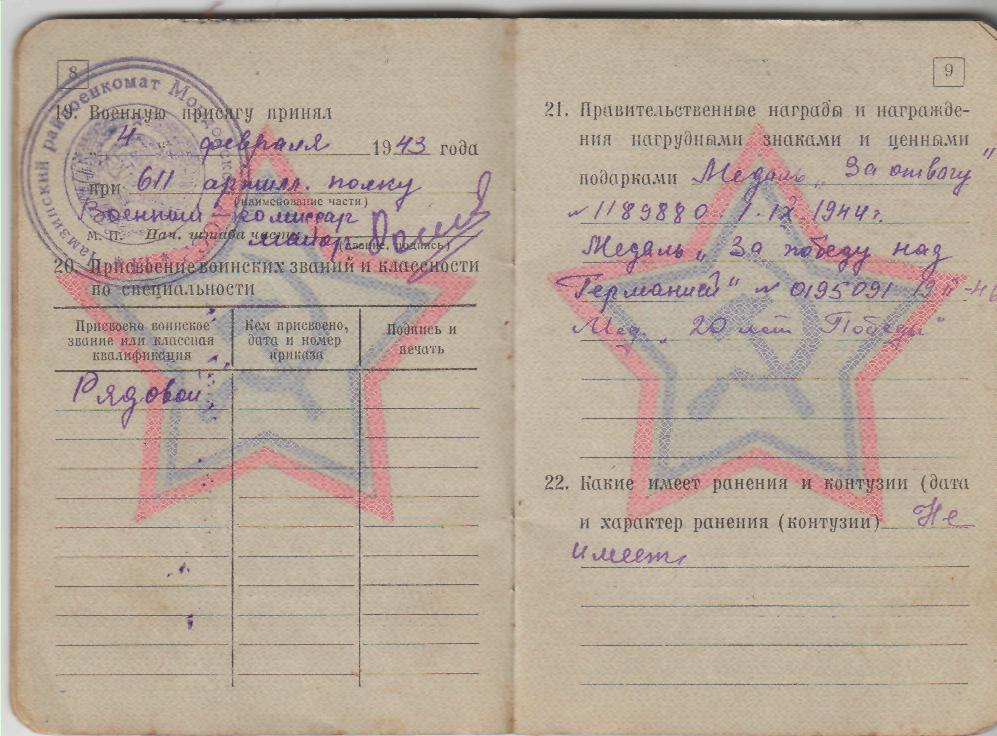 Награды: медаль «За отвагу», медаль «За победу над Германией в Великой Отечественной войне 1941-1945 гг.», «20 лет Победы».