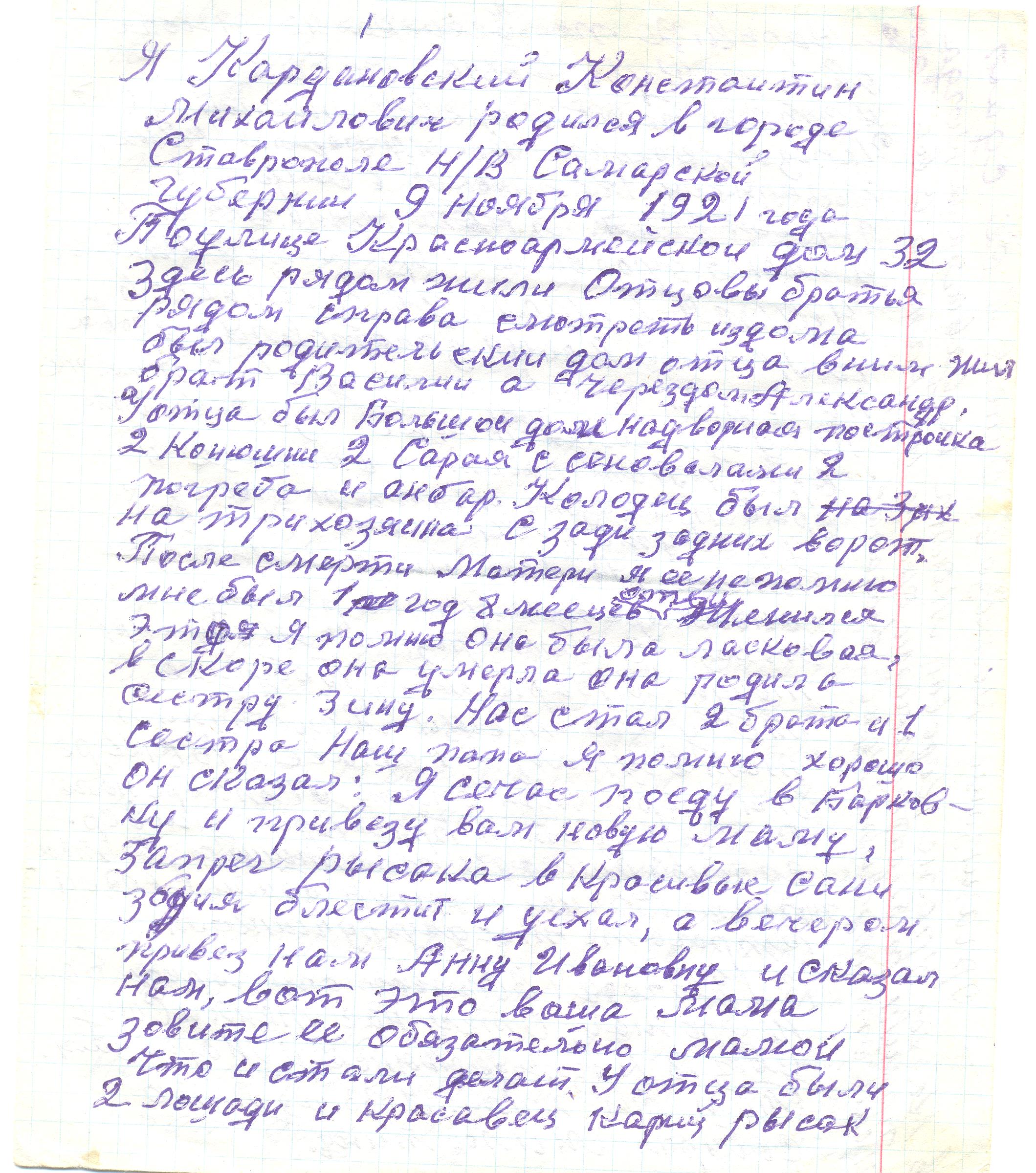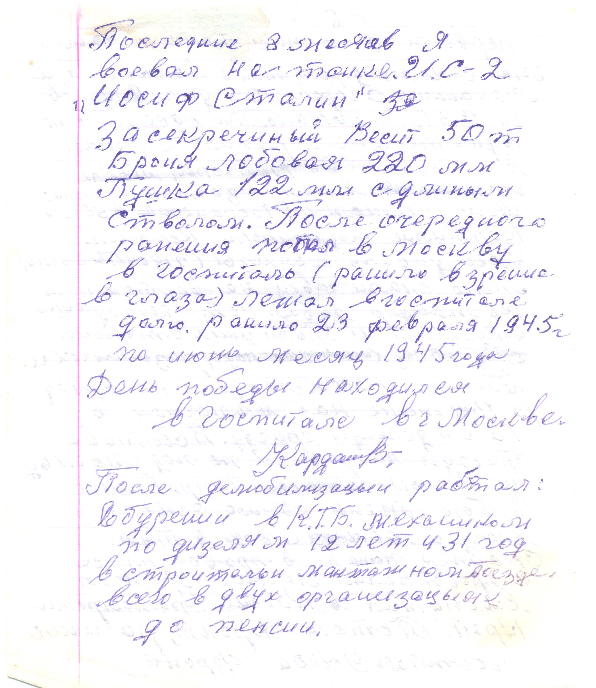 Из автобиографии, написанной Кардановским К.М.: «… Закончил ФЗО в г. Самаре. Направили перед Финской войной в Московскую область г. Рошаль, где я и проработал до армии. Взяли в Красную Армию в 1940 г. Война меня застала в г. Харькове на Украине. Во вторые сутки наш 100-танковый полк погрузили в эшелон и привезли на фронт. В бой вступили, я на танке Т-26 – башенным стрелком. В первом бою наш танк подбили. Мы с командиром танка выскочили, а механик сгорел. Нам дали винтовки С.В.Т. и в каком-то населённом пункте меня ранило. Лежал в госпитале в г. Белгород. После госпиталя в составе запасного полка шли пешком до Воронежа 250 километров. Кормились подножным кормом. Хлеб давали колхозы (пункты были). Мясо гнали, овец, на восток. Наш командир давал соответствующий документ и брали у них столько овец, сколько надо. Резали их, варили. Мясом получали на взвод. В Воронеже нас включили в 18 отдельную бригаду. В составе бригады направили под Москву на Волоколамское направление. В бою меня ранило осколком в ногу и, выходя из боя в тыл, снайпер попал в правое плечо и прострелил лёгкое. Лежал в госпитале в Канске Красноярского края. Потом фронт, ранение, госпиталь, учёба, фронт… Последние 8 месяцев я воевал на танке ИС-2 («Иосиф Сталин», засекреченный). Весит 50 тонн, броня лобовая – 220 мм, пушка – 122 мм с длинным стволом. После очередного ранения попал в Москву, в госпиталь. Лежал в госпитале долго. Ранило в глаза 23 февраля 1945 года и по июнь 1945 года. В День Победы находился в госпитале в Москве…»