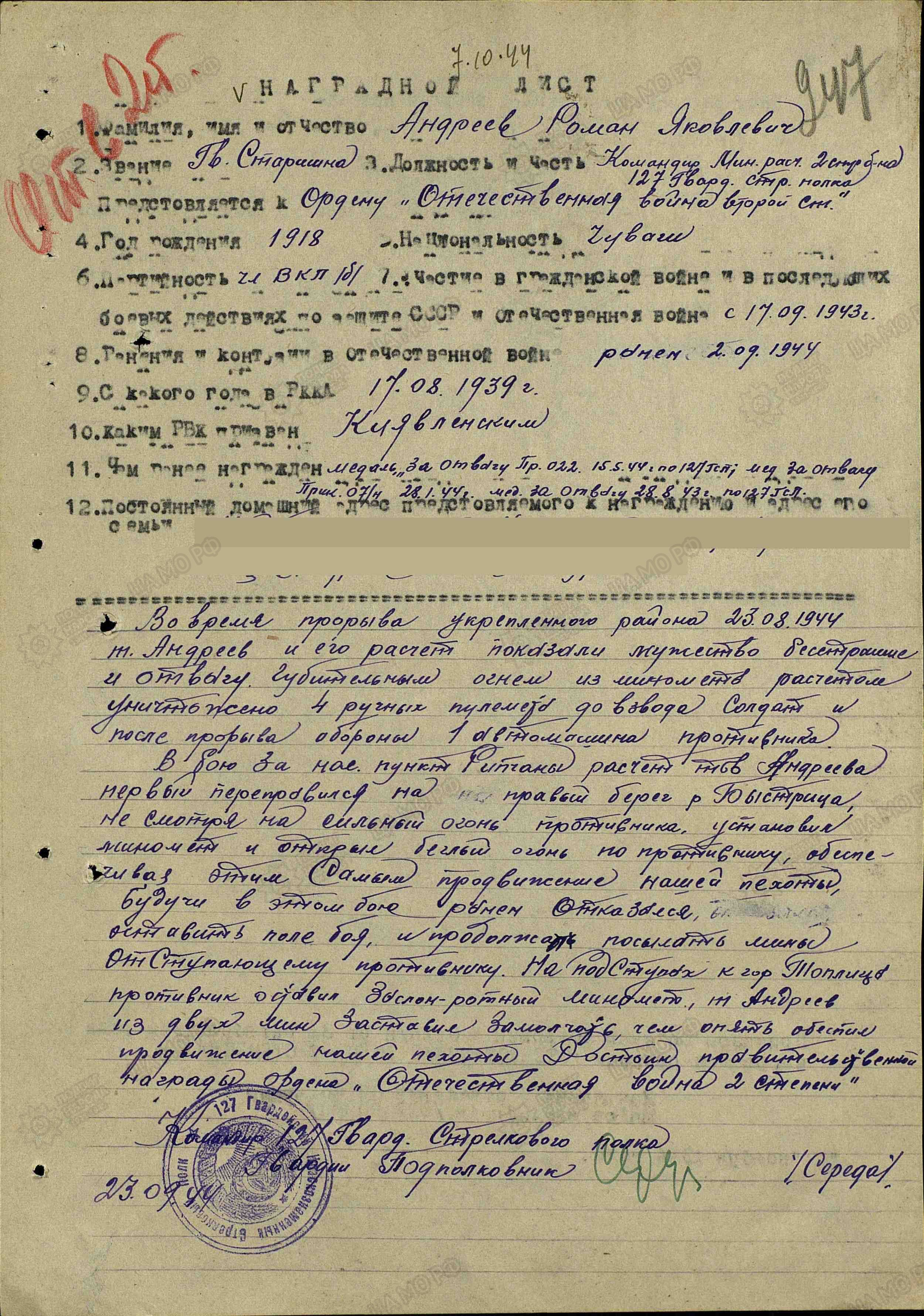 За время прорыва укрепленного района 23 августа 1944 г. тов. Андреев и его расчет показали мужество, бесстрашие и отвагу. Губительным огнем из миномета расчетом уничтожено 4 ручных пулемета, до взвода солдат и после прорыва обороны 1 автомашина противника. В бою за населенный пункт Ританы расчет тов. Андреева первым переправился на правый берег р. Быстрица, несмотря на сильный огонь противника, установил миномет и открыл беглый огонь, обеспечивая продвижение нашей пехоты. Будучи ранен в этом бою, отказался оставить поле боя и продолжал посылать мины отступающему противнику. На подступах к г. Топлица противник оставил заслон – ротный миномет. Тов. Андреев двумя минами заставил его замолчать, чем снова обеспечил продвижение нашей пехоты. Достоин правительственной награды – ордена Отечественной войны II степени (наградной лист от 23.09.1944 г.).