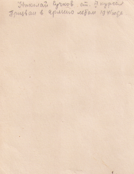 Однокурсник Анастасии Кузнецовой - Сучков Николай, призван в 1941 г. в армию. Надпись на обороте фотографии
