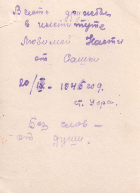 Однокурсница Анастасии Кузнецовой – Александра, ст. Уфа, 1945 г. Надпись на обороте фотографии