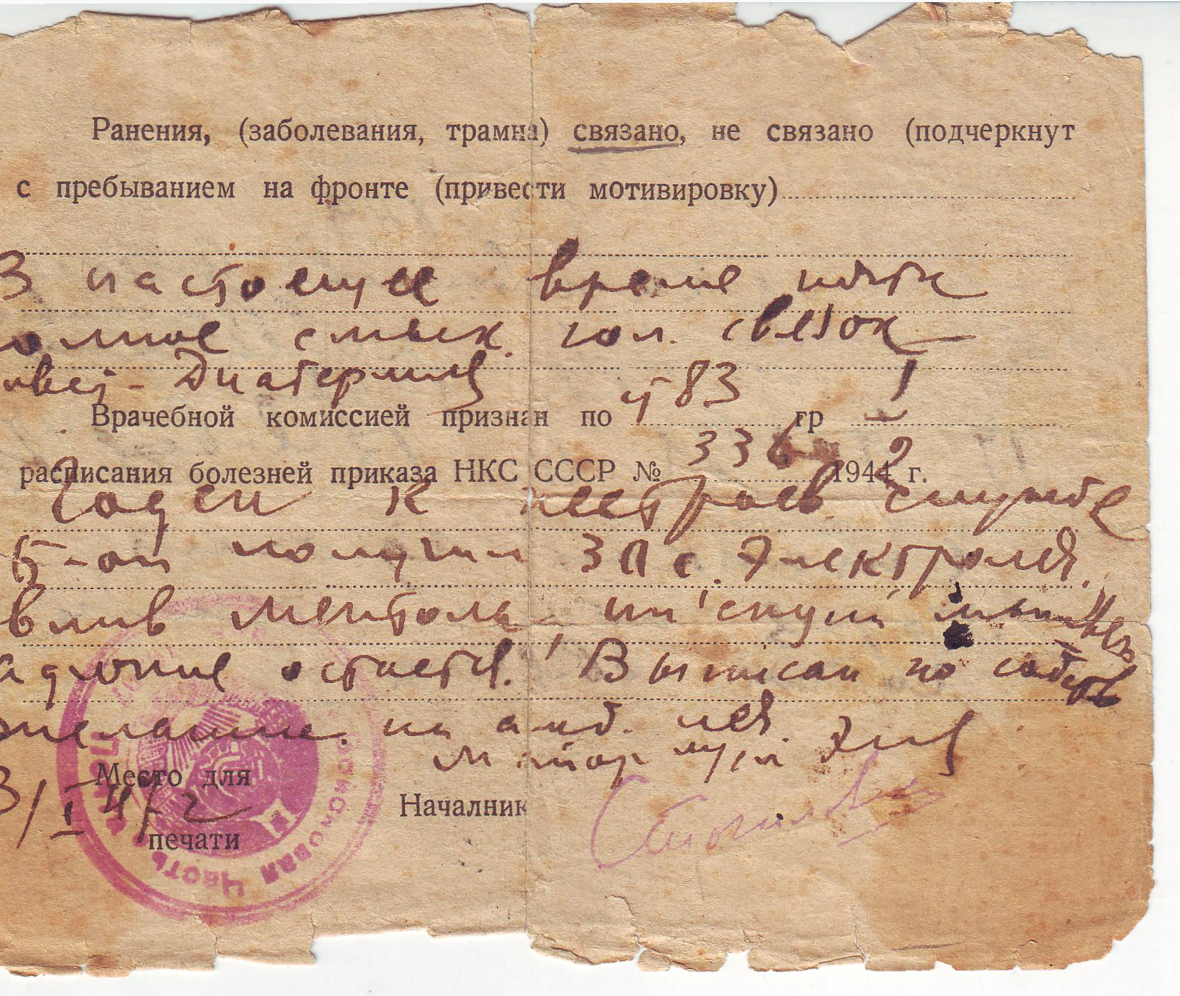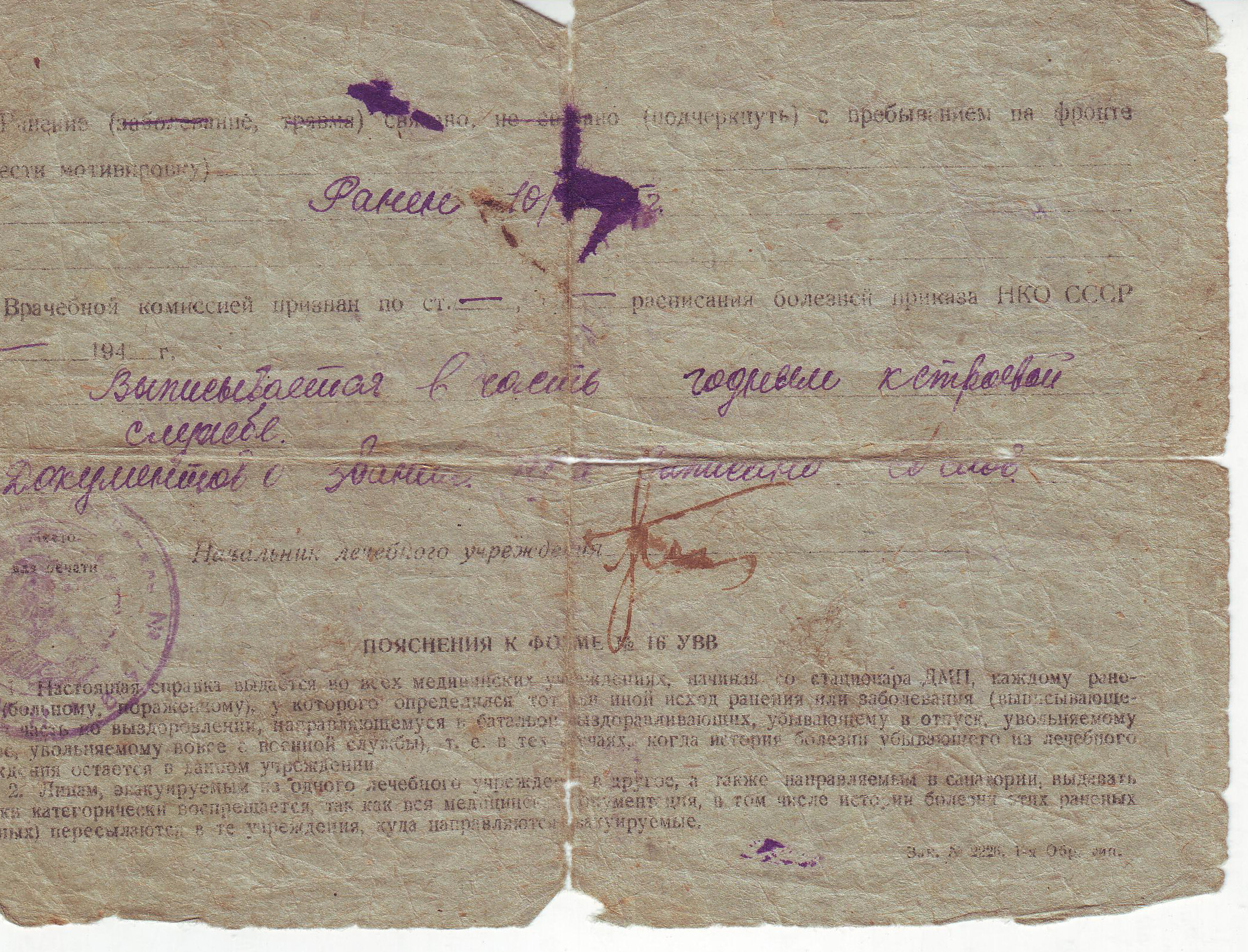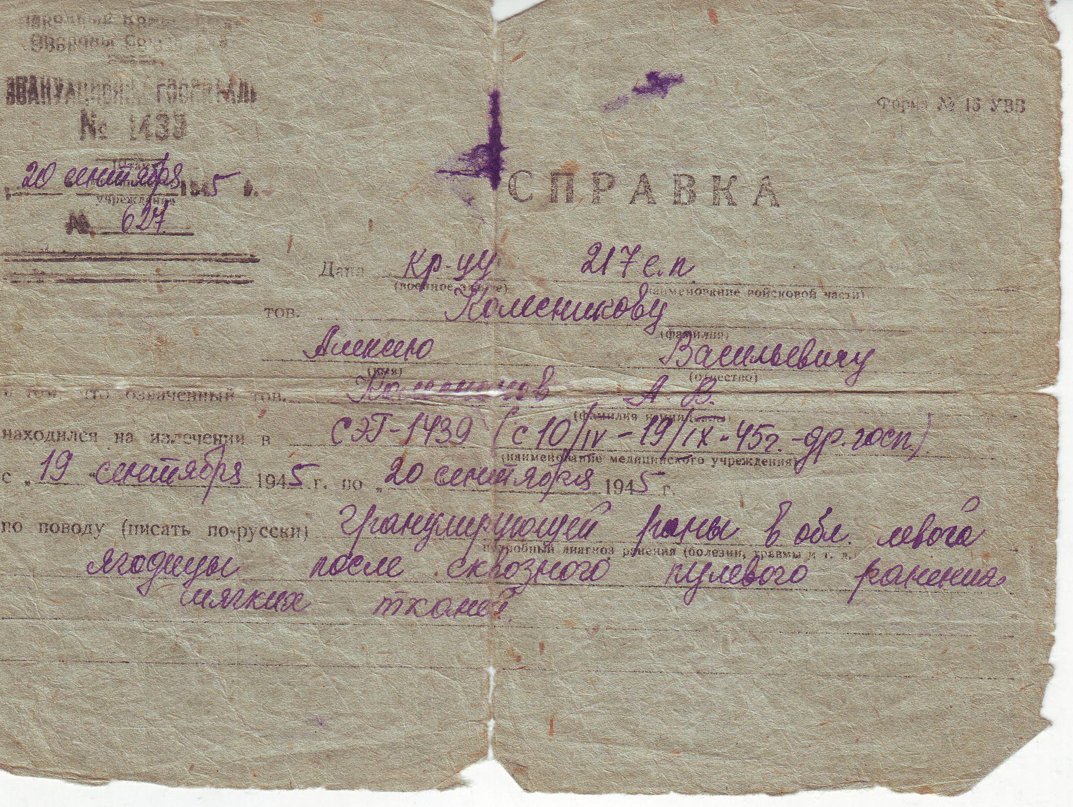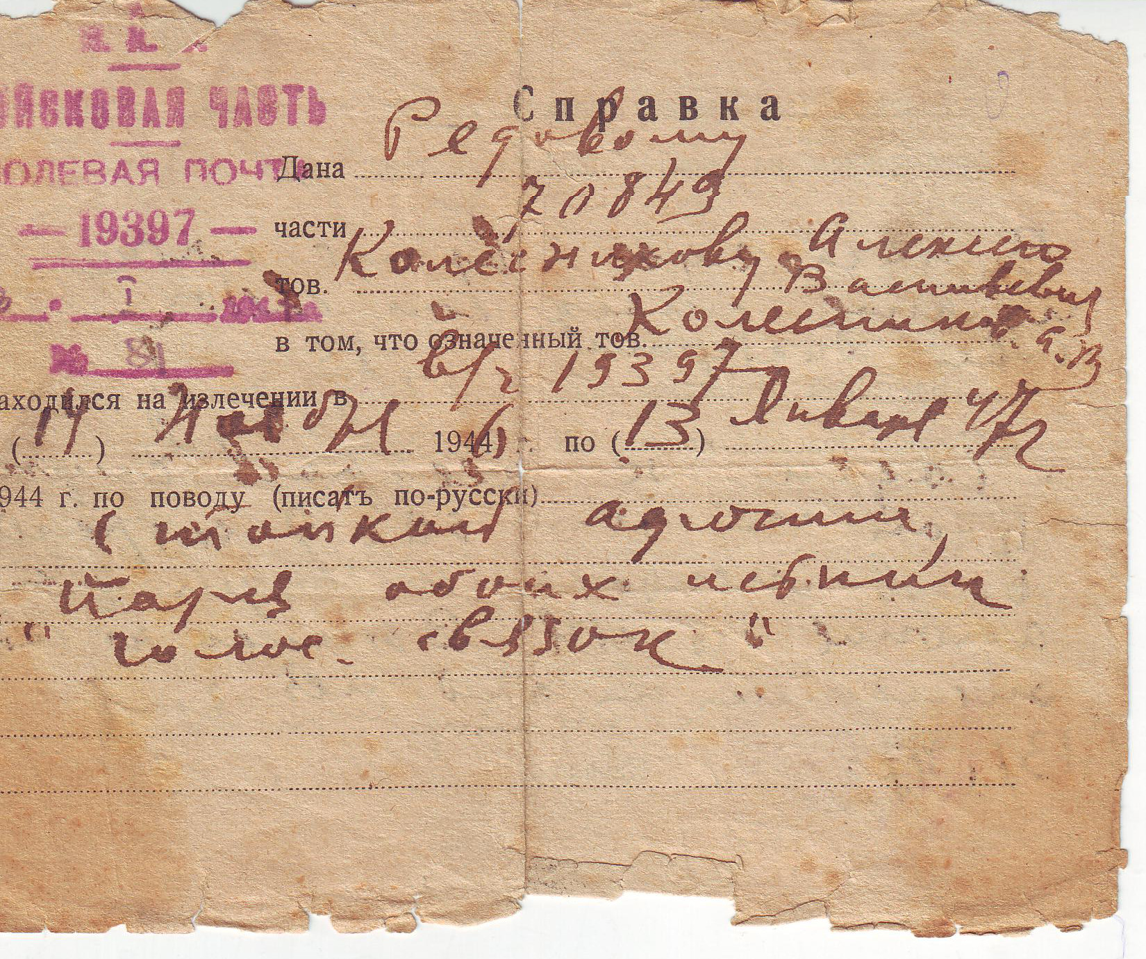 Колесников А.В. Справка о том, что находился на излечении, 1945 г. (2 стр.)