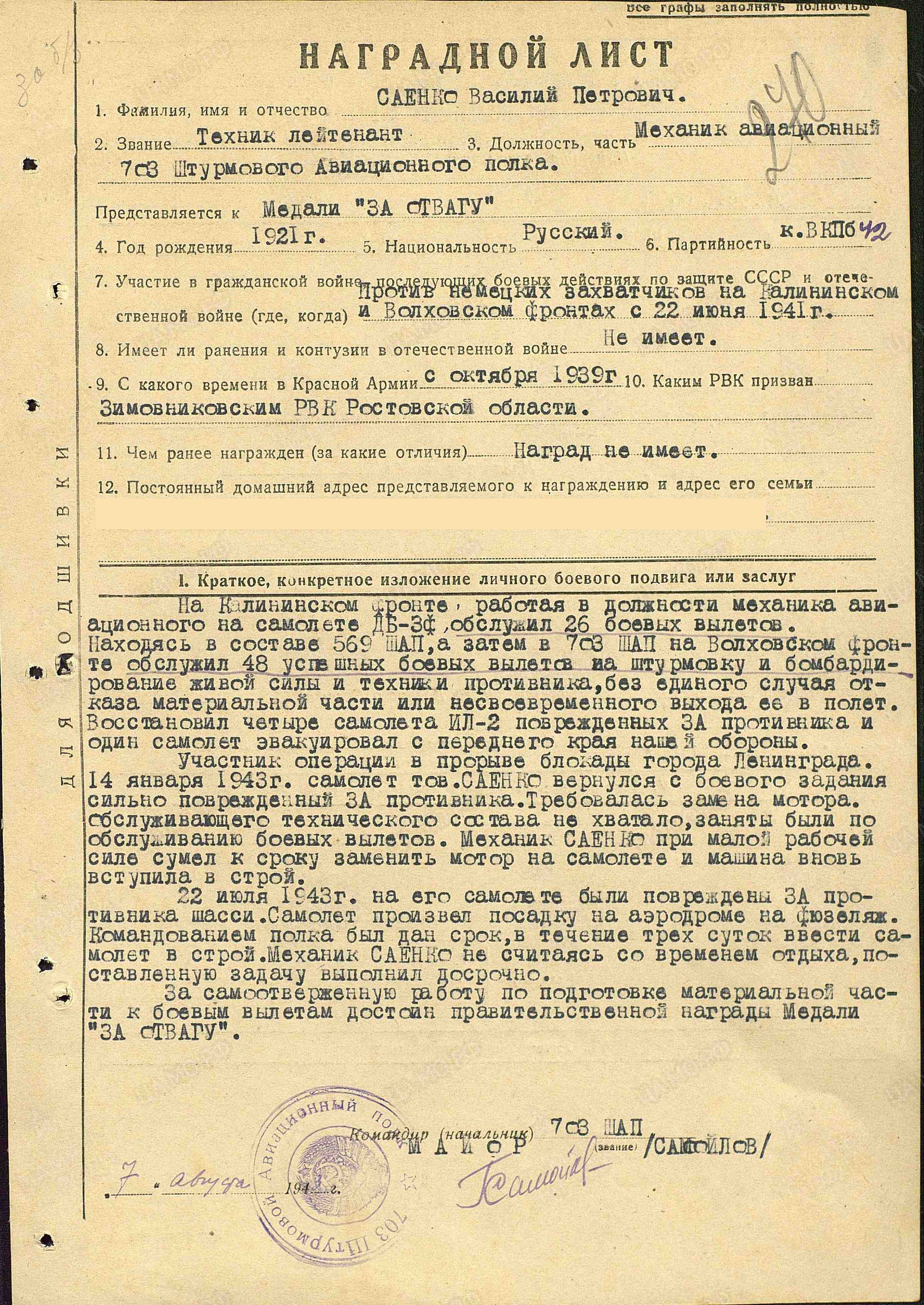 На Калининском фронте, работая в должности механика авиационного на самолете ДБ-3Ф, обслужил 26 боевых вылетов. Находясь в составе 569-го штурмового авиационного полка, а затем в 703-м штурмовом авиационном полку на Волховском фронте, обслужил 48 успешных боевых вылетов на штурмовку и бомбардирование живой силы и техники противника, без единого случая отказа материальной части или ее несвоевременного выхода в полет. Восстановил 4 самолета Ил-2, поврежденных зенитной артиллерией противника и один самолет эвакуировал с переднего края нашей обороны. Участник операции по прорыву блокады города Ленинграда. 14 сентября 1943 г. самолет тов. Саенко вернулся с боевого задания сильно поврежденным зенитной артиллерией противника. Требовалась замена мотора, обслуживающего технического состава не хватало, все были заняты по обслуживанию боевых вылетов. Механик Саенко при малой рабочей силе сумел к сроку заменить мотор на самолете и машина вновь вступила в строй. 22 июля 1943 г. на его самолете зенитной артиллерией были повреждены шасси. Самолет произвел посадку на фюзеляж на аэродроме. Командованием полка был дан срок в течение трех суток ввести самолет в строй. Механик Саенко, не считаясь со временем отдыха, поставленную задачу выполнил досрочно. За самоотверженную работу по подготовке материальной части к боевым вылетам достоин правительственной награды – медали «За отвагу» (награжден медалью «За боевые заслуги»; наградной лист от 7.08.1943 г.).