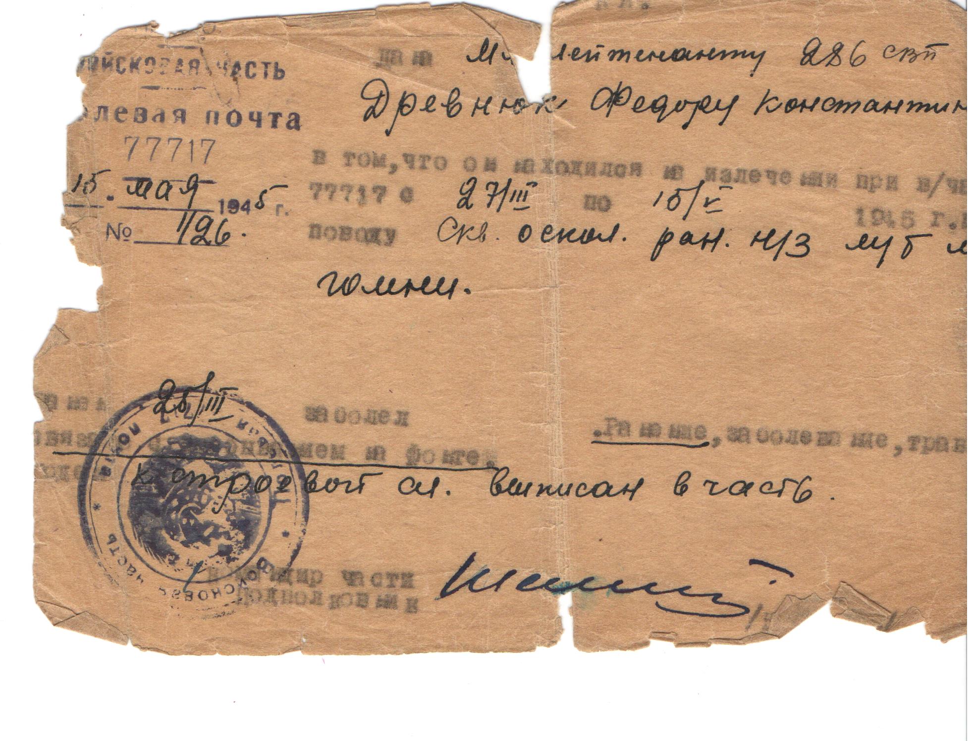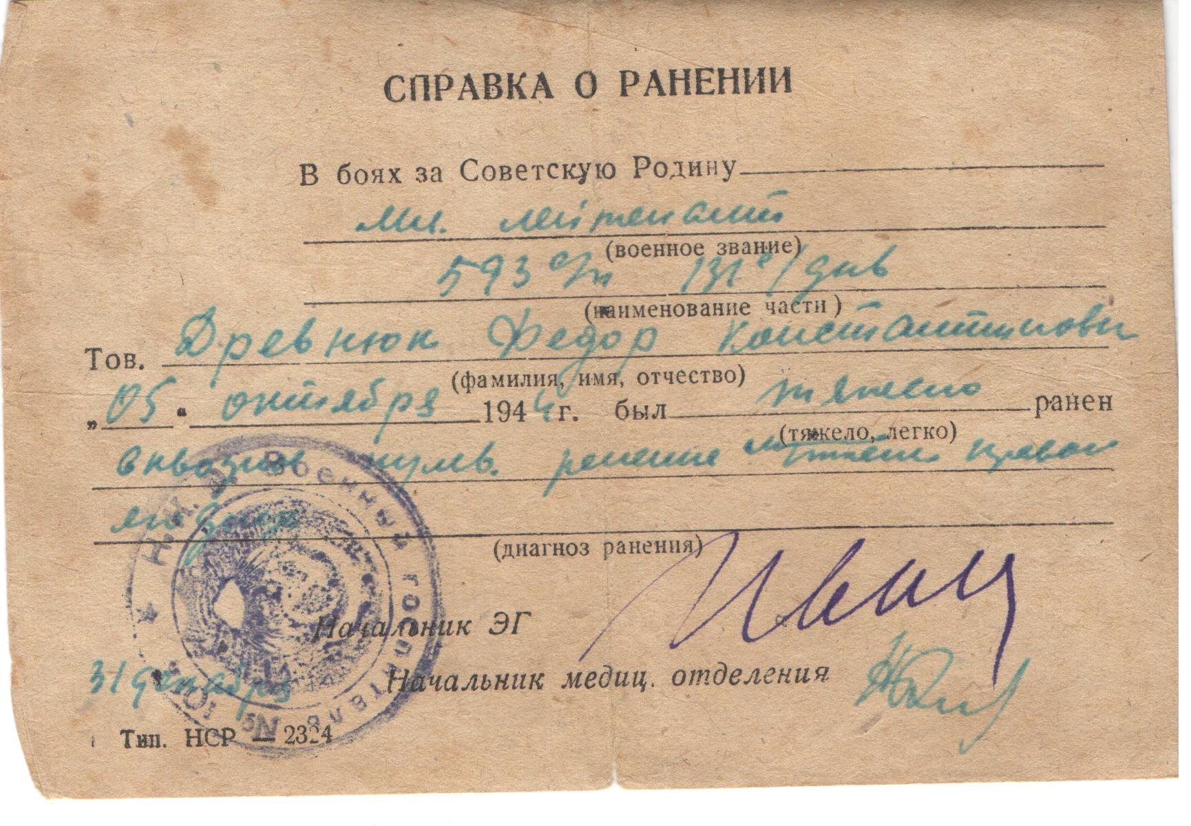 Информация сайта podvignaroda.ru: Тов. Древнюк на фронте борьбы с немецкими захватчиками был ранен в грудную клетку в составе 19-го стрелкового полка 80-й стрелковой дивизии, в левую голень в составе 191-го стрелкового полка 64-й стрелковой дивизии, в правую кисть в составе 593-го стрелкового полка 131-й стрелковой дивизии и в левую голень в составе 286-го стрелкового полка 90-й стрелковой дивизии. По поводу последнего ранения находится на излечении в госпитале №3103. По выздоровлению вернется в строй. Представляется к ордену Красной Звезды (наградной лист от 16.05.1945 г.).