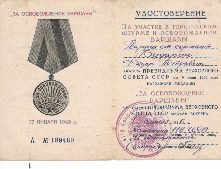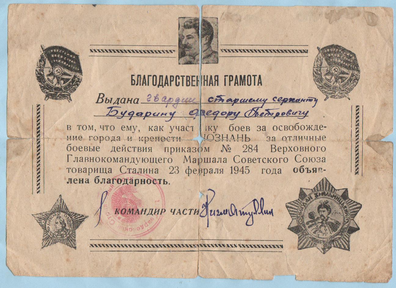 Тов. Бударин, участвуя в боях при прорыве долговременной обороны немцев на Вислинском плацдарме, показал себя смелым и умелым командиром Красной армии. Тов. Бударин, в этом бою действуя смело и решительно, вместе со своим расчетом участвуя в отражении контратаки, уничтожил до роты пехоты, один крупнокалиберный пулемет и 4 пулеметные точки противника. Участвуя в уличных боях за г. Познань, лично сам из своего миномета точным огнем уничтожил до взвода пехоты, 2 крупнокалиберных пулемета и одну пушку открытой позиции. За проявленные мужество и отвагу достоин награждения орденом Славы III степени (наградной лист от 1.04.1945 г.).