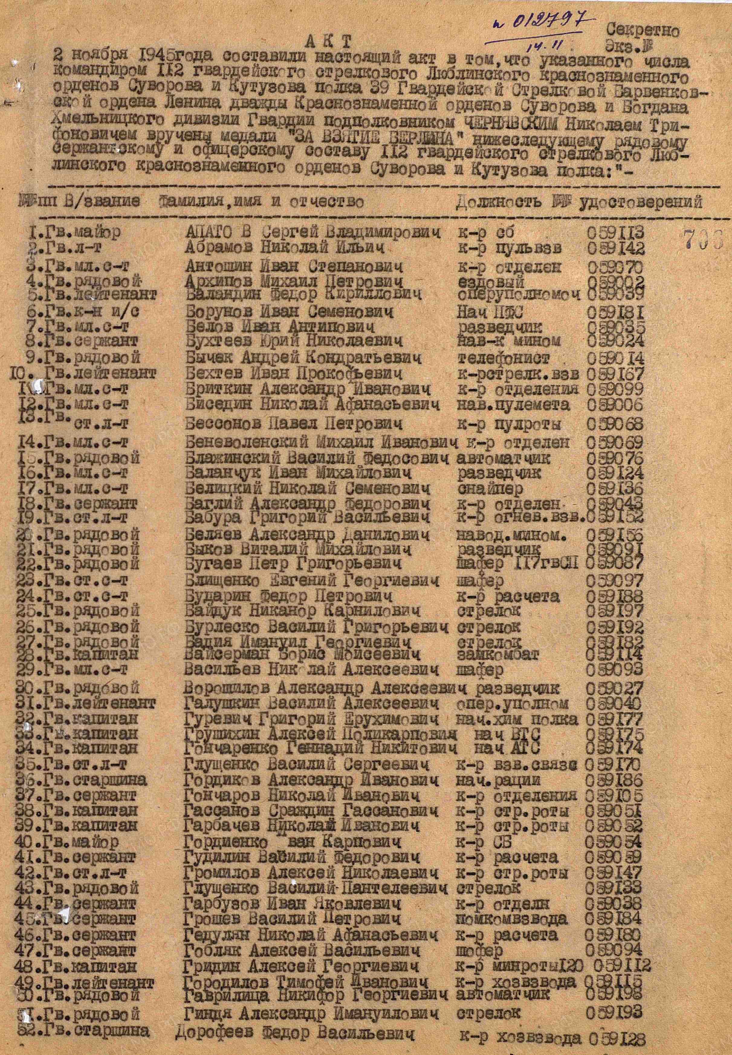 Во время артподготовки при прорыве глубокоэшелонированной обороны немцев на западном берегу р. Одер его расчет вел точный и смертельный огонь по огневым средствам противника. В этом бою подавил 8 огневых точек. В боях за высоту 58,0 и за плацдарм на р. Шпрее его расчет уничтожил до 70 немецких солдат, 4 огневых минометных точки. Достоин правительственной награды – ордена Красной Звезды (наградной лист от 27.04.1945 г.).