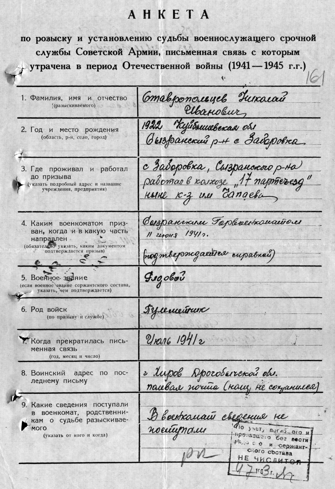 Николай Иванович Ставропольцев родился в 1922 году в селе Заборовка.