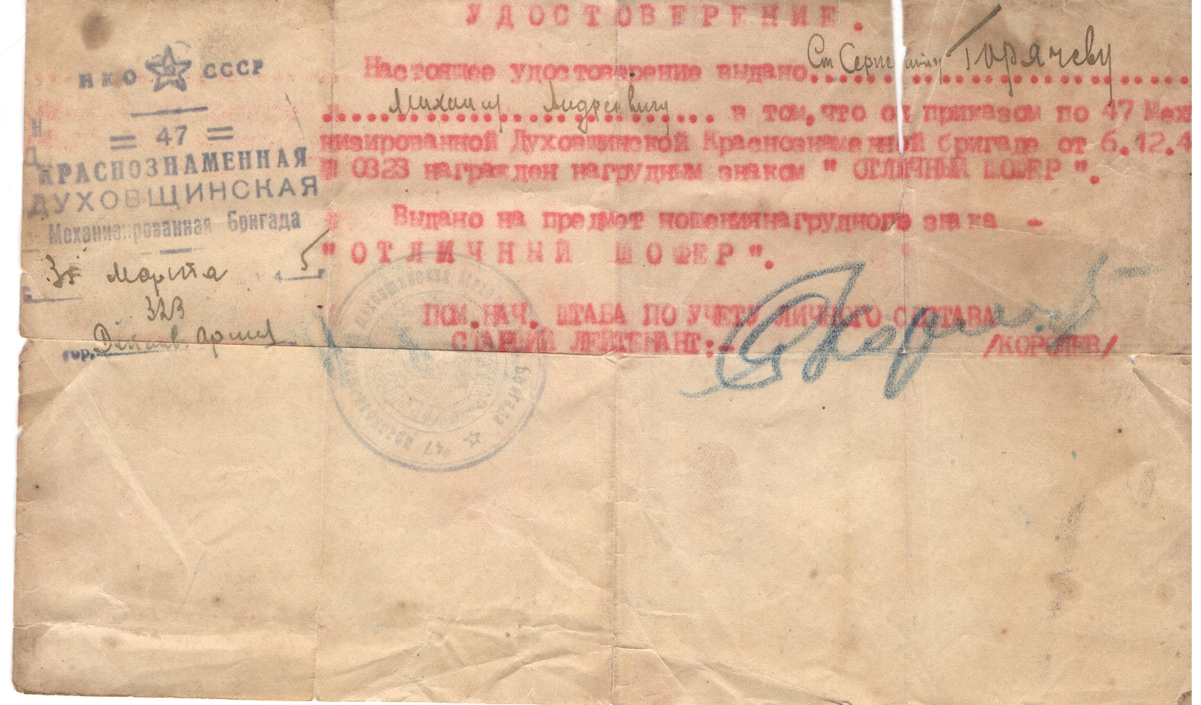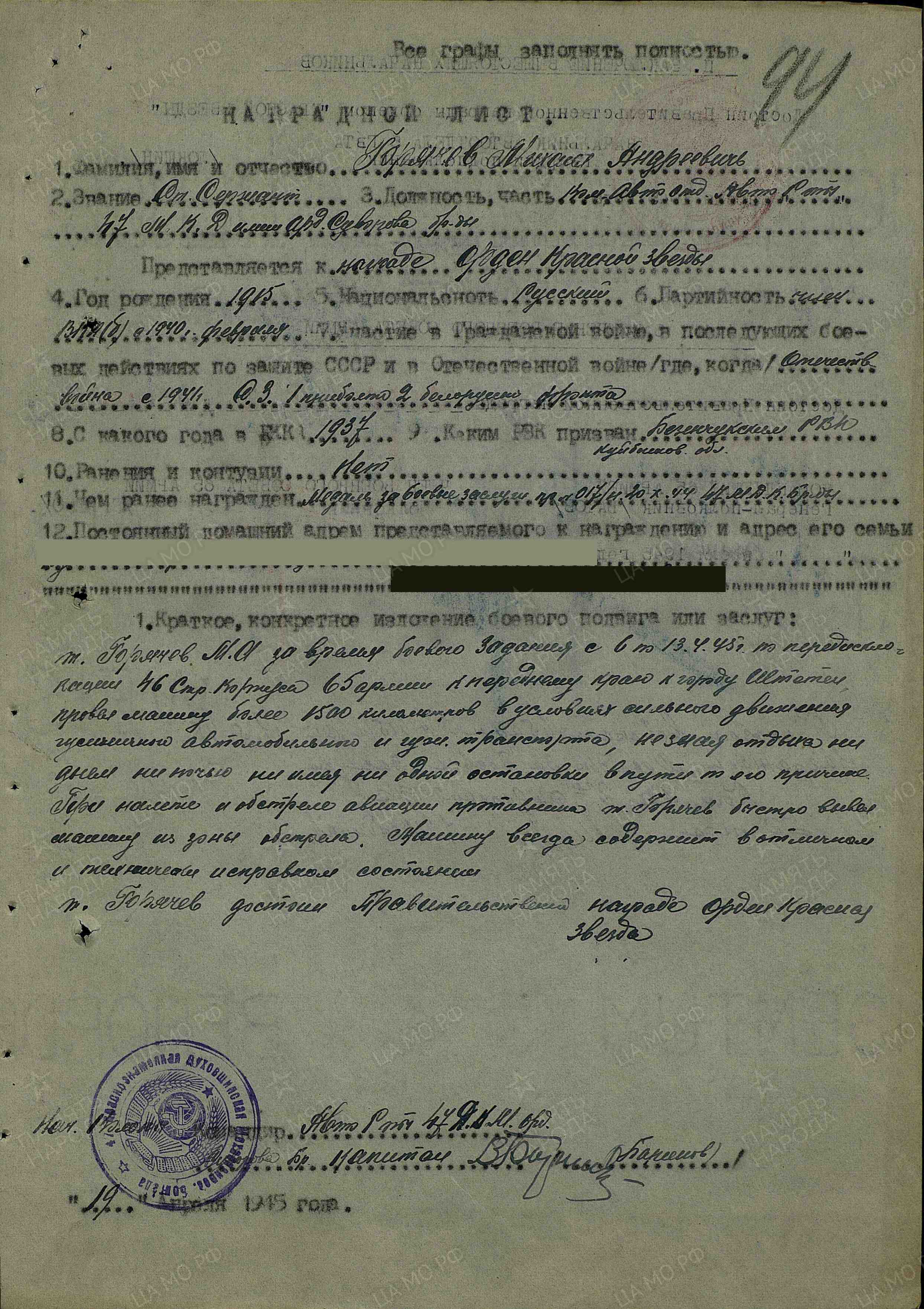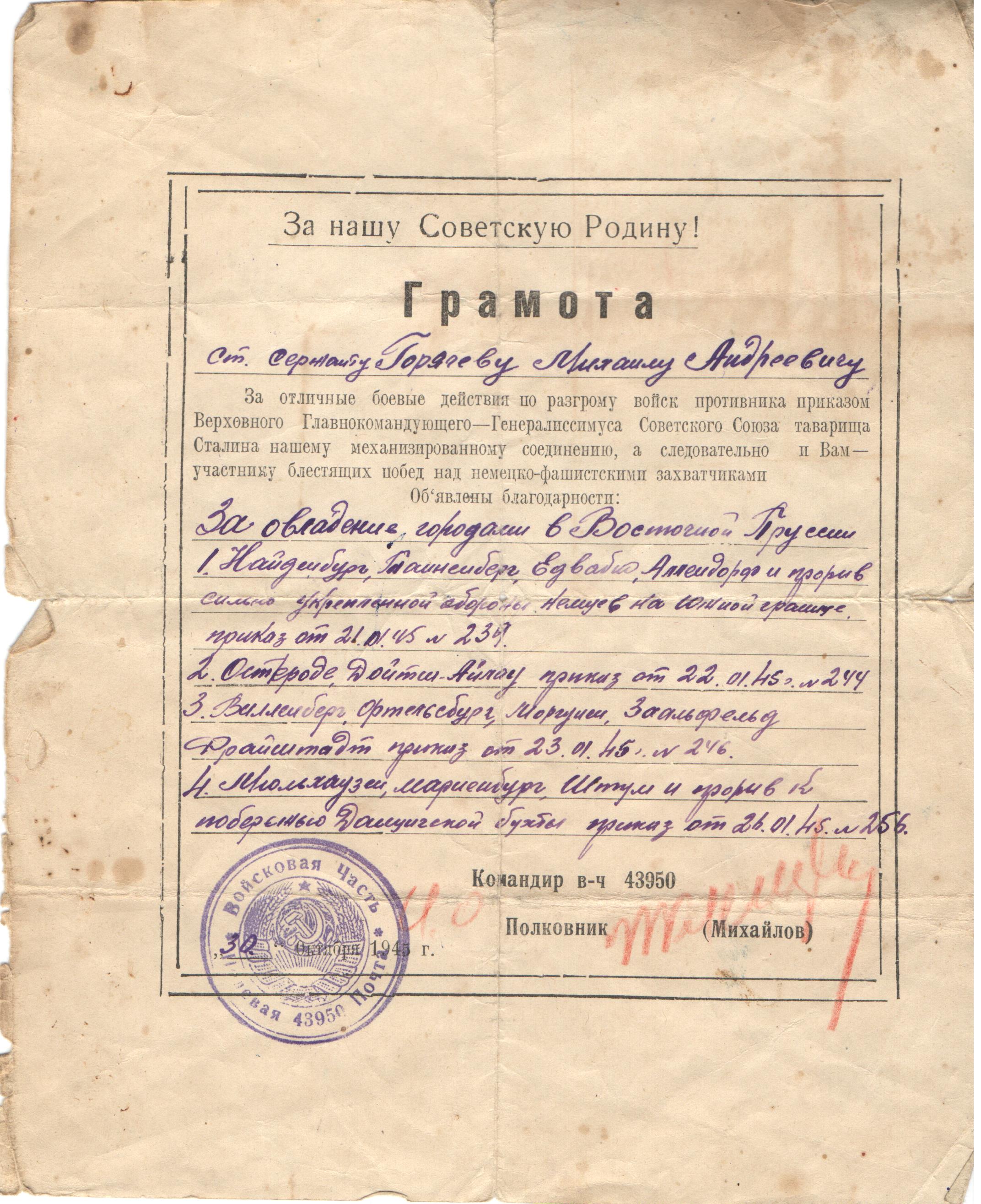 Тов. Горячев М.А. за время боевого задания с 6 по 13 апреля 1945 г. по передислокации 46-го стрелкового корпуса 65-й армии к переднему краю к г. Штеттин (ныне Щецин, Польша) провел машину на расстояние в 1500 км в условиях сильного движения гусеничного, автомобильного и гужевого транспорта, не зная отдыха ни днем, ни ночью и не имея ни одной остановки в пути по его причине. При налете и обстреле авиации противника тов. Горячев быстро вывел машину из зоны обстрела. Машину всегда содержит в отличном и технически исправном состоянии. Тов. Горячев достоин правительственной награды – ордена Красной Звезды (награжден медалью «За боевые заслуги»; наградной лист от 19.04.1945 г.).