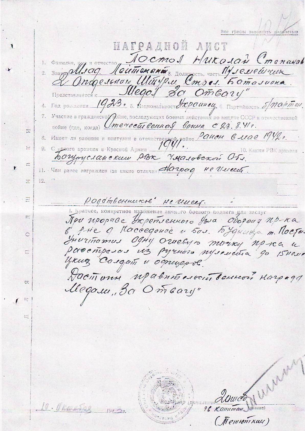 Совершив побег из плена и перейдя линию фронта, Николай Степанович заболел тифом. Добравшись до расположения советских войск, он проходил лечение в госпитале с. Пески Воронежской области. После лечения, пройдя проверочно-фильтрационный лагерь, Николай попал во 2-й отдельный штурмовой стрелковый батальон. Для сведения, в штурмовые батальоны зачислялись военнослужащие начсостава, находившиеся в плену или окружении противника. Срок пребывания – 2 месяца участия в боях. Николай Степанович не был разжалован, его не лишили воинского звания, поэтому он попал в штурмовой батальон.