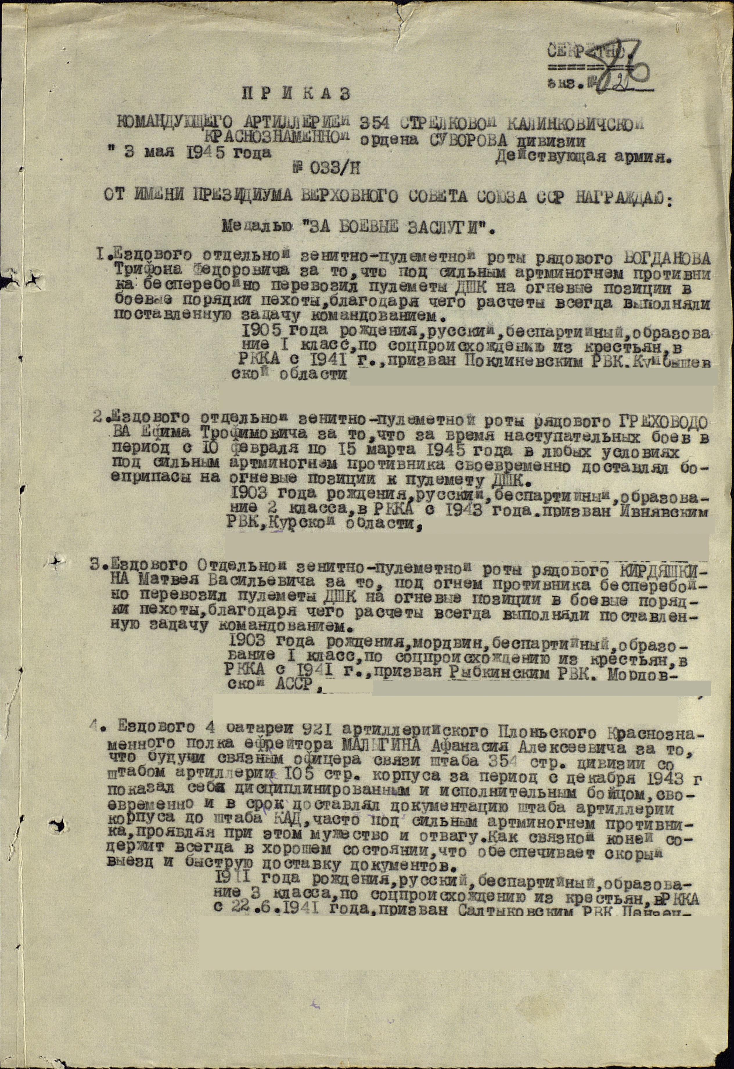 Снова был призван по мобилизации в 1941 г. Служил в звании рядового, в должности ездового отдельной зенитно-пулеметной роты 354-й стрелковой дивизии.