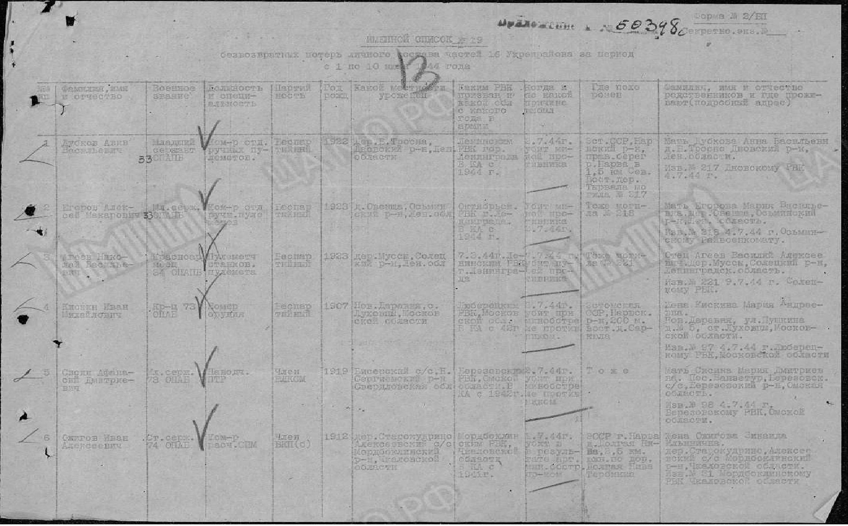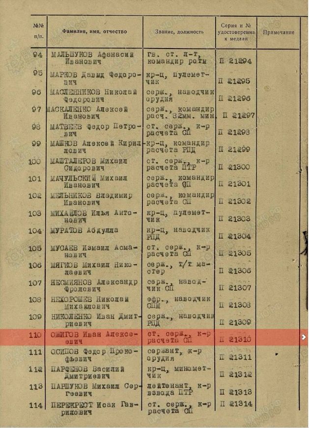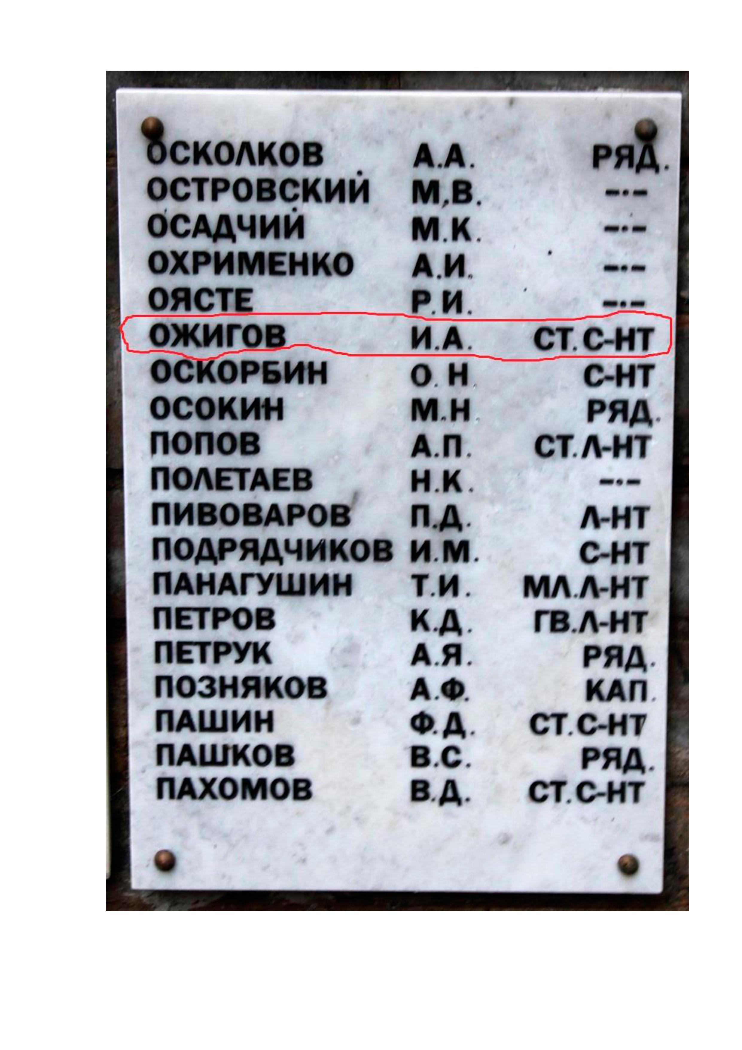 Война для моего деда Ивана началась раньше Великой Отечественной. Он был призван в 1939 на финскую. Воевал в звании старший сержант в составе 74 отдельного пулеметно-артиллерийского батальона (опаб). Командовал боевой машиной реактивной артиллерии БМ-13 («Катюша»). Был награжден медалью «За оборону Ленинграда». Старший сержант Ожигов И.А. погиб в результате артобстрела 1 июля 1944 г. Согласно архивным данным ЦАМО РФ Ожигов Иван Алексеевич похоронен: д. Долгая Нива, южнее 2,5 км по дороге Долгая Нива – Тербинка (Эстония). Несколько позднее был перезахоронен в г. Ивангород (по данным ОБД "Мемориал" в этой братской могиле захоронено 1893 человека).