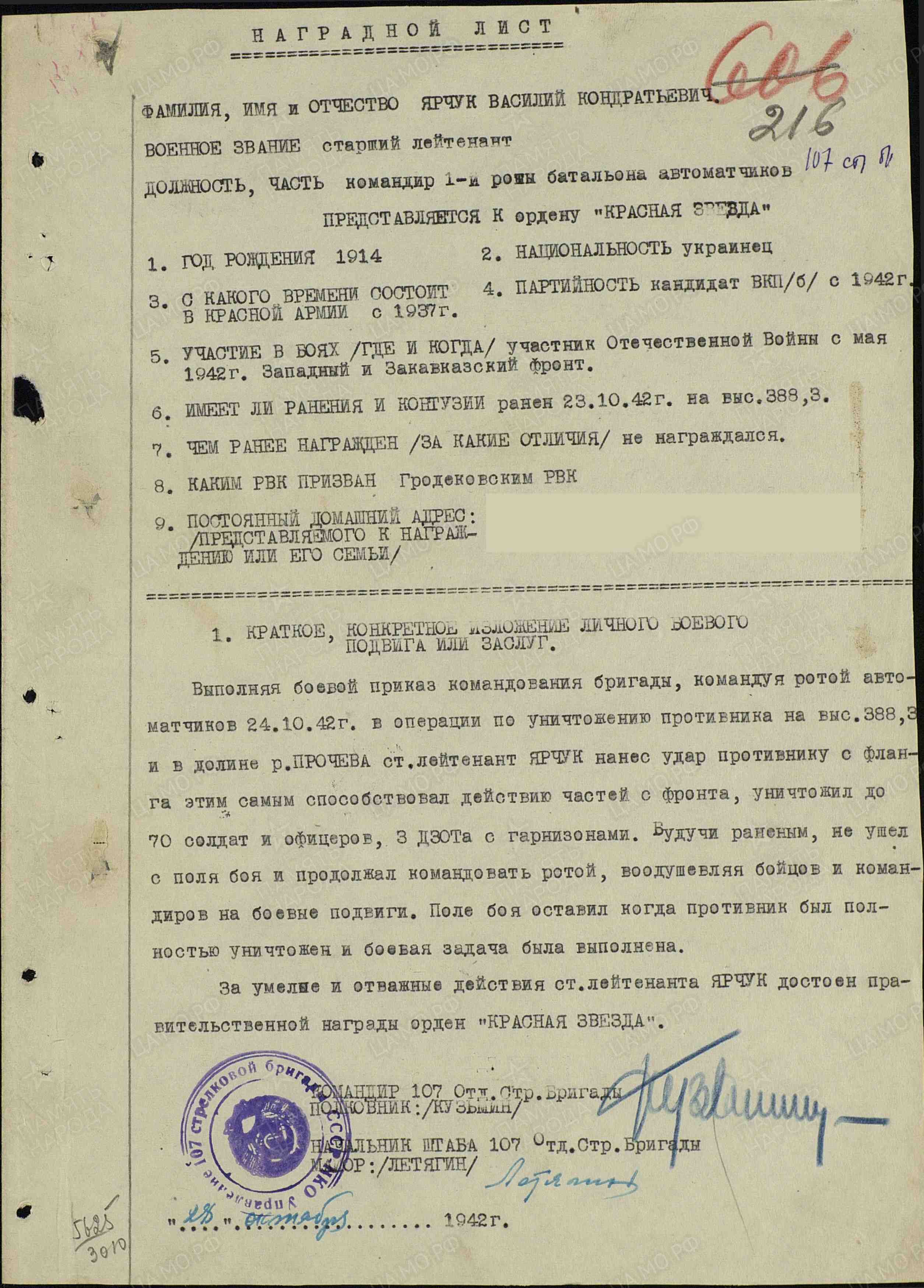 Выполняя боевой приказ командования бригады, командуя ротой автоматчиков, 24 октября 1942 г. в операции по уничтожению противника на высоте 388,3 и в долине р. Прочева (Кубань), старший лейтенант Ярчук нанес удар противнику с фланга, тем самым способствовал действию частей фронта, уничтожил до 70 солдат и офицеров, 3 дзота с гарнизонами. Будучи раненым, не ушел с поля боя и продолжал командовать ротой, воодушевляя бойцов и командиров на боевые подвиги. Поле боя оставил, когда противник был полностью уничтожен и боевая задача была выполнена. За умелые и отважные действия старший лейтенант Ярчук достоин правительственной награды - ордена Красной Звезды (наградной лист от 28.10.1942 г.).