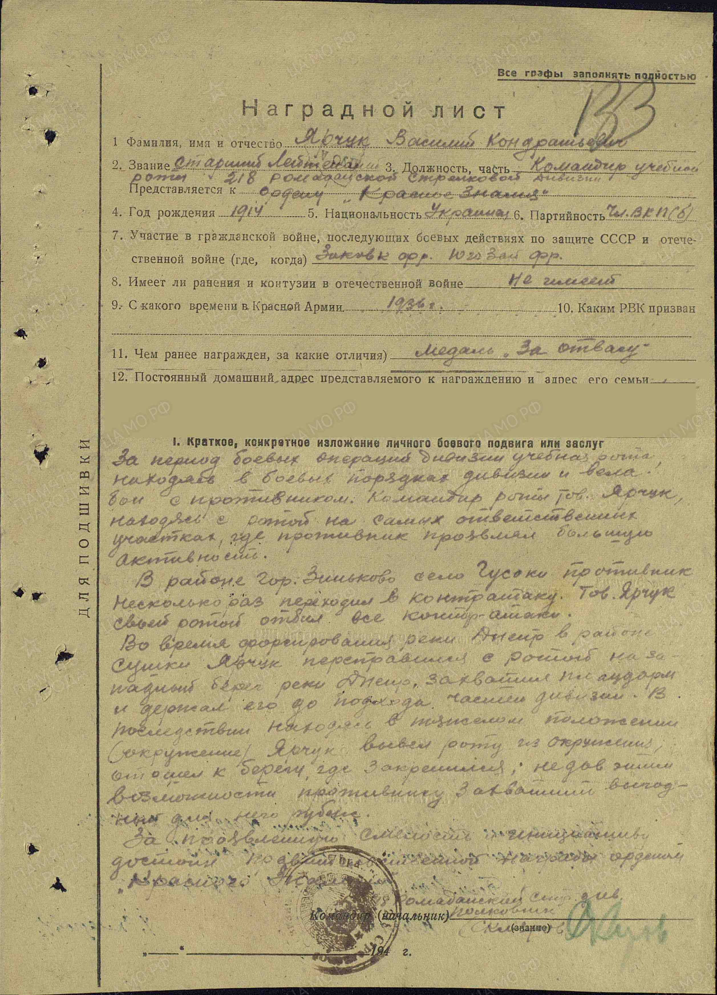 За период боевых операций дивизии учебная рота, находясь в боевых порядках дивизии, вела бои с противником. Командир роты тов. Ярчук находился с ротой на самых ответственных участках, на которых противник проявлял большую активность. В районе г. Зиньково и д. Гусаки противник несколько раз переходил в контратаки. Тов. Ярчук своей ротой отбил все контратаки. Во время форсирования р. Днепр в районе Сушки Ярчук переправился с ротой на западный берег р. Днепр, захватил плацдарм и держал его до подхода частей дивизии. Впоследствии, находясь в тяжелом положении (окружение), Ярчук вывел роту из окружения, отошел к берегу, где закрепился, не давая противнику возможности захватить выгодный для него рубеж. За проявленные смелость и инициативу достоин правительственной награды – ордена Красного Знамени (наградной лист от 24.10.1943 г.).