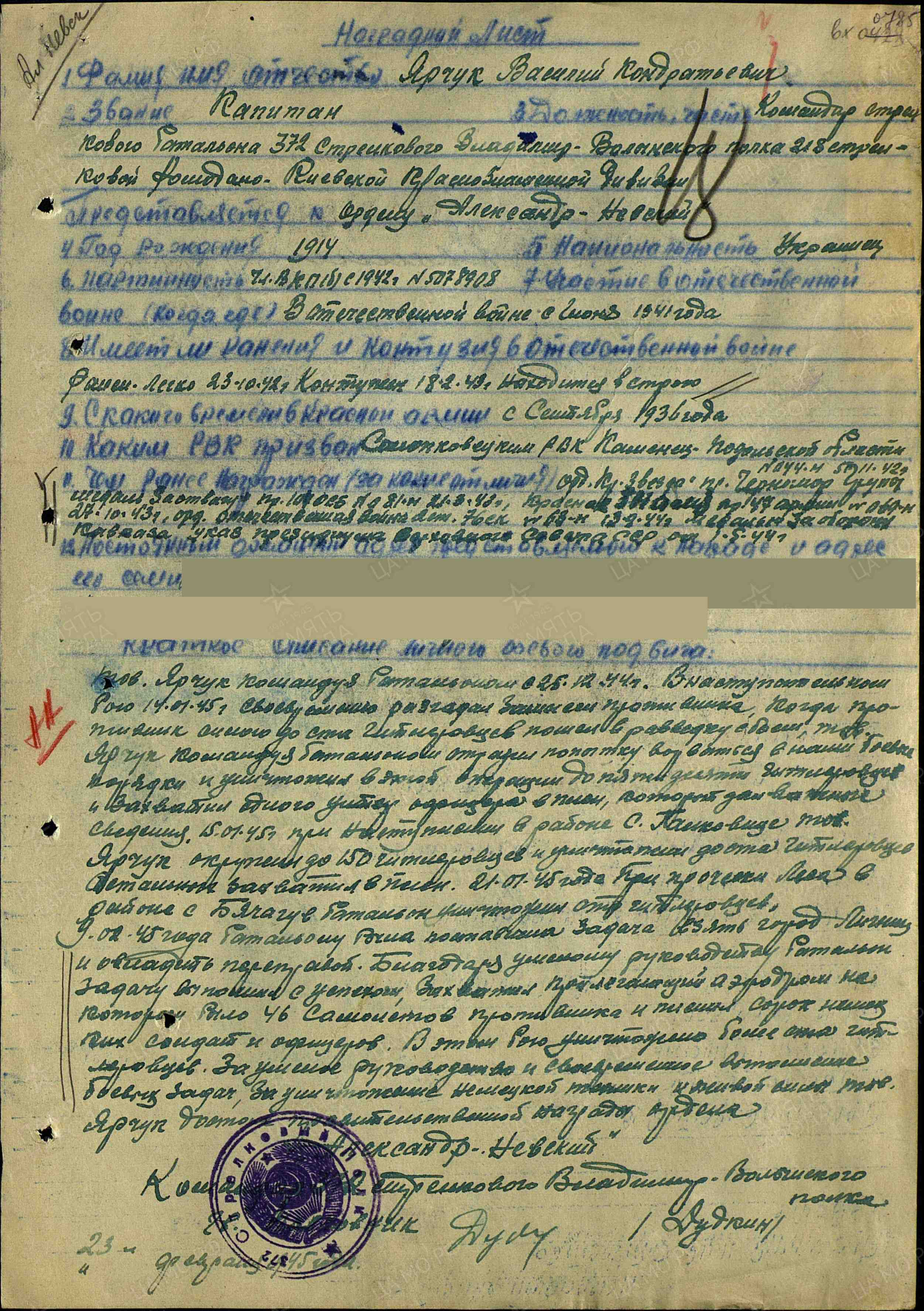Тов. Ярчук командует батальоном с 25 декабря 1944 г. В наступательном бою 14 января 1945 г. своевременно разгадал замысел противника. Когда противник силою до ста гитлеровцев пошел в разведку с боем, тов. Ярчук, командуя батальоном, отразил попытку ворваться в наши боевые порядки и уничтожил в этой операции до пятидесяти гитлеровцев и захватил одного унтер-офицера в плен, который дал важные сведения. 15 января 1945 г. при наступлении в районе с. Панковице тов. Ярчук окружил до 150 гитлеровцев и уничтожил до 100 гитлеровцев, остальных взял в плен. 21 января 1945 г. при прочесывании леса в районе с. Бячагув батальон уничтожил отряд гитлеровцев. 9 февраля 1945 г. батальону была поставлена задача взять город Лигниц (г. Легница, Польша) и овладеть переправой. Благодаря умелому руководству батальон задачу выполнил с успехом, захватил прилегающий аэродром, на котором было 46 самолетов противника и пленил сорок немецких солдат и офицеров. В этом бою уничтожено больше ста гитлеровцев. За умелое руководство и своевременное выполнение боевых задач, за уничтожение немецкой техники и живой силы тов. Ярчук достоин правительственной награды – ордена Александра Невского (наградной лист от 23.02.1945 г.).