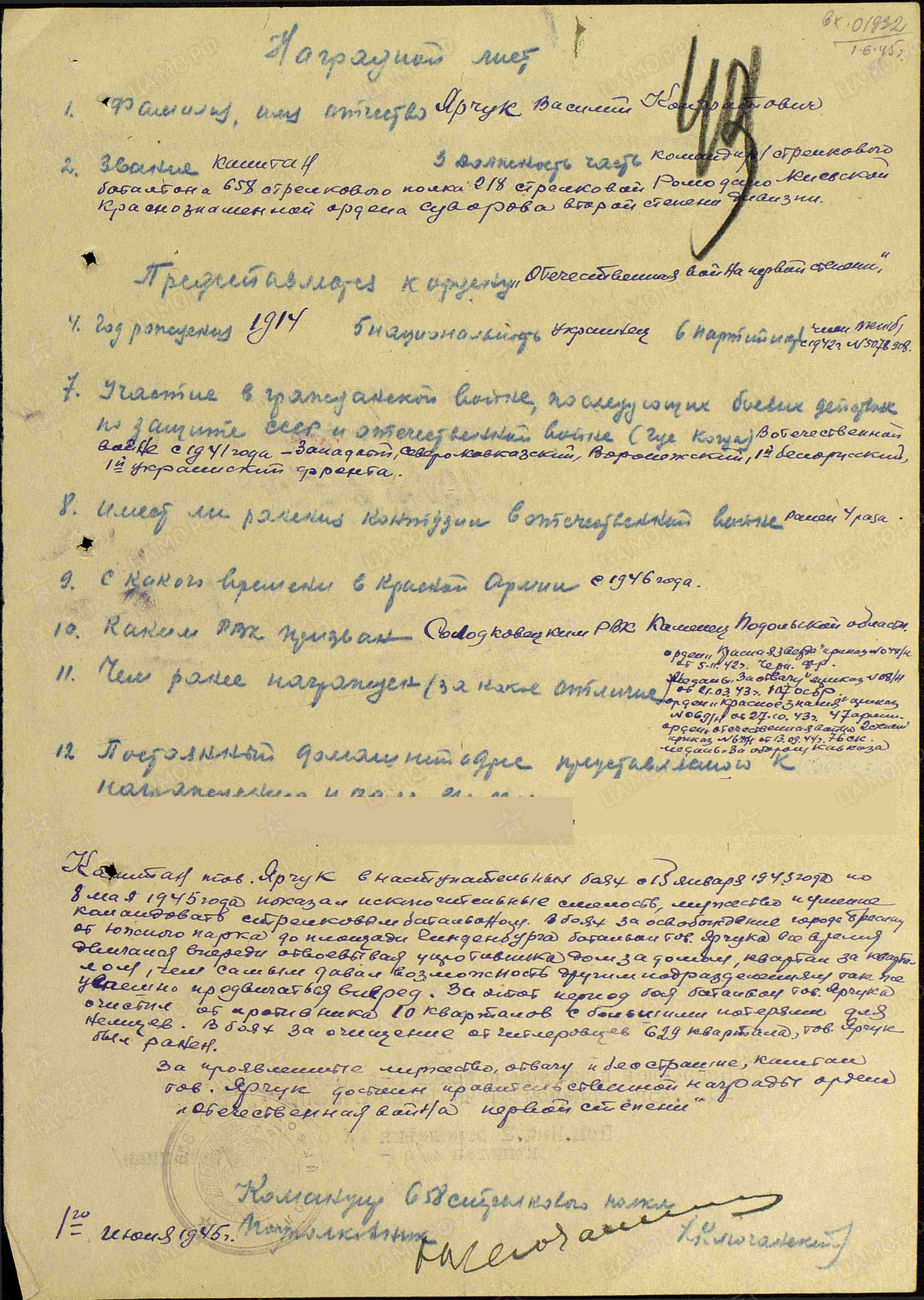 Капитан тов. Ярчук в наступательных боях с 15 января по 8 мая 1945 г. показа исключительные смелость, мужество и умение командовать стрелковым батальоном. В боях за освобождение г. Бреслау от южного парка до площади Гинденбурга батальон тов. Ярчука все время двигался впереди, отвоевывая у противника дом за домом, квартал за кварталом, чем давал возможность другим подразделениям так же успешно продвигаться вперед. За этот период боя батальон тов. Ярчука очистил от противника 10 кварталов с большими потерями для немцев. В боях за очищение от гитлеровцев 629-го квартала тов. Ярчук был ранен. За проявленные мужество, отвагу и бесстрашие капитан тов. Ярчук достоин правительственной награды – ордена Отечественной войны I степени (наградной лист от 1.06.1945 г.).