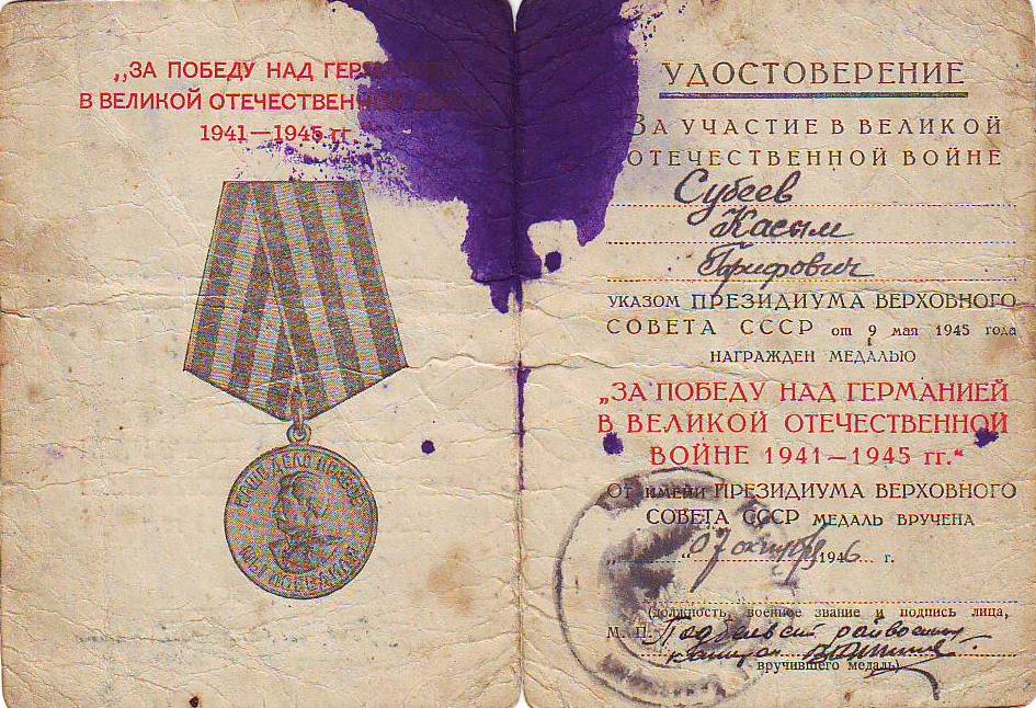 В конце 1945 года Касым Гарифович Субеев возвращается в село, обзаводится семьей, работает в колхозе. В 1974 году Касым Гарифович получает трудовое увечье – лишается одного глаза – и переходит на работу заведующим складом вплоть до ухода на пенсию. Умер Касым Гарифович в возрасте 85 лет 26 августа 2008 года. Похоронен в родном селе. 6 детей, 12 внуков, 18 правнуков с благодарностью и гордостью помнят своего отца, деда и прадеда. Честь и слава фронтовикам, защитившим нашу Родину!