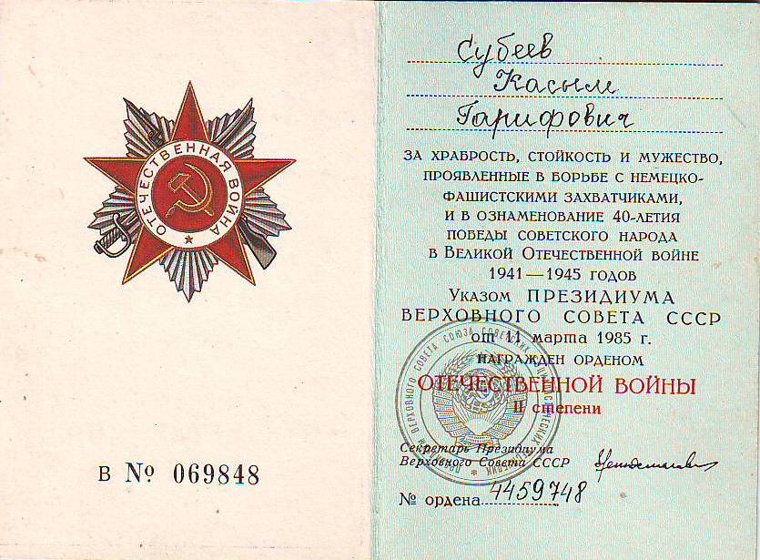 Субеев Касым Гарифович родился 18 апреля 1925 года в селе Мочалеевка. После смерти отца в 1938 году Касым остался в семье за старшего мужчину. Семья была среднего достатка: лошадь, корова, маленькая мельница. Трудно было без отца, но все дети были приучены к труду. Они работали на поле, на лесозаготовке, убирали хлеб. А тут – война. Касыму было 16 лет, и все трудности военного времени легли на его плечи. Осенью 1944 года Касыма Субеева призывают на фронт. В войне в разгроме врага использовали не только военную технику, но и кавалерию, служебных собак. Рядового Касыма Субеева назначают вожатым служебных собак в 58-й отряд 1-й химической бригады. В этой должности он воюет до конца войны, принимает участие в боевых действиях по освобождению Польши, Чехословакии, Кёнигсберга и доходит до Берлина. На его гимнастерке - орден Отечественной войны II степени, медали «За взятие Кенигсберга», «За победу над Германией в Великой Отечественной войне 1941–1945 гг.».