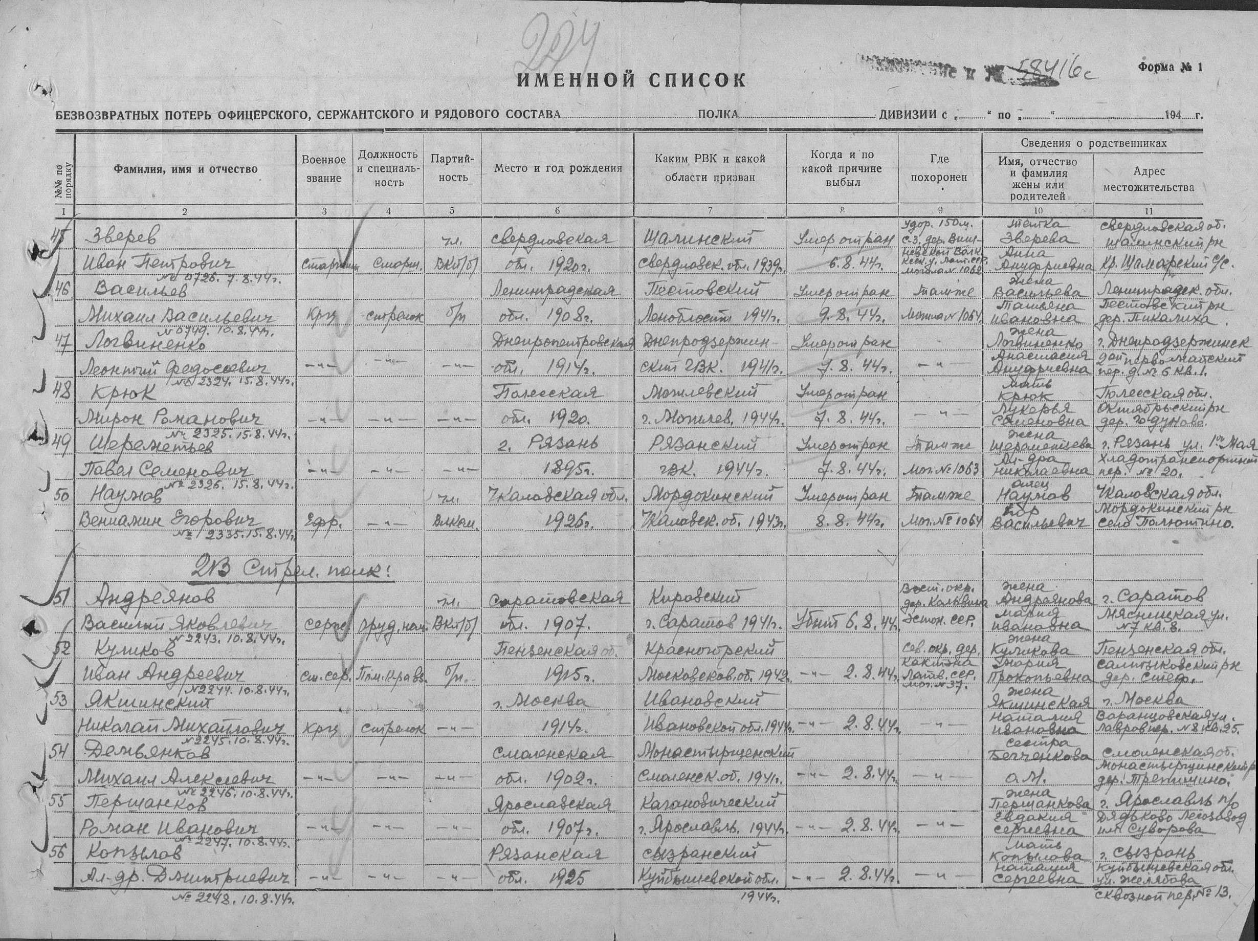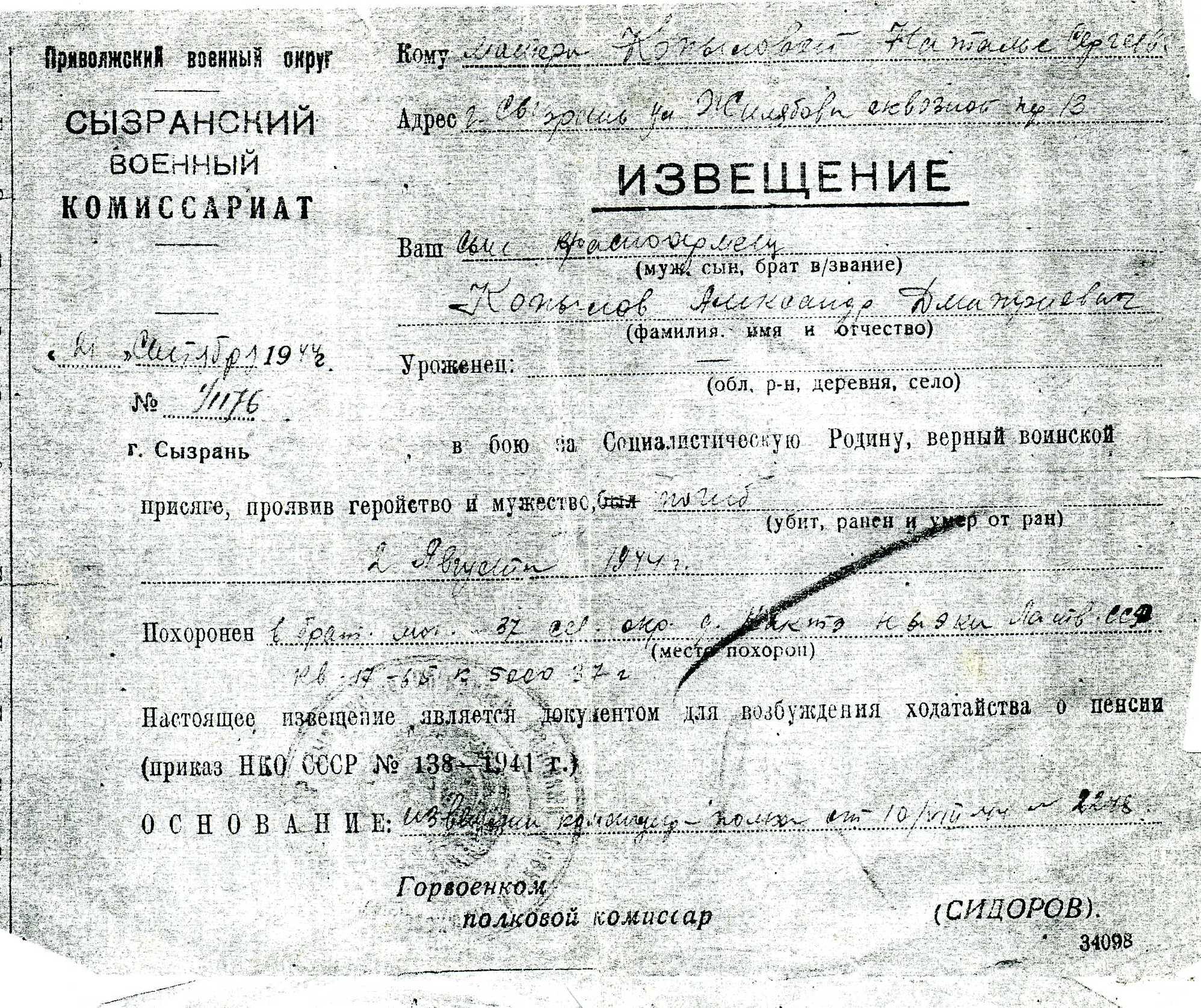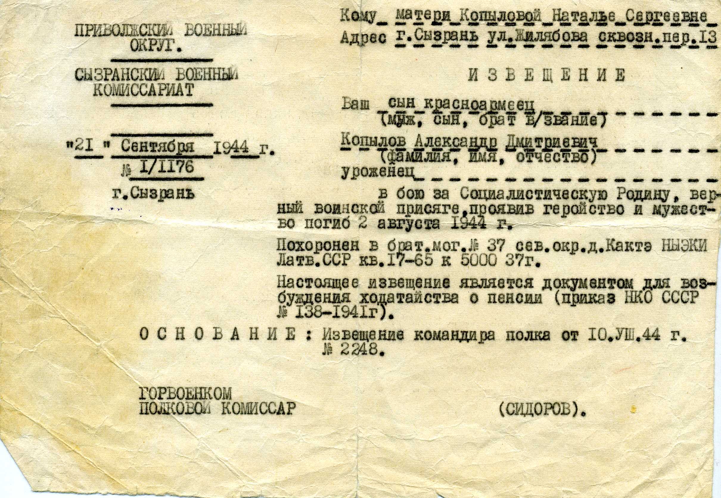Погиб 2 августа 1944 г. Похоронен в братской могиле № 37 сев. окр. д. Кактэ НЫЭКИ Латвийской ССР кв. 17-65 к 5000 37 г.