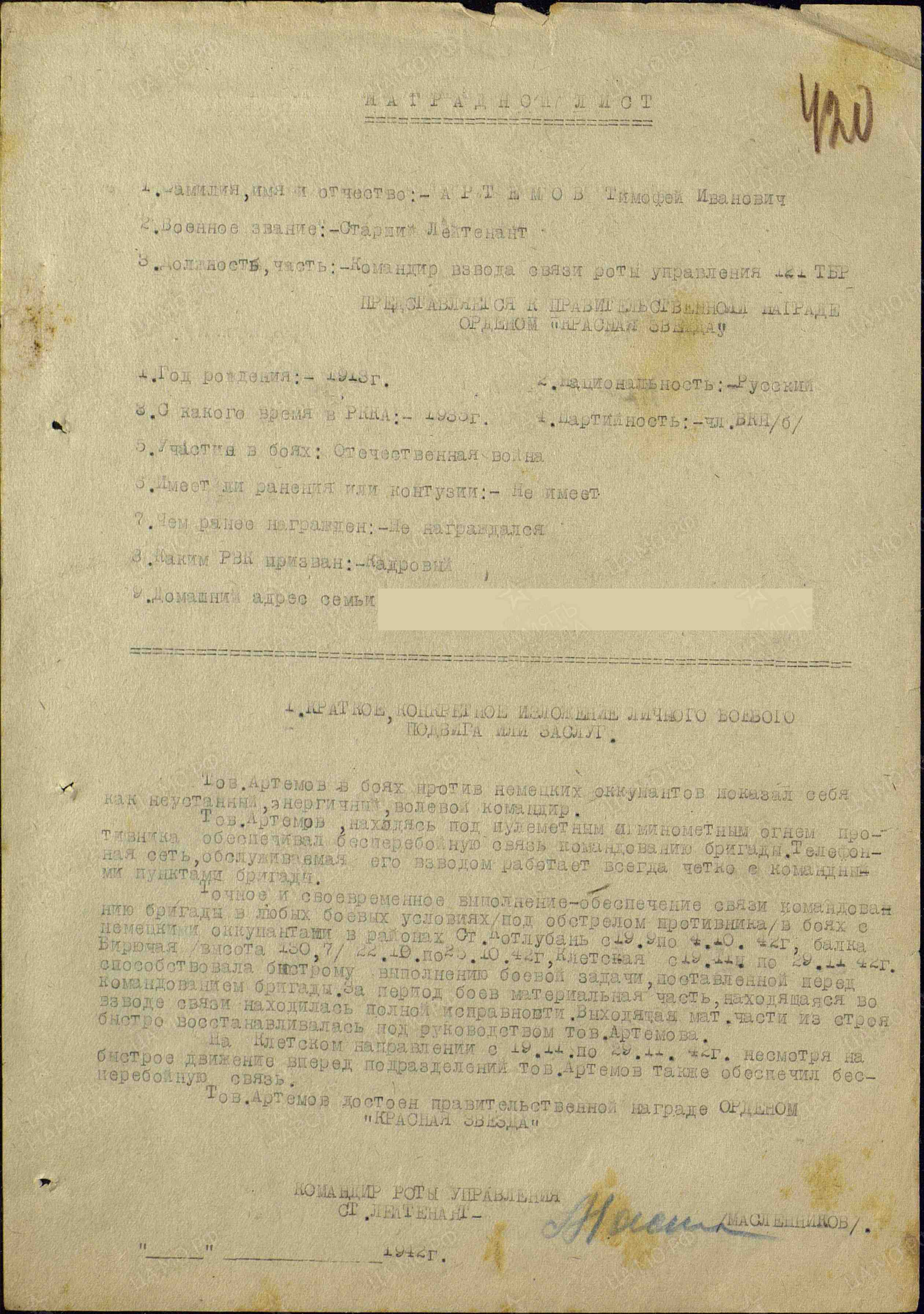 Тов. Артемов в боях против немецких оккупантов проявил себя как неустанный, энергичный, волевой командир. Тов. Артемов, находясь под пулеметным и минометным огнем противника обеспечивал бесперебойную связь командованию бригады. Телефонная сеть, обслуживаемая его взводом, всегда работает четко с командными пунктами бригады. Точное и своевременное выполнение обеспечения связи командованию бригады в любых боевых условиях, под обстрелом противника, в боях с немецкими оккупантами в районах ст. Котлубань с 19 сентября по 4 октября 1942 г., балка Вирючая (высота 130,7) с 22 по 25 октября 1942 г., ст. Клетская с 19 по 29 ноября 1942 г. способствовала быстрому выполнению боевой задачи, поставленной перед командованием бригады. За период боев материальная часть, находящаяся на заводе связи, была в полной исправности. Выходящая из строя матчасть быстро восстанавливалась под руководством тов. Артемова. На Клетском направлении с 19 по 29 ноября 1942 г., несмотря на быстрое движение подразделений вперед, тов. Артемов также обеспечил бесперебойную связь. Тов. Артемов достоин правительственной награды – ордена Красной Звезды» (наградной лист от 09.12.1942 г.).