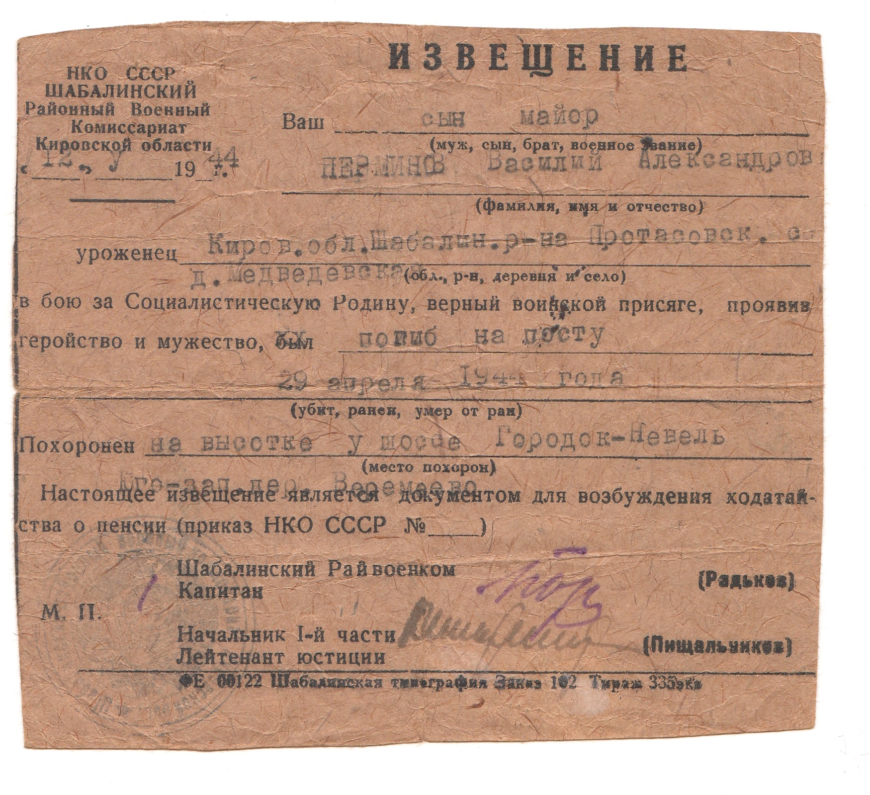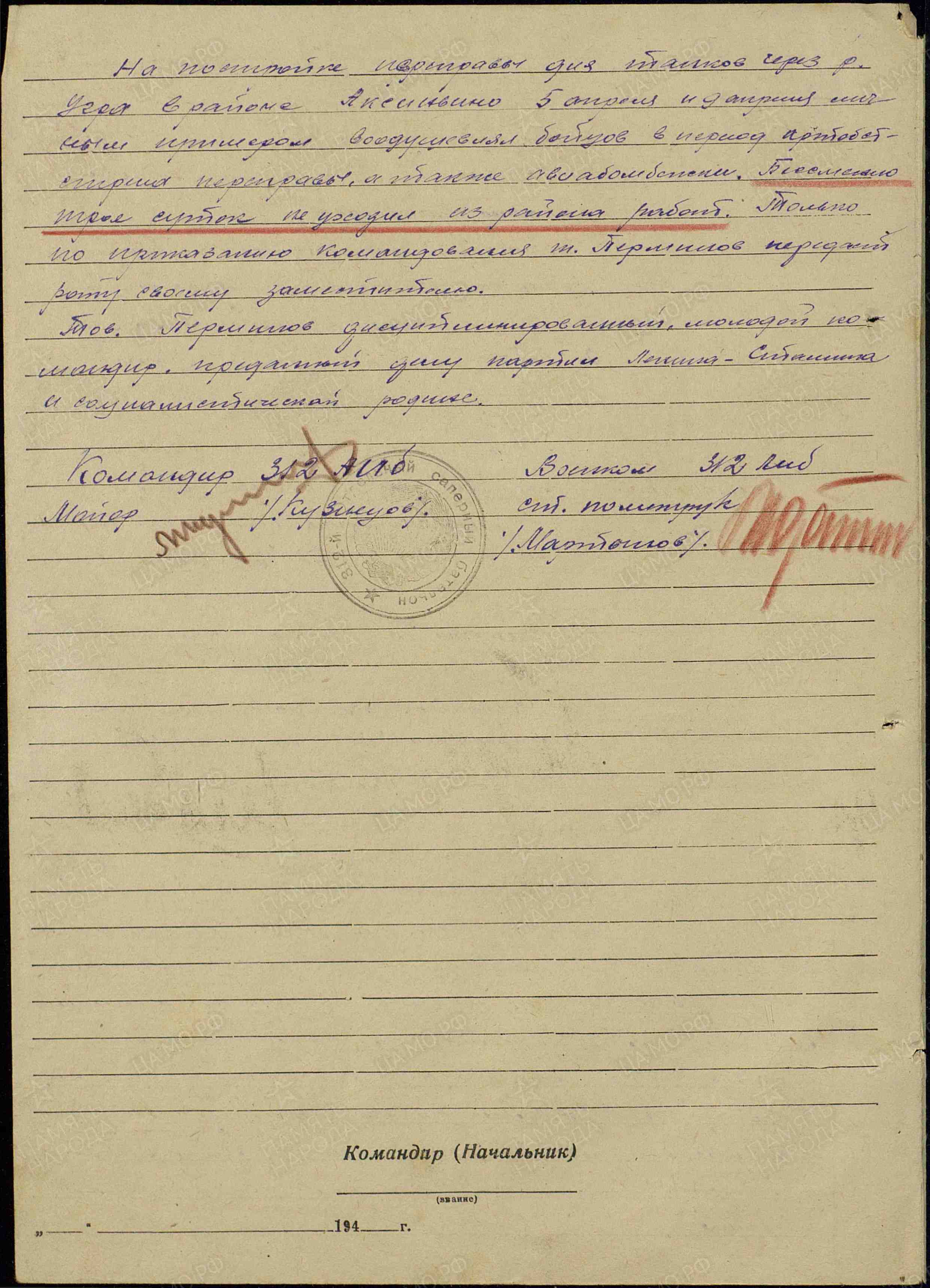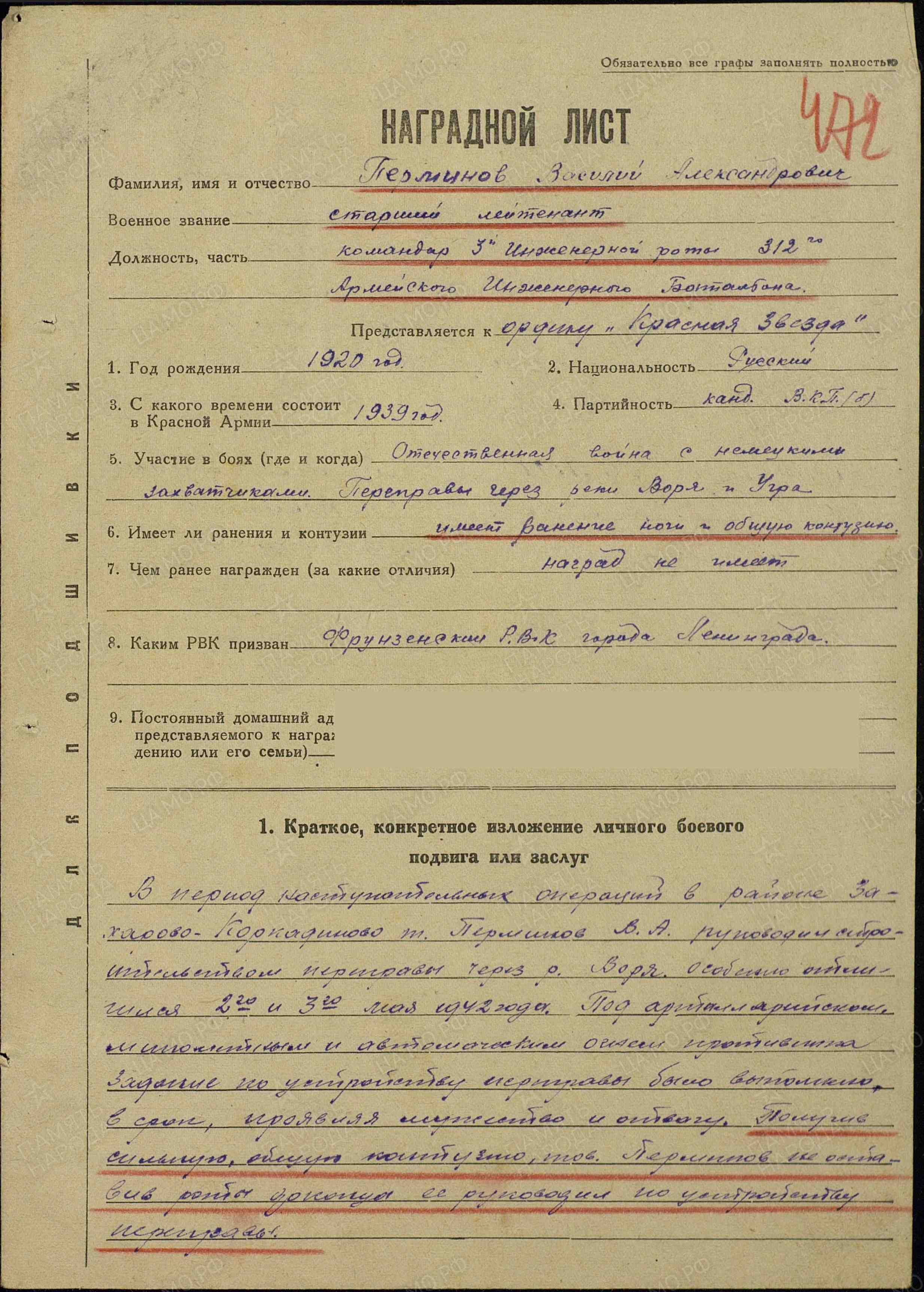 В период наступательных операций в районе Захарово – Коркадиново тов. Перминов В.А. руководил строительством переправы через р. Воря. Особенно отличился 2-3 мая 1942 г. Под артиллерийским, минометным и автоматным огнем противника задание по устройству переправы было выполнено в срок. Получив сильную общую контузию, тов. Перминов, не оставив роты, руководил ей до окончания устройства переправы. На постройке переправы через р. Угра в районе Аксиньино 5 и 9 апреля 1942 г. личным примером воодушевлял бойцов в период артобстрела и авиабомбежки переправы. Бессменно трое суток не уходил из района работ. Только по приказанию командования тов. Перминов передал роту своему заместителю. Тов. Перминов дисциплинированный молодой командир, преданный делу партии Ленина-Сталина и Социалистической Родине. Достоин правительственной награды – медали «За отвагу» (наградной лист от 31.05.1942 г.).