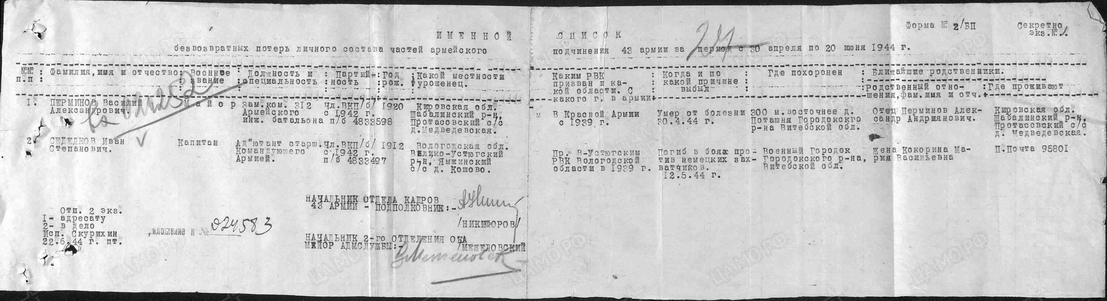 Капитан Перминов В.А., командир роты, приданной 105-му танковому полку, обеспечил выполнение боевого задания: по устройству под огнем противника проходов для танков в немецких минных полях на направлениях Большие Толкачи – Загобезье, Большие Толкачи – Ивошино и Дурнево – Логи. Снято и обезврежено 557 мин и 27 фугасов; по сопровождению танков во время боя. Рота, находясь с танками, систематически выдвигалась впереди танков, останавливающимися за боевыми порядками пехоты перед встречающимися преградами – обеспечила проход танков без потерь на минных полях противника; по устранению встречающихся танкам преград – засыпан ряд траншей и снято до 400 мин; по эвакуации с поля боя подбитых противником танков; по разминированию резервными группами минеров для обеспечения атаки пехоты мин и сюрпризов в траншеях, блиндажах и землянках противника. Снято 175 мин и сюрпризов. Капитан Перминов мужественно и умело руководил ротой. Во время контратаки противника, заняв оборону со своей ротой, вместе с пехотой отразил атаку противника. Капитан Перминов достоин правительственной награды – ордена Красного Знамени (наградной лист от 1.09.1943 г.).