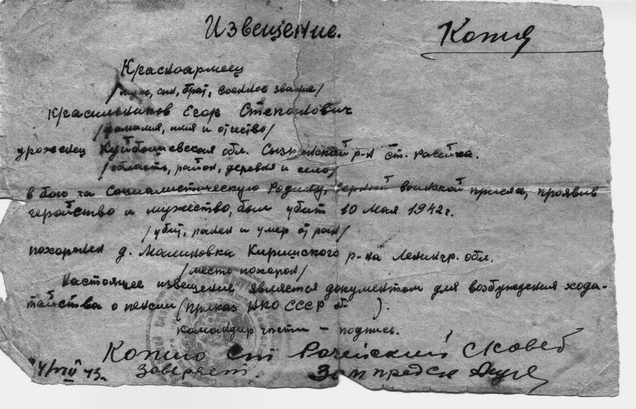 Родился в 1914 г. в с. Старая Рачейка Сызранского района Куйбышевской области. Кнасноармеец Егор Степанович Красильников убит в бою 10 мая 1942 г. Похоронен в д. Малиновка Киришского района Ленинградской области.