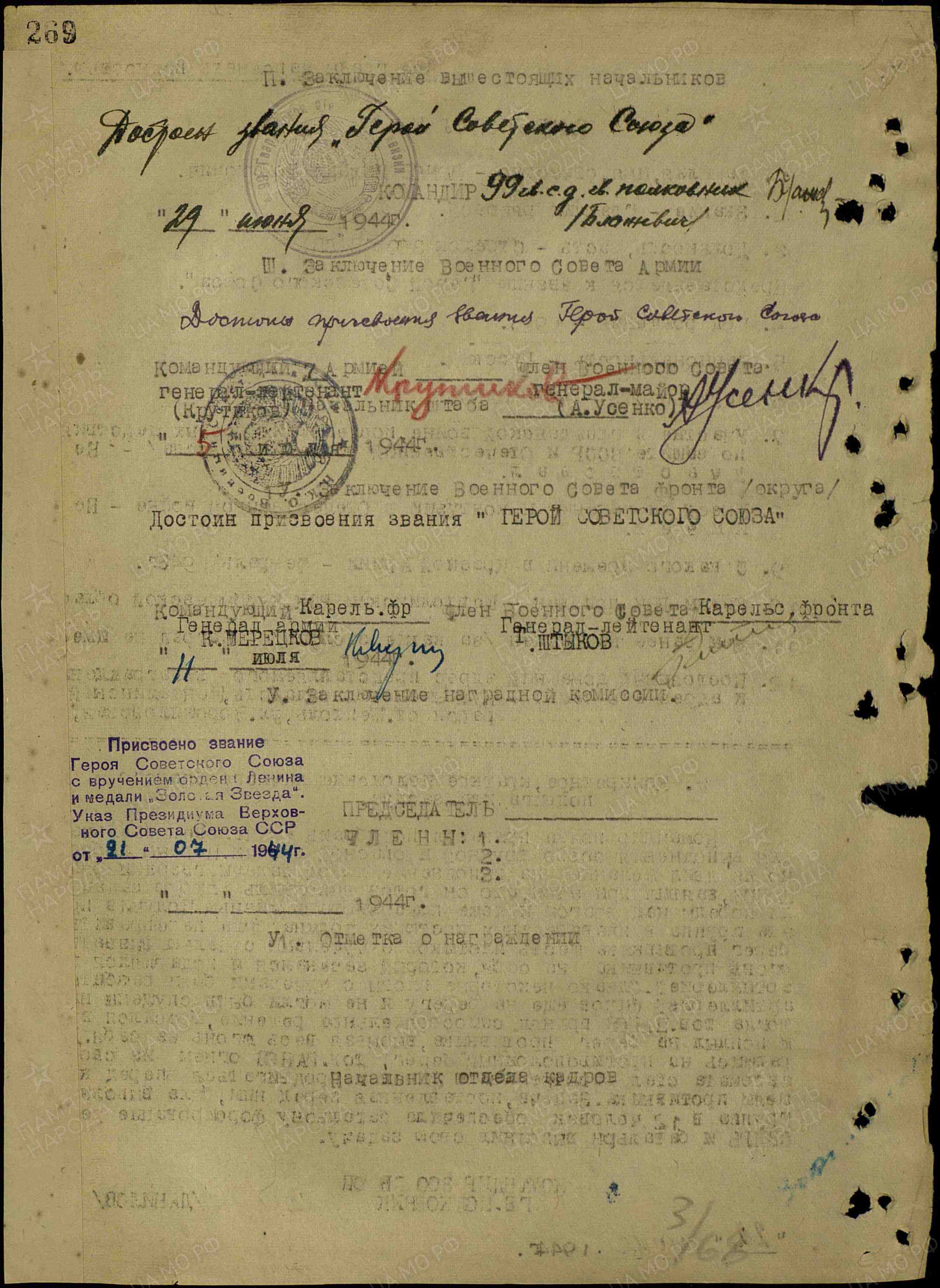 Информация из Наградного листа: Командир полка приказал подобрать 12 человек смельчаков для выполнения особо трудной и опасной задачи. Первым добровольно изъявил желание на выполнение любой задачи гвардии рядовой Попов, который заявил при этом, что он готов выполнить любую задачу ради победы над врагом и даже пожертвовать жизнью. Получив приказ, группа в плавательных костюмах должна была переправить на берег противника шесть плотиков с чучелами с целью вызвать огонь противника на себя, который бы засекался и подавлялся нашей артиллерией. Однако некоторые плоты с чучелами были разбиты артиллерией финнов еще на берегу и не могли быть спущены на воду. Тогда тов. Попов принял решение, бросился в воду и поплыл на берег противника, вызывая весь огонь на себя. Добравшись на противо-положный берег, тов. Попов огнем из своего автомата стал расстреливать финнов и продвигаться вперед к траншеям. Задача, поставленная перед ним, была выполнена. Группа из 12 человек обеспечила батальону форсирование реки Свирь и батальон свою задачу выполнил. Достоин присвоения звания Героя Советского Союза (наградной лист от 21.07.1944 г.).