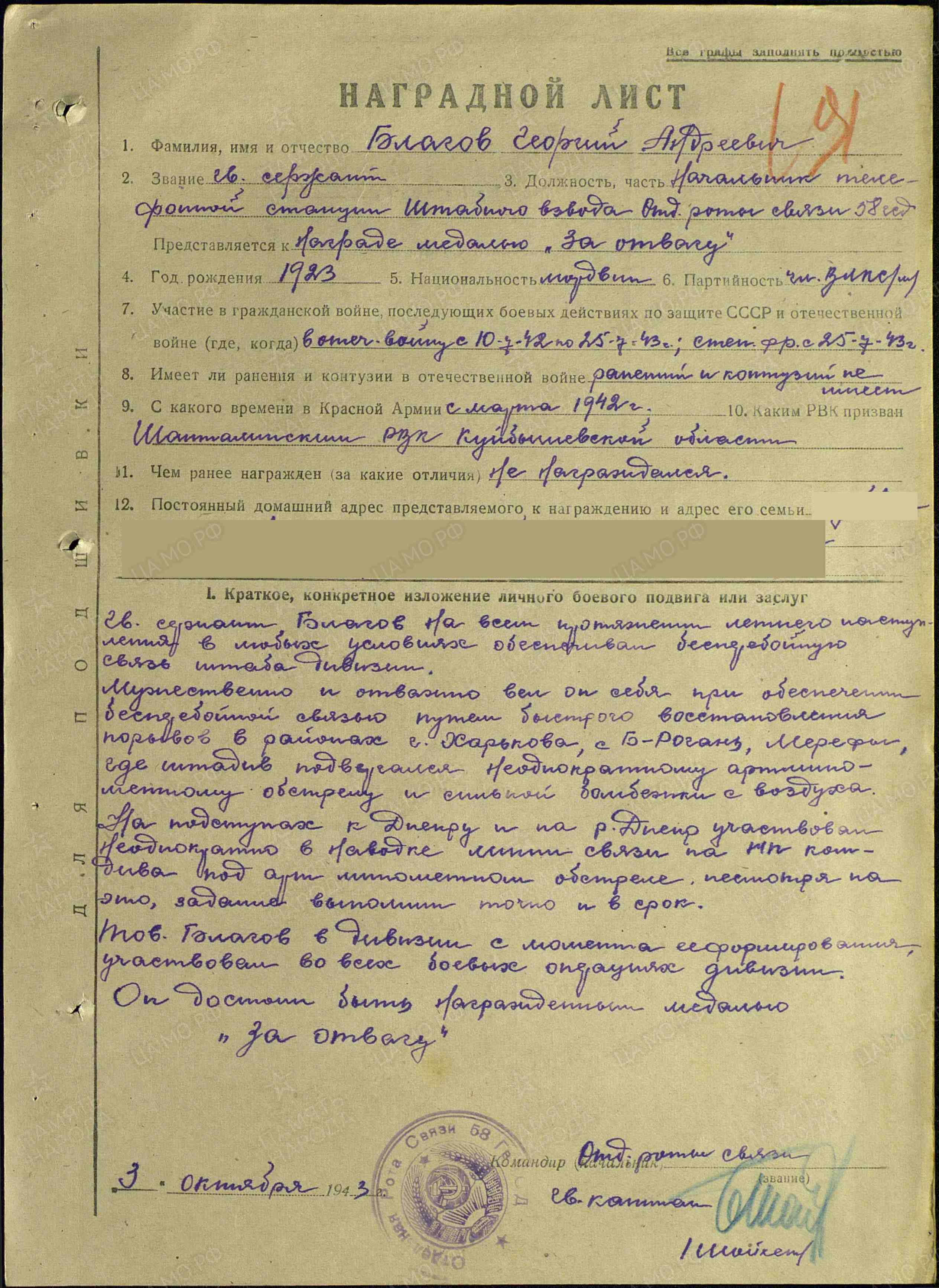 Гвардии сержант Благов на всем протяжении летнего наступления в любых условиях обеспечивал бесперебойную связь штаба дивизии. Мужественно и отважно вел себя при обеспечении бесперебойной связью путем быстрого восстановления порывов в районе г. Харьков, с. Большая Рогань, г. Мерефа, где штаб дивизии подвергался неоднократному минометно-артиллерийскому обстрелу и бомбежке с воздуха. На подступах к Днепру и на р. Днепр неоднократно участвовал в наводке линии связи на наблюдательный пункт комдива под артиллерийско-минометным обстрелом. Несмотря на это, задание выполнил точно и в срок. Тов. Благов в дивизии с момента формирования, участвовал во всех боевых операциях. Достоин награждения медалью «За отвагу» (наградной лист от 3.10.1943 г.).