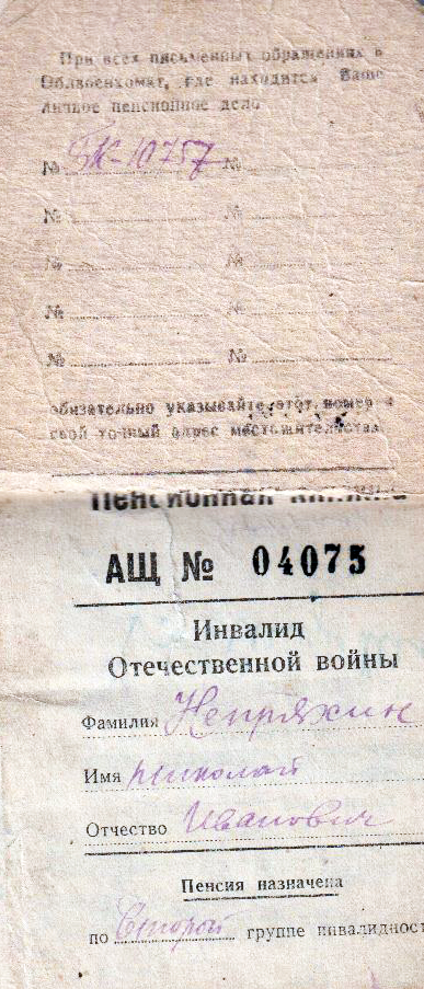 В декабре 1943 г. Николай Иванович в первый раз был ранен. 4 апреля 1944 г. ранен вторично. После ампутации правой голени в ноябре 1944 г. был комиссован из армии инвалидом Отечественной войны.